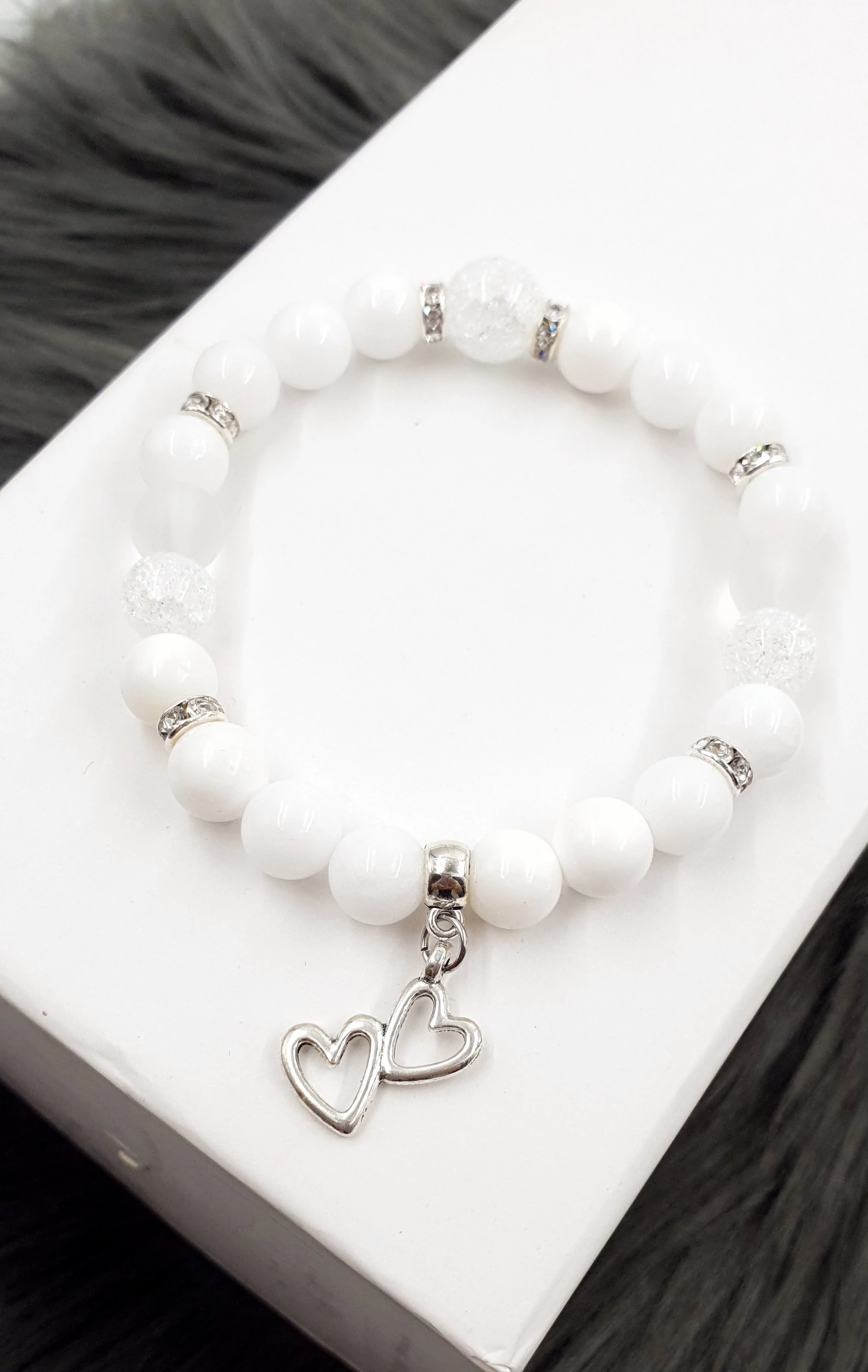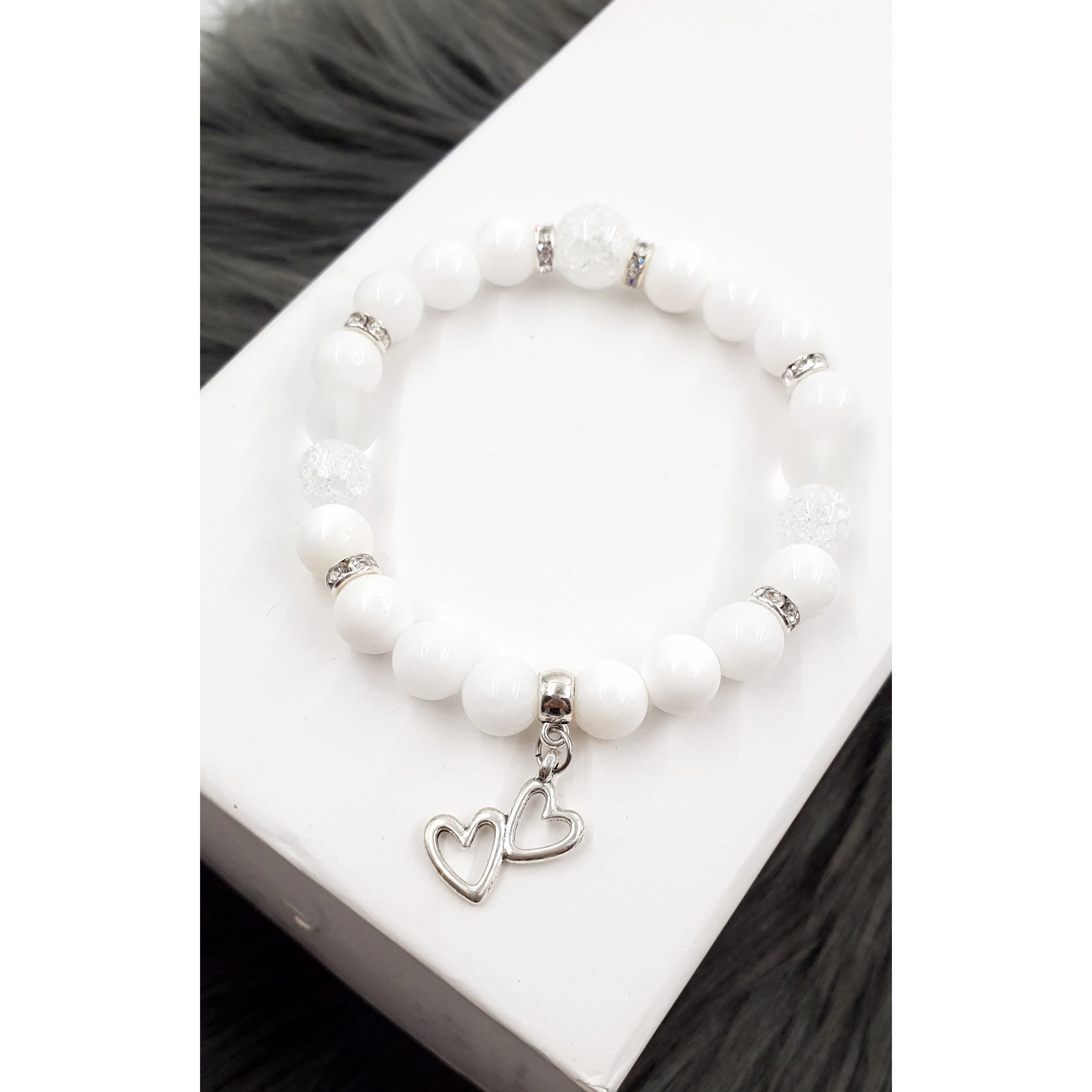 Gyönyörű csiszolt, 8mm átmérőjű Hófehér kristálykarkötő dupla szivecske medállal.