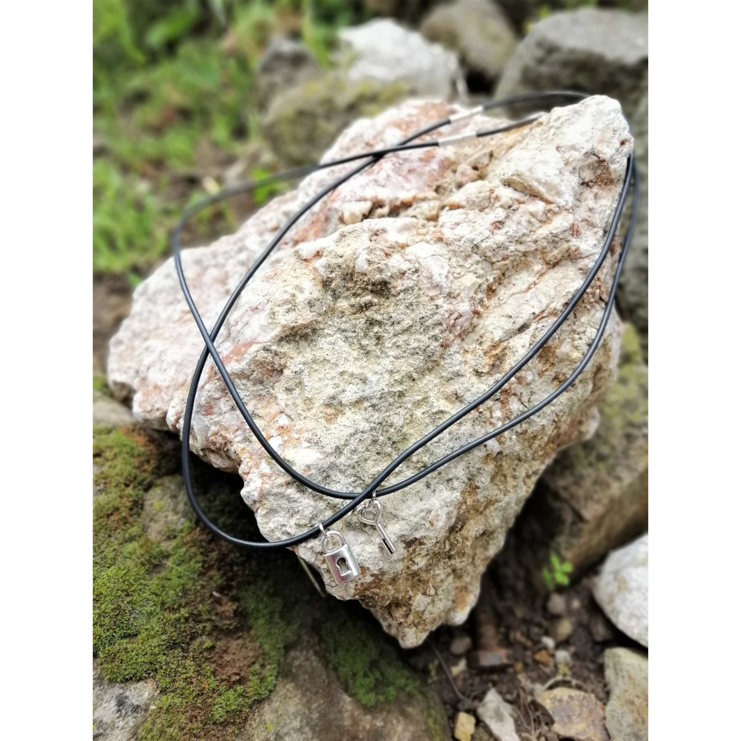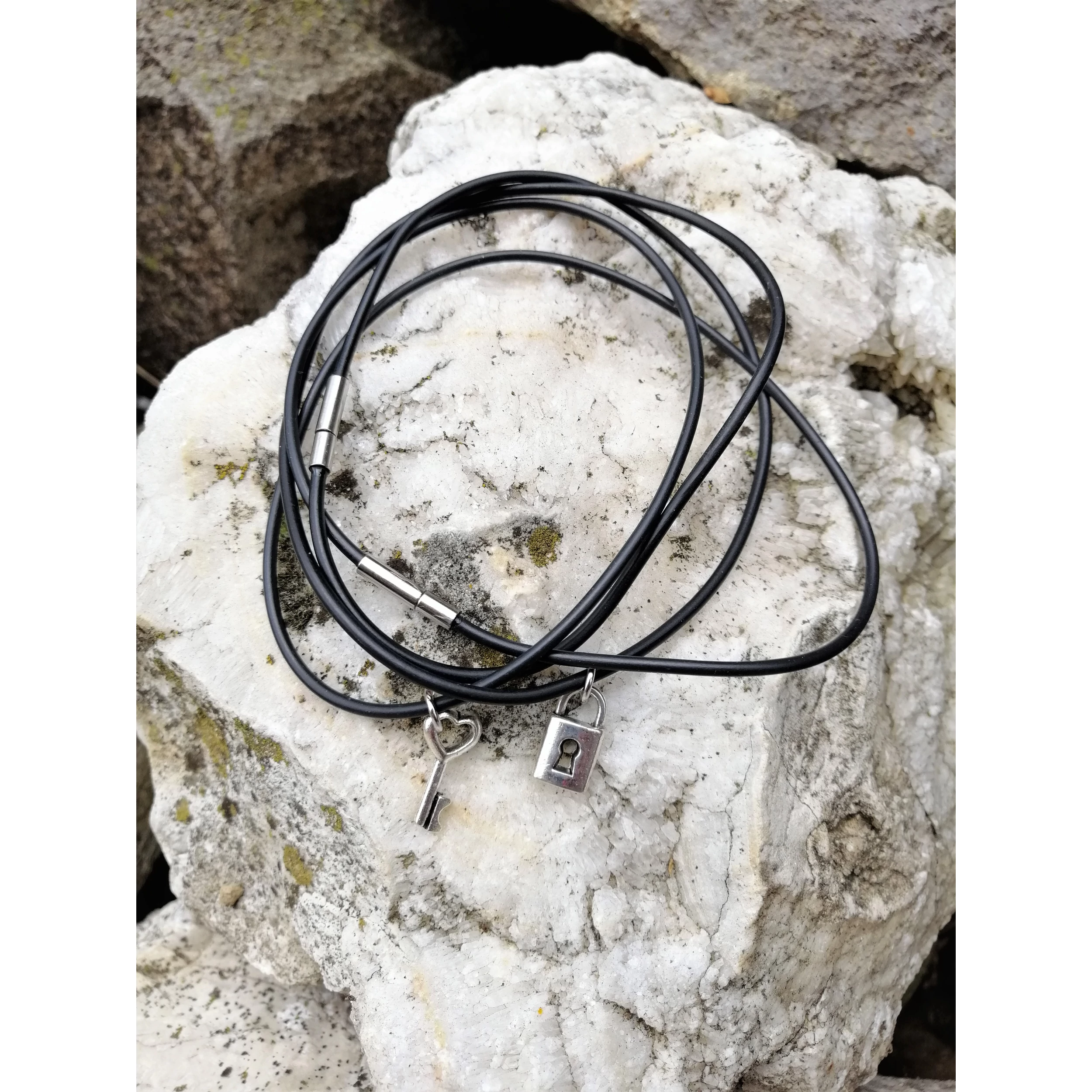 Lakat-kulcs medállal díszített kaucsuk nyakláncpár, mely kifejezi az egymás iránt érzett kötelek és az összetartozást.