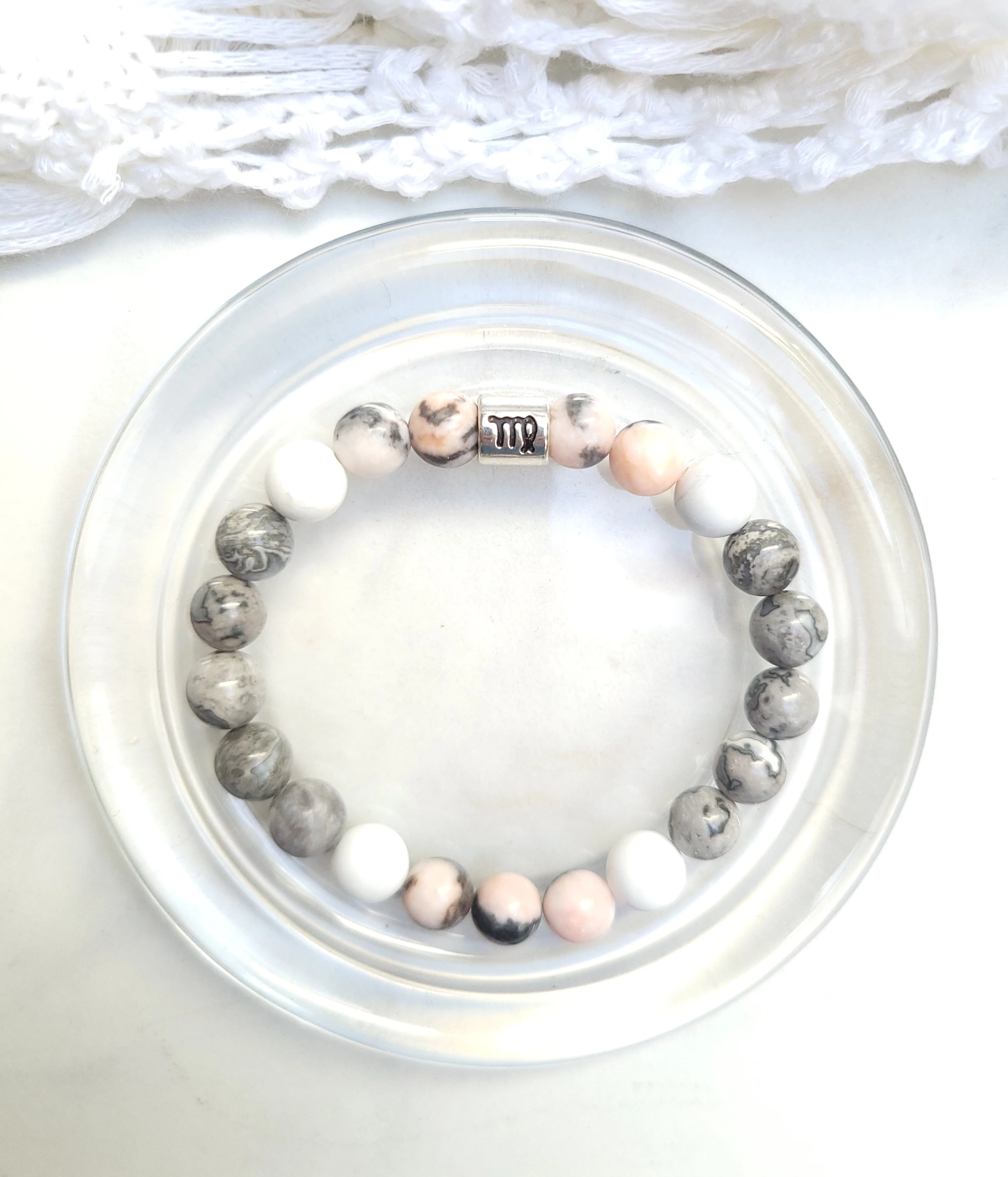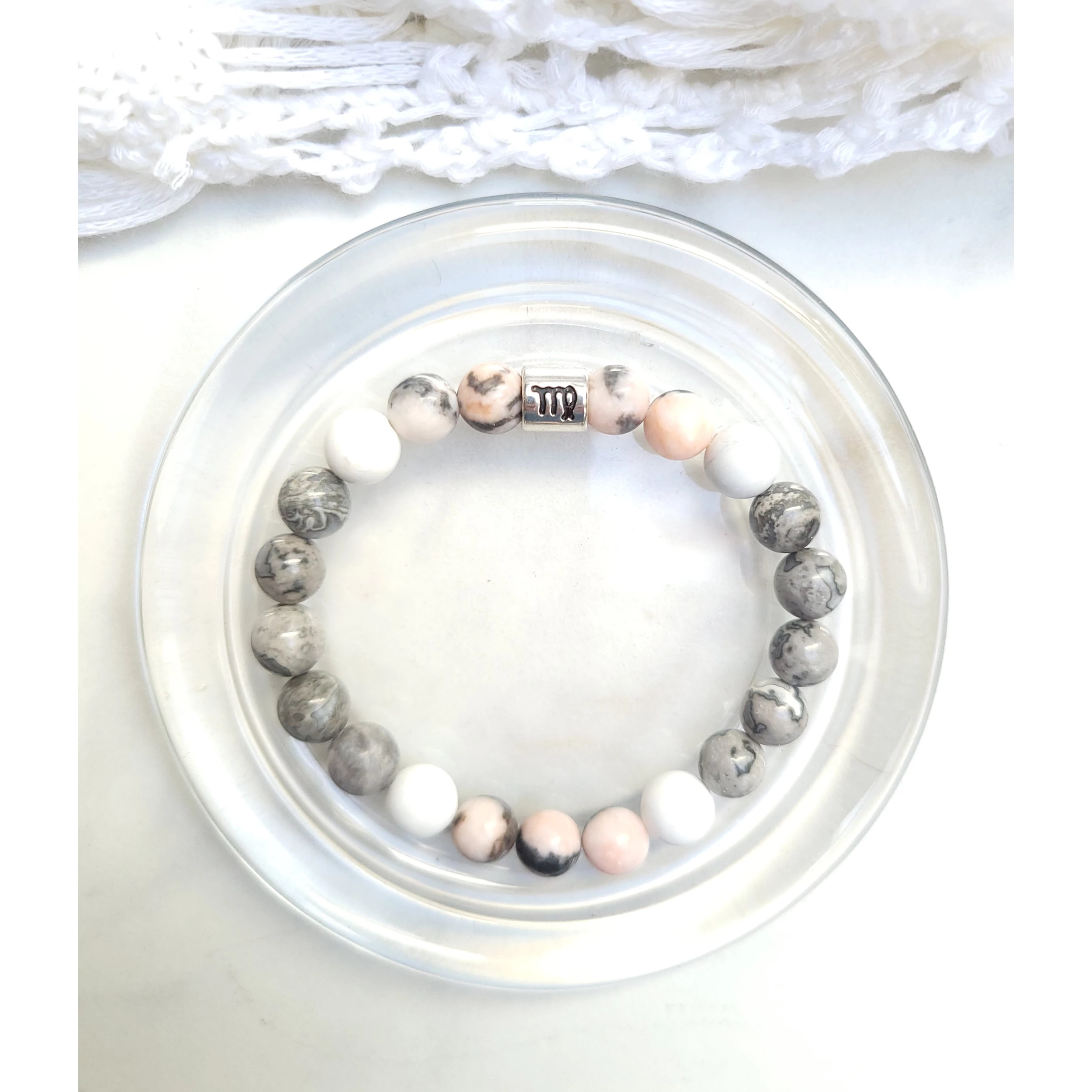 Yvonne Design horoszkópos ásványkarkötő a szűz ásványaiból készítve:  jáspis és howlit a szűz csillagjegy jelképével.