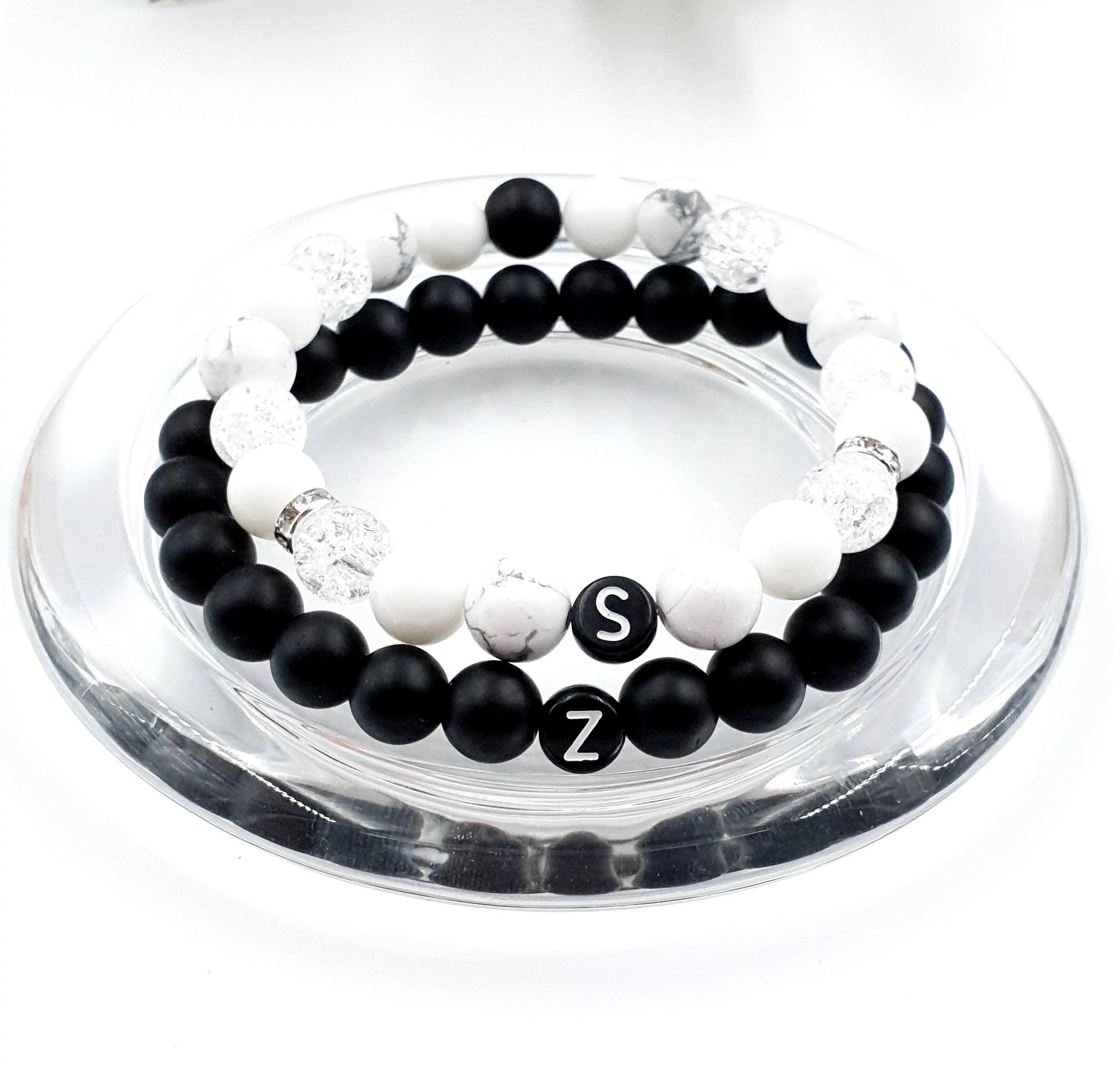 Gyönyörű egyedi karkötőpár 8 mm ónix és howlit ásványgyöngyökből készítve, és a karkötőkön egy-egy betű található a nevetek kezdőbetűjével. Ez a karkötőpár az összetartozást szimbolizálja. Az ár egy pár (2db) karkötőre vonatkozik.