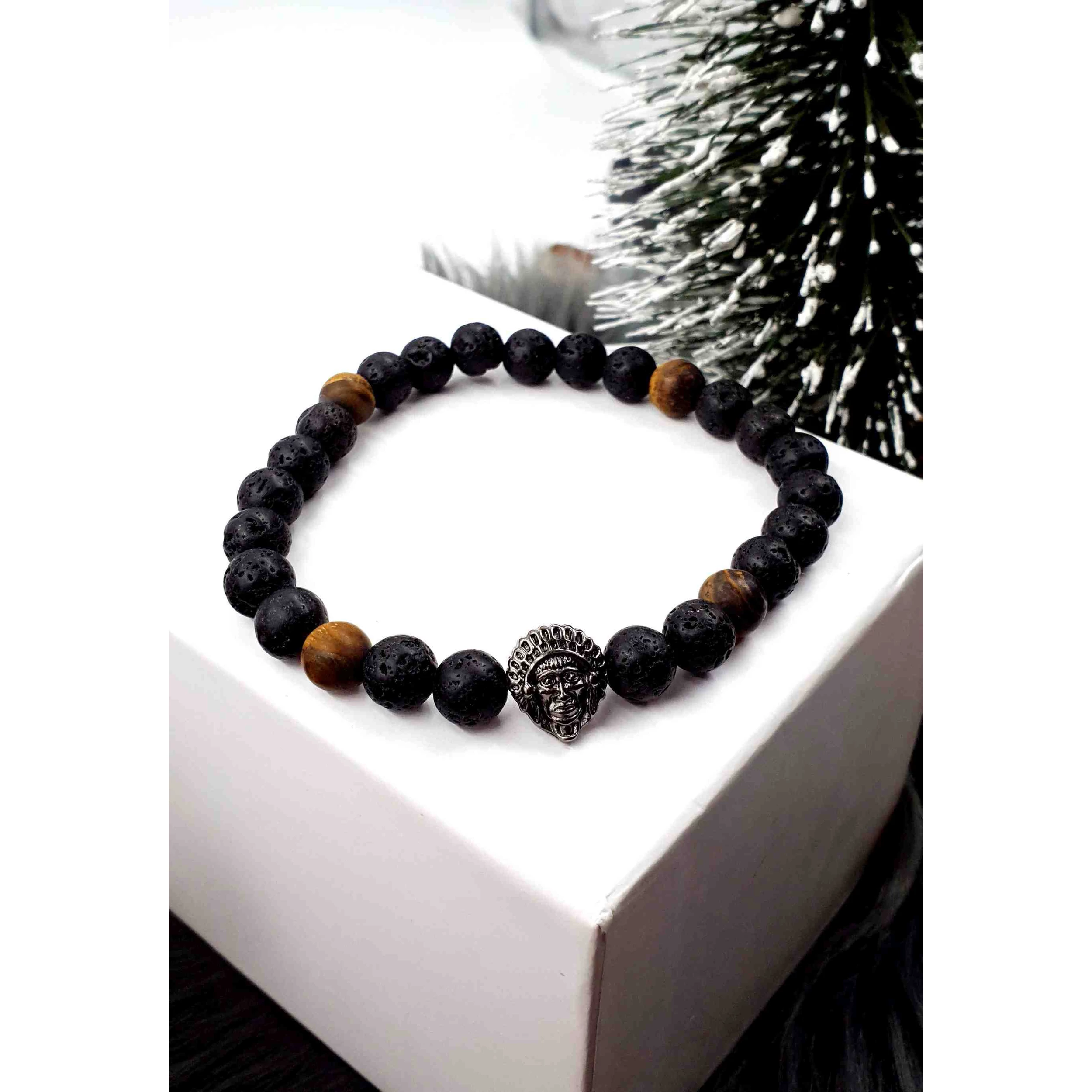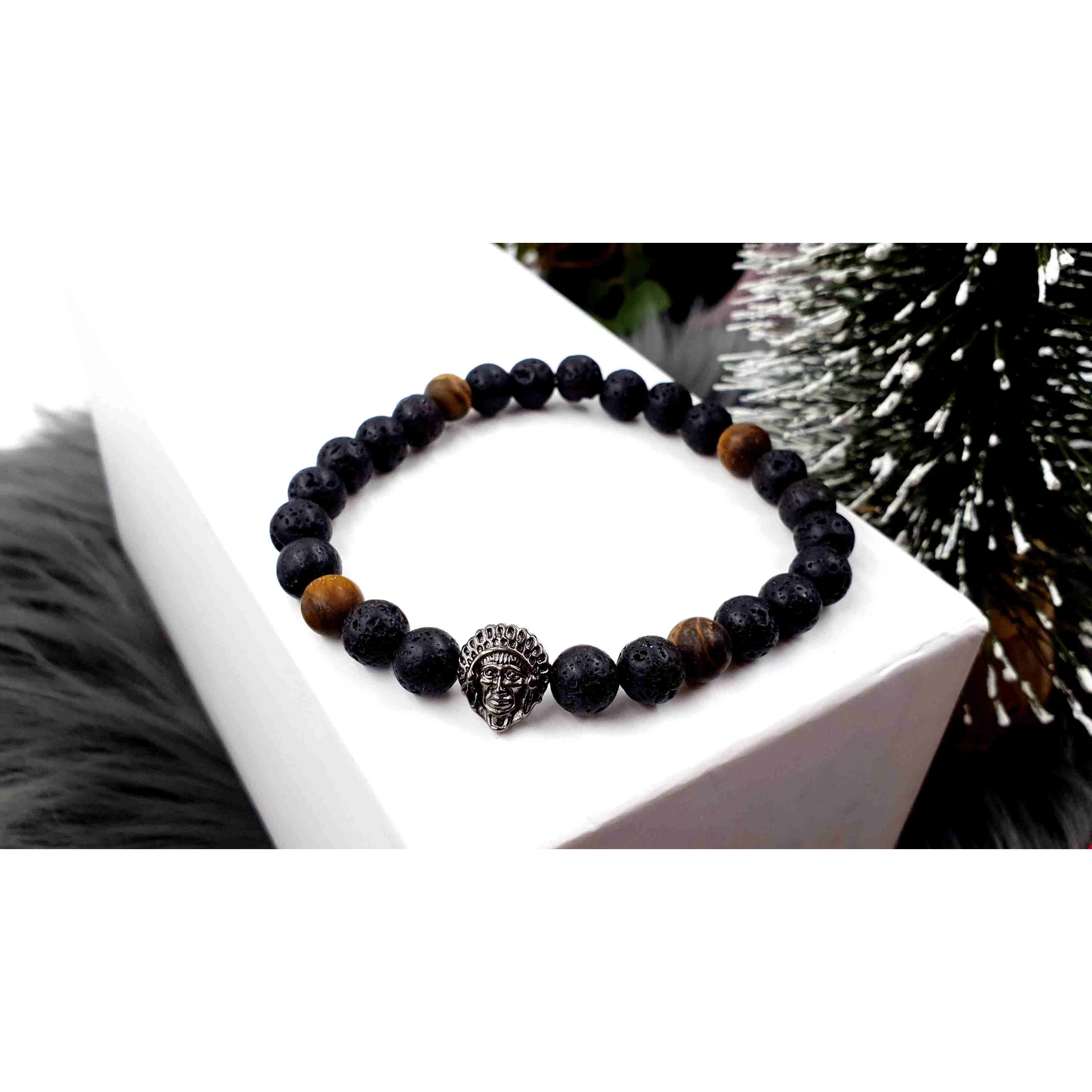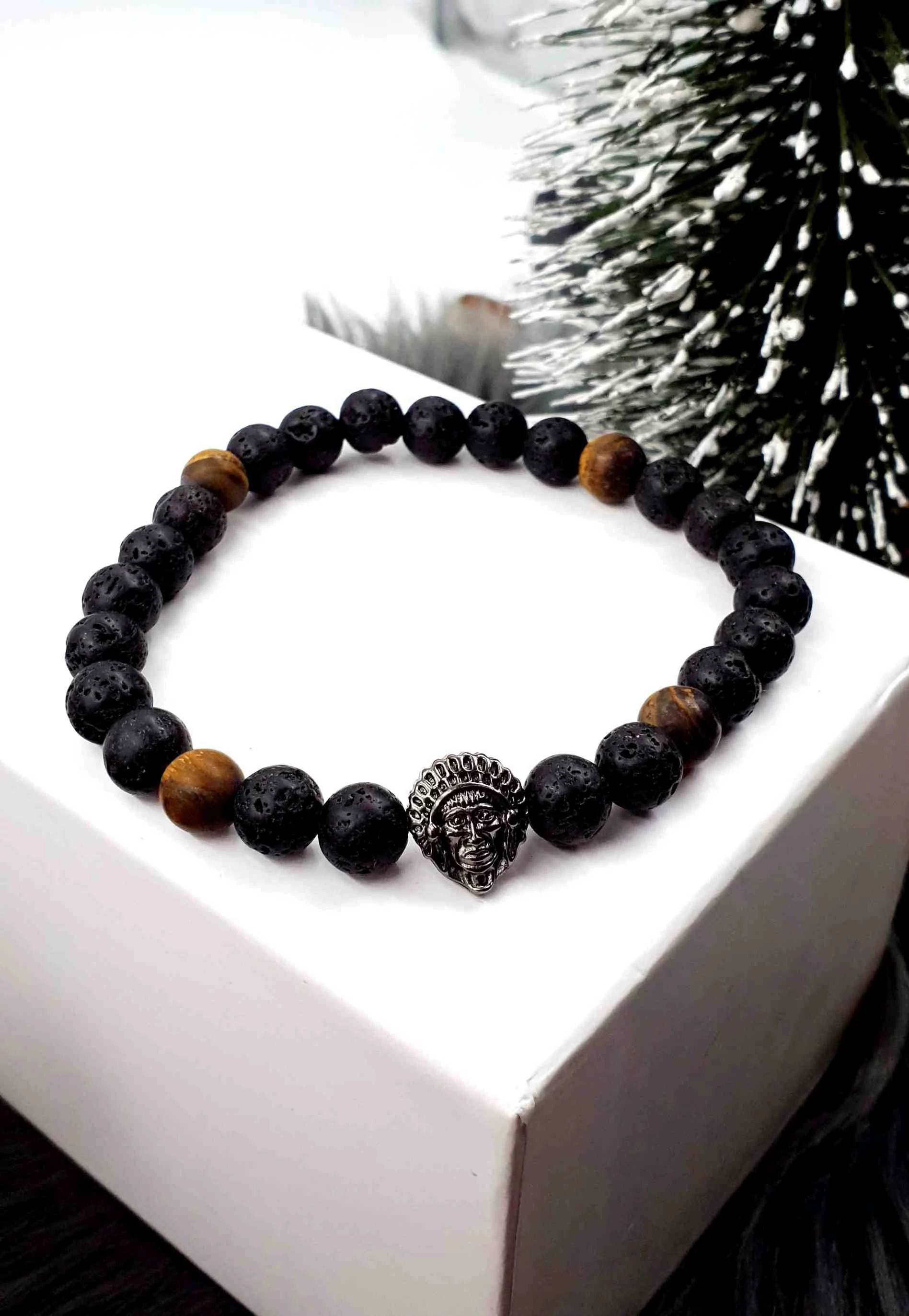 Ezt az álomszép Indián fej ásványkarkötő lávakő és matt tigrisszem ásványokból készítve.