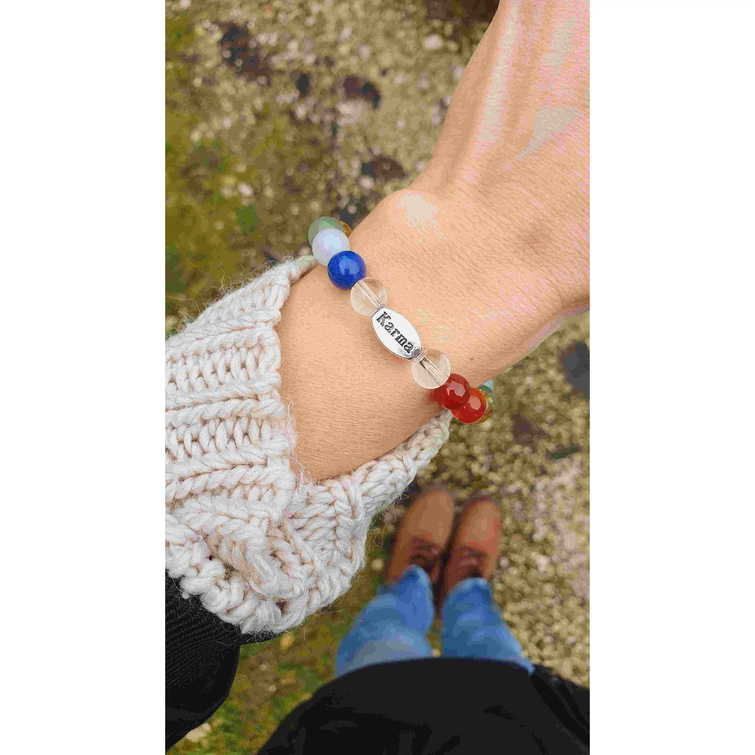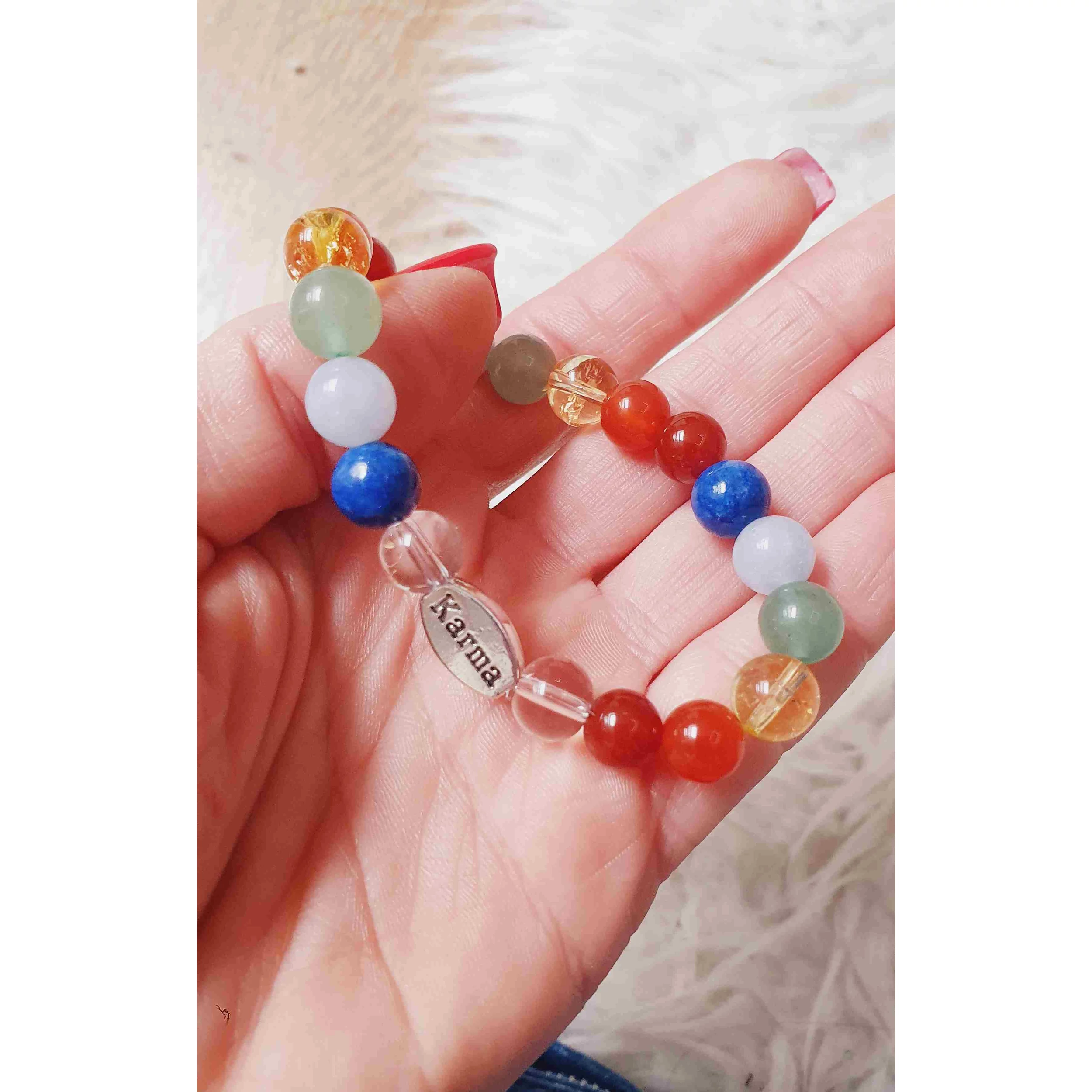 Karma feliratos gyönyörű csiszolt, 8mm átmérőjű ásványgyöngyökből készített karkötő. A karkötő ásványai: aventurin, hegyikristály, lazurit, citrin, karneol, achát, kék kvarc