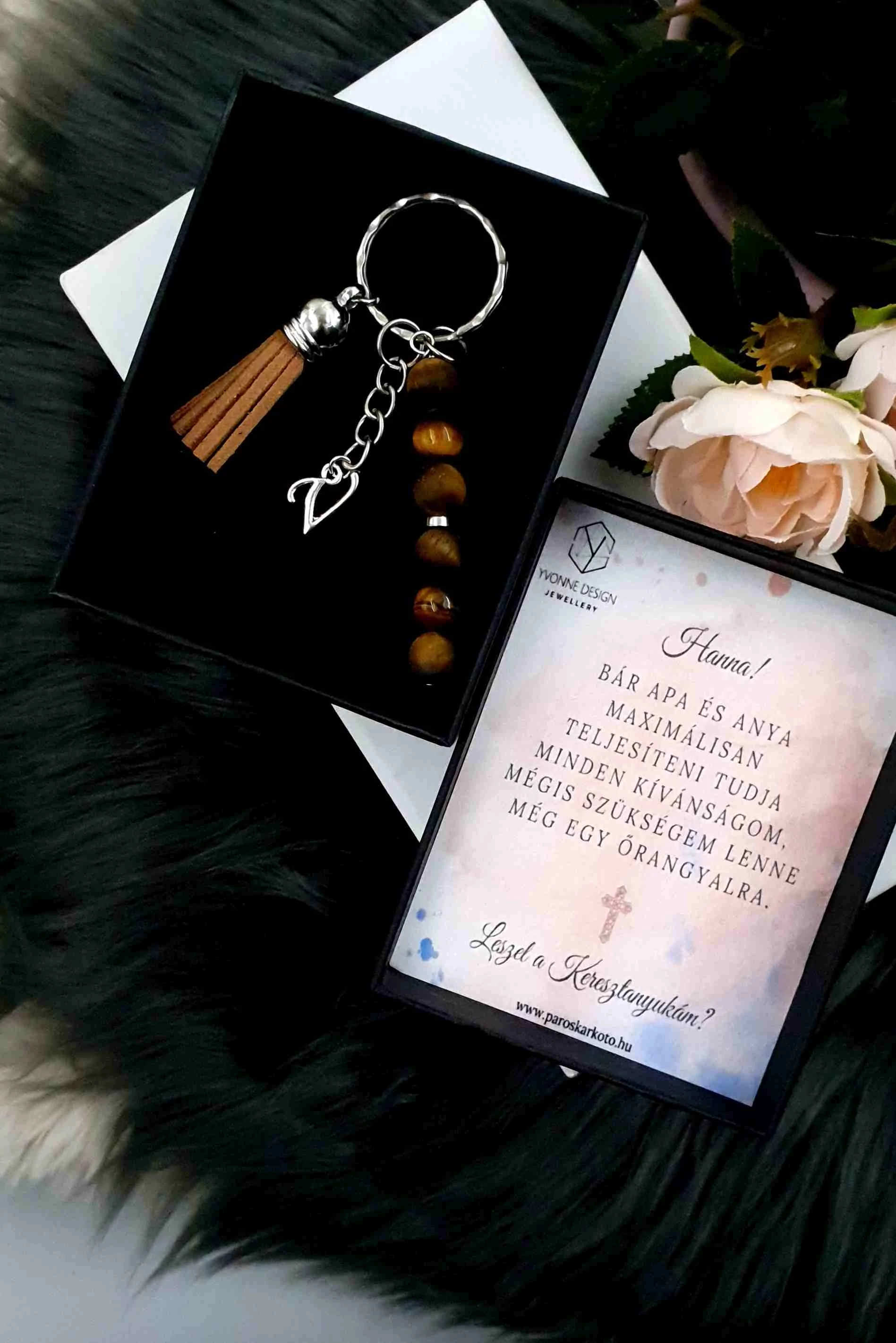 Keresztszülő felkérő díszdobozos  kulcstartó  személyre szabottan egyedi üzenettel. A kulcstartó 8 mm -es  tigrisszem ásványokból lettek készítve, és tartalmaz még egy betűmedált,  és egy bojtot. Az ajándékszett része a kulcstartó, a díszdoboz, illetve a doboz belsejében található személyes üzenet, melyet te tudsz nekünk megadni a vásárlási folyamat végén a megjegyzés rovatban (Pénztár/Összegzés menüpontban). Amennyiben változtatni szeretnél az üzeneten,  kérlek  idézőjelben add meg nekünk, hogy egyértelmű legyen számunkra, mit szeretnél látni a díszdoboz belsejében! Ez a szívhez szóló személyes ajándékot Te teszed különlegessé a személyes üzeneteddel, egészen biztos, hogy sikert arat és örök élmény marad!