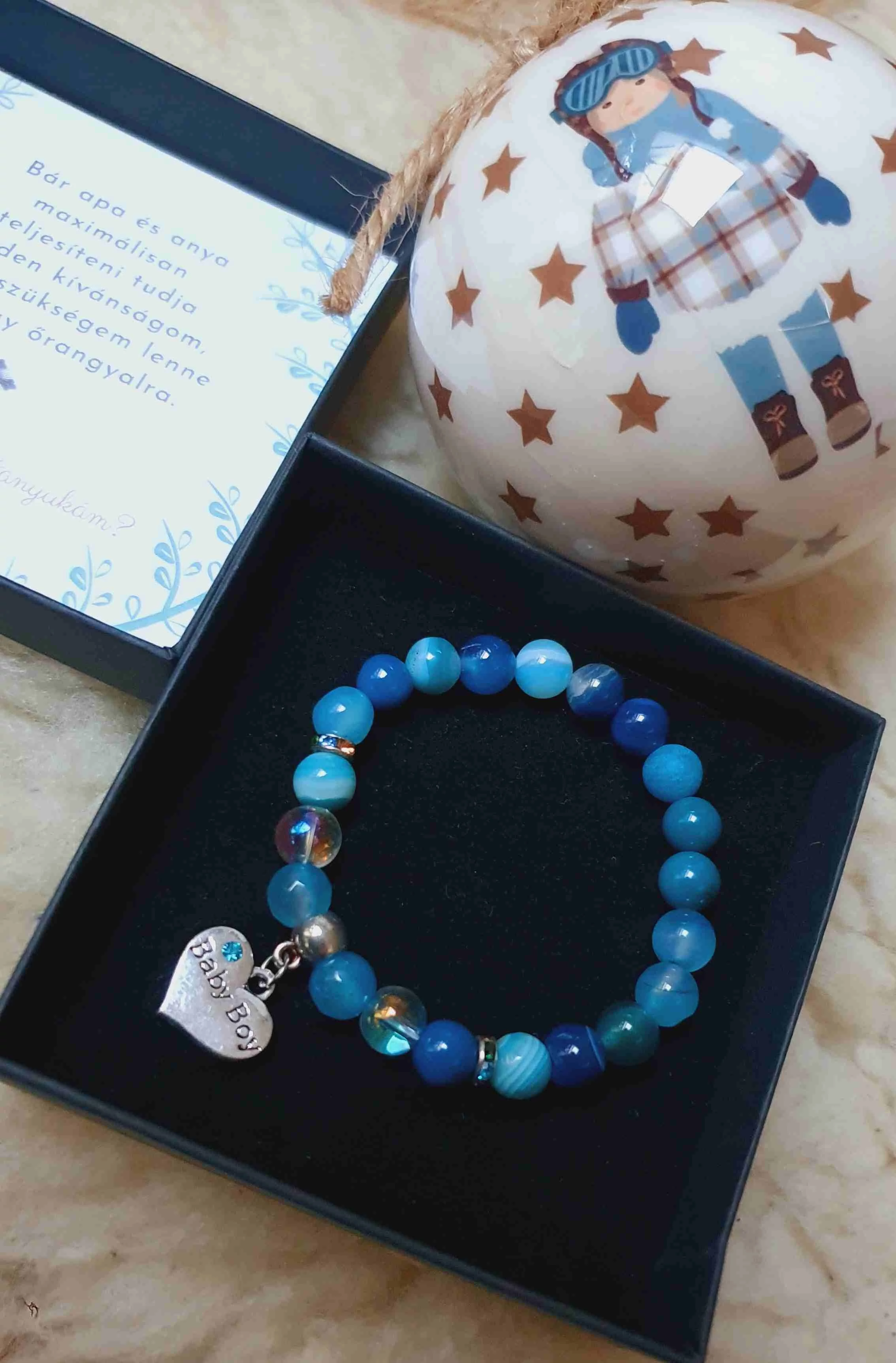 Keresztszülő felkérő díszdobozos  ásvány kulcstartó  személyre szabottan egyedi üzenettel. A karkötő 8 mm -es  ásványokból lettek készítve és tartalmaz egy kristályos szívecske medált is.