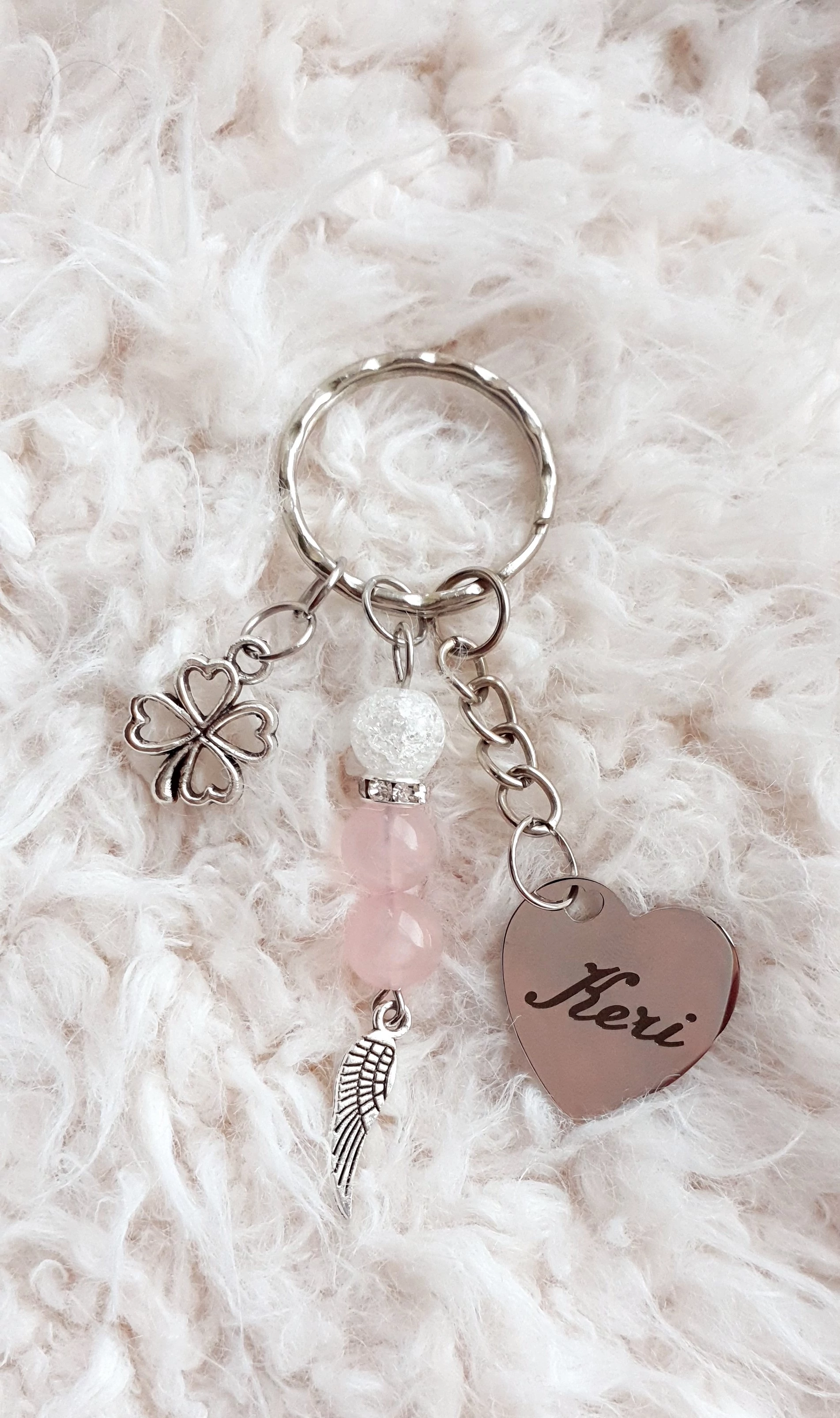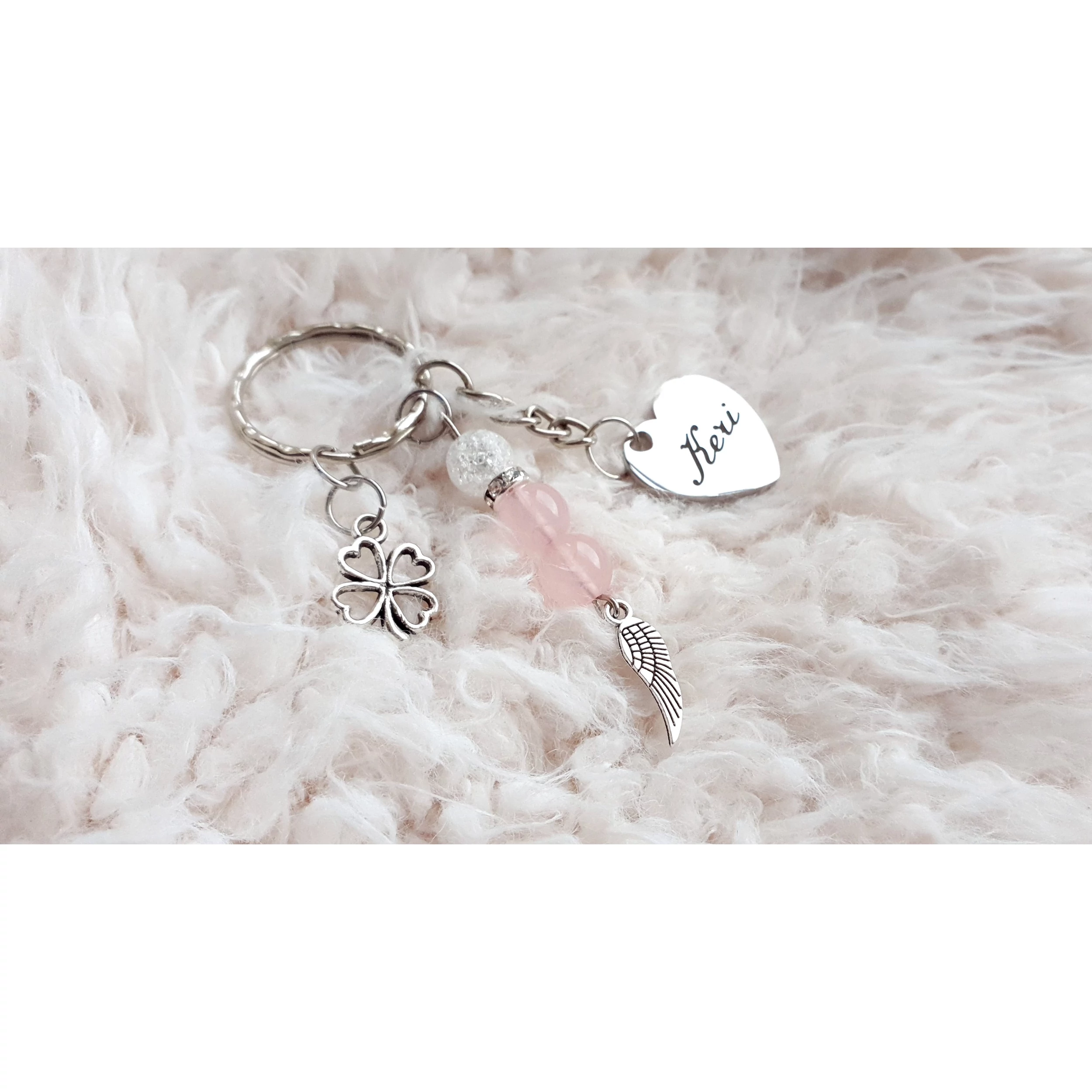 Keri feliratos gravírozott kulcstartó, mely még tartalmaz egy védelmező angyalszárny medálkát is, illetve robbantott hegyikristály és rózsakvarc ásványgyöngyös díszt, és egy négylevelű lóhere medálkát is.