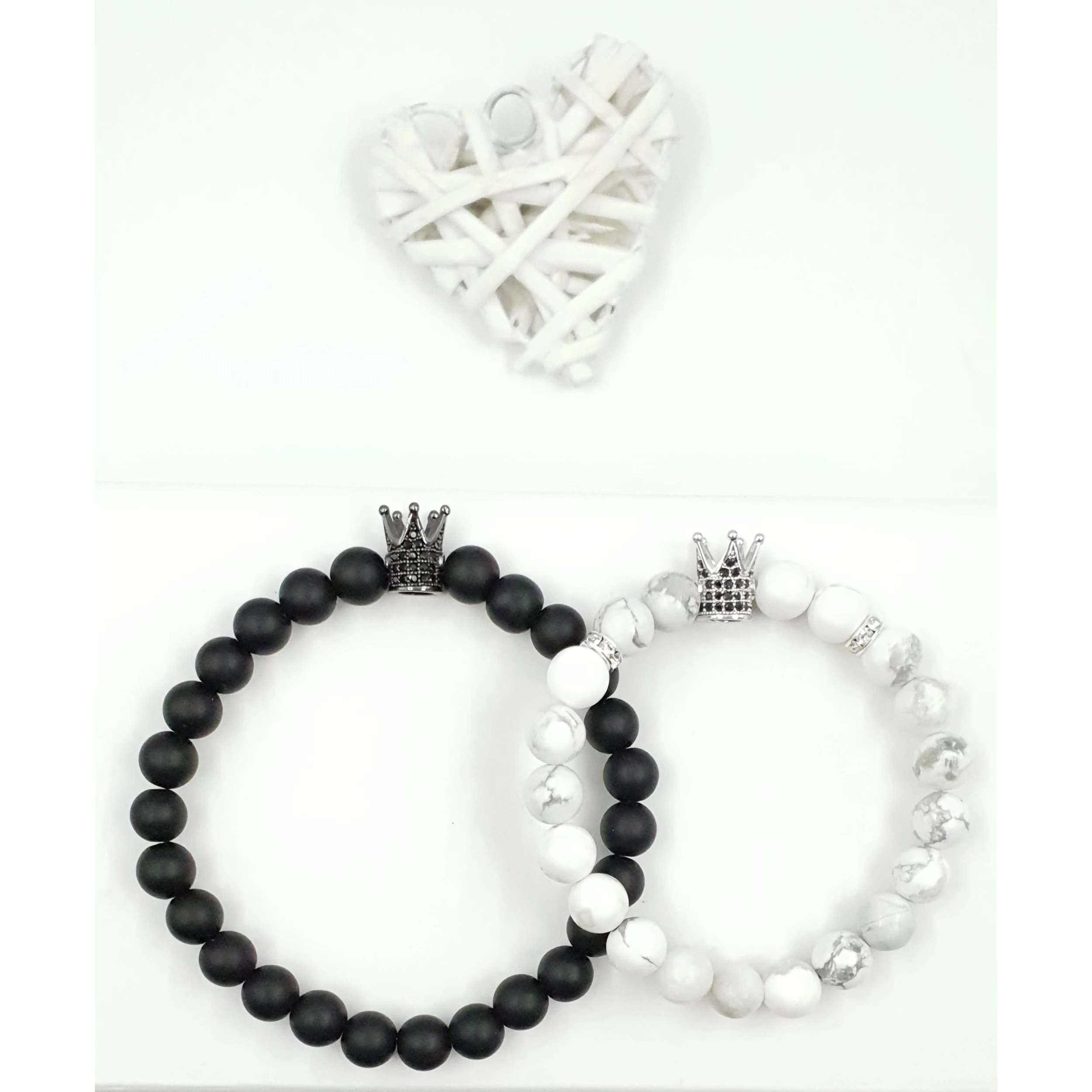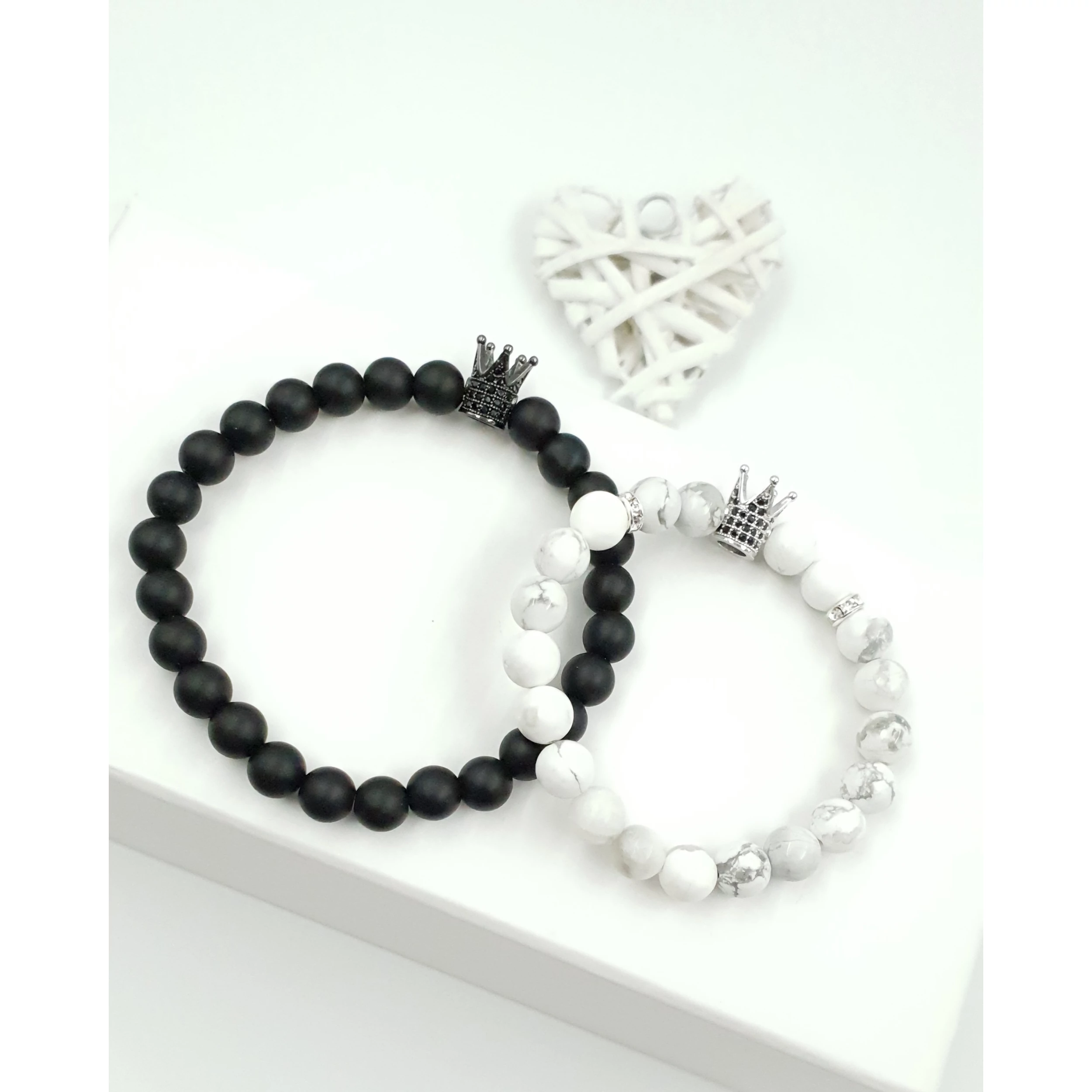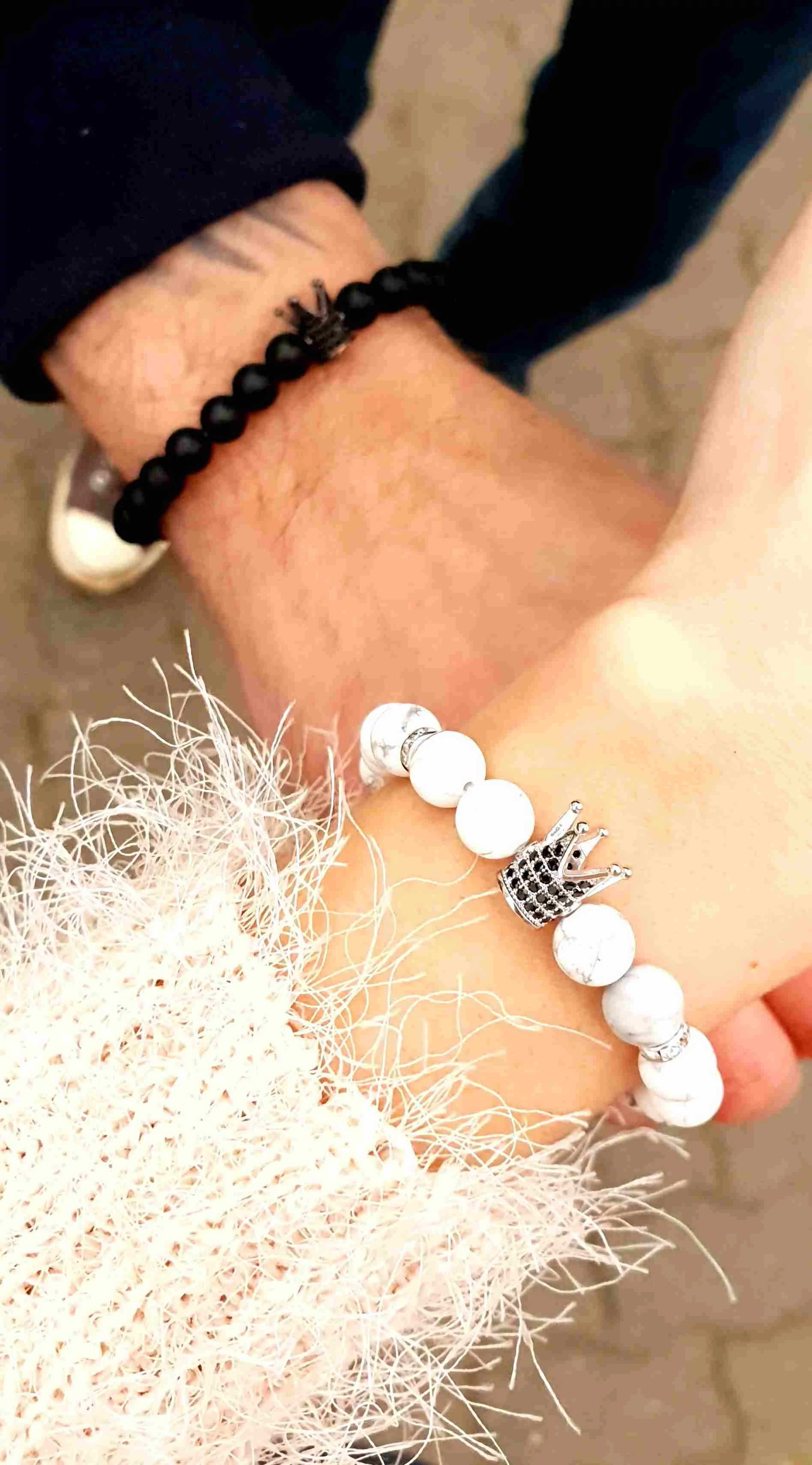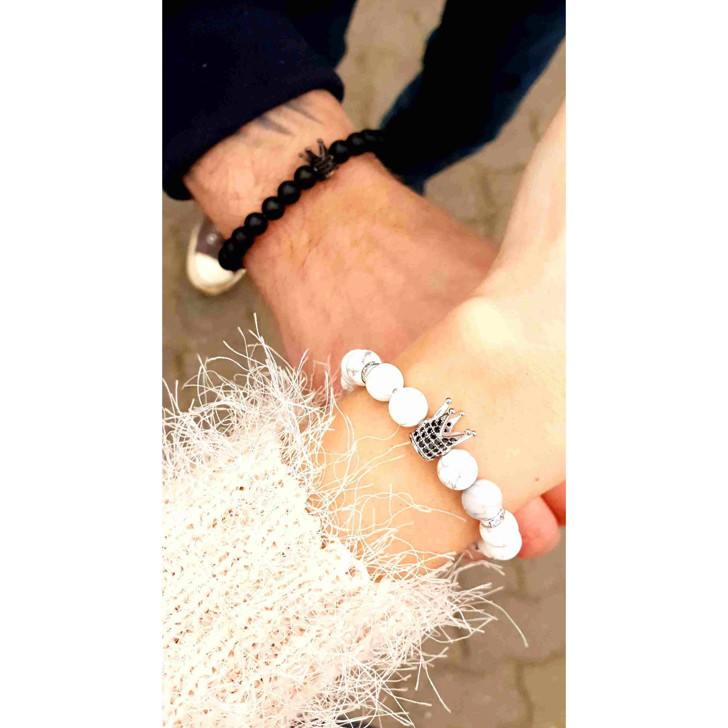 Gyönyörű egyedi szerelmi karkötőpár. A női karkötő márványos howlit ásványból készült, és egy ezüst színű luxury korona medál díszíti, a férfi karkötő matt ónix ásványból készült és egy antracit fekete luxury korona medál díszíti.