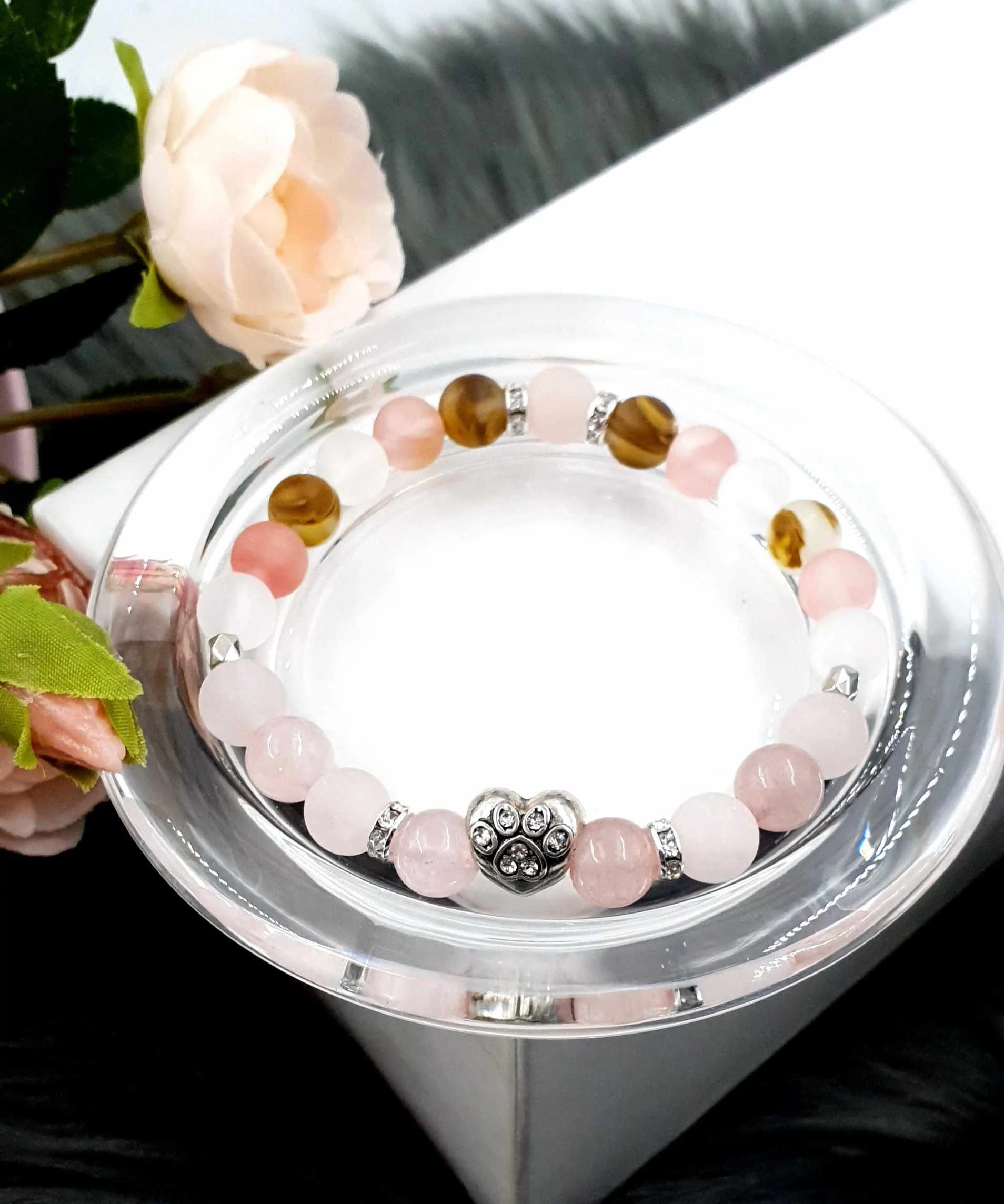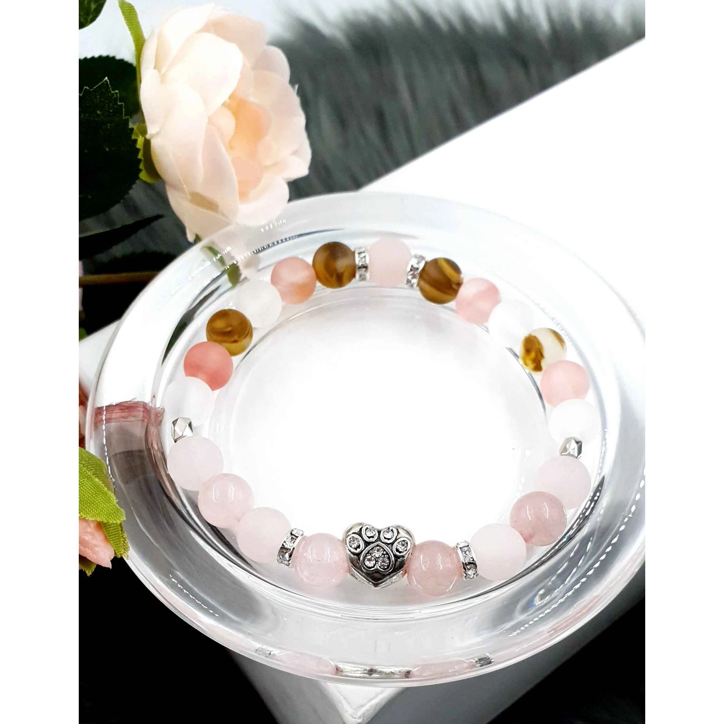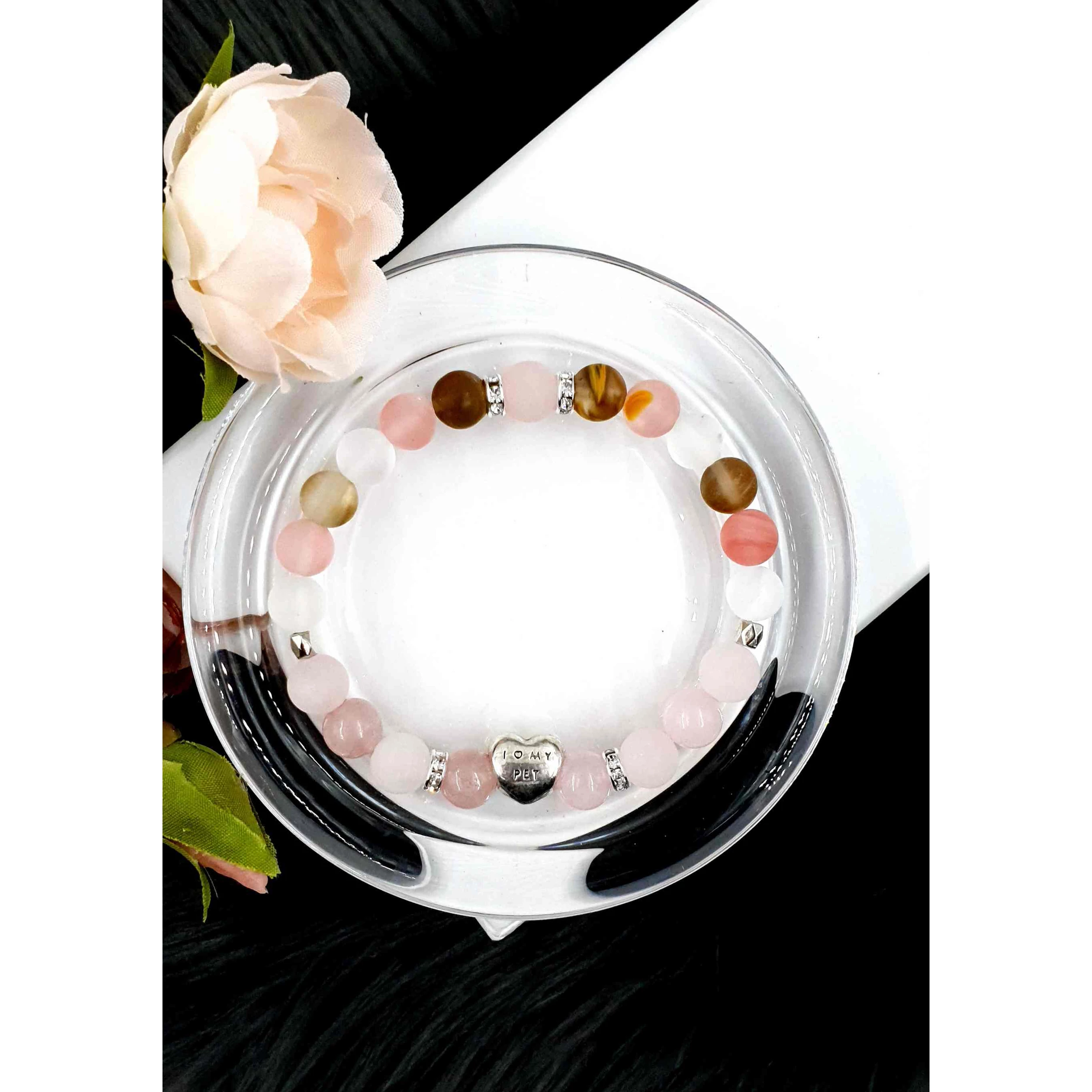 Egyedi tervezésű rózsaopál és matt rózsakvarc ásványokból készült kutya szívecske tappancs medálos ásványkarkötő. A medál egyik oldalán tappancs szimbólum van, strasszos kövekkel kirakva, a hátoldalán "I LOVE MY PET" felirat látható.