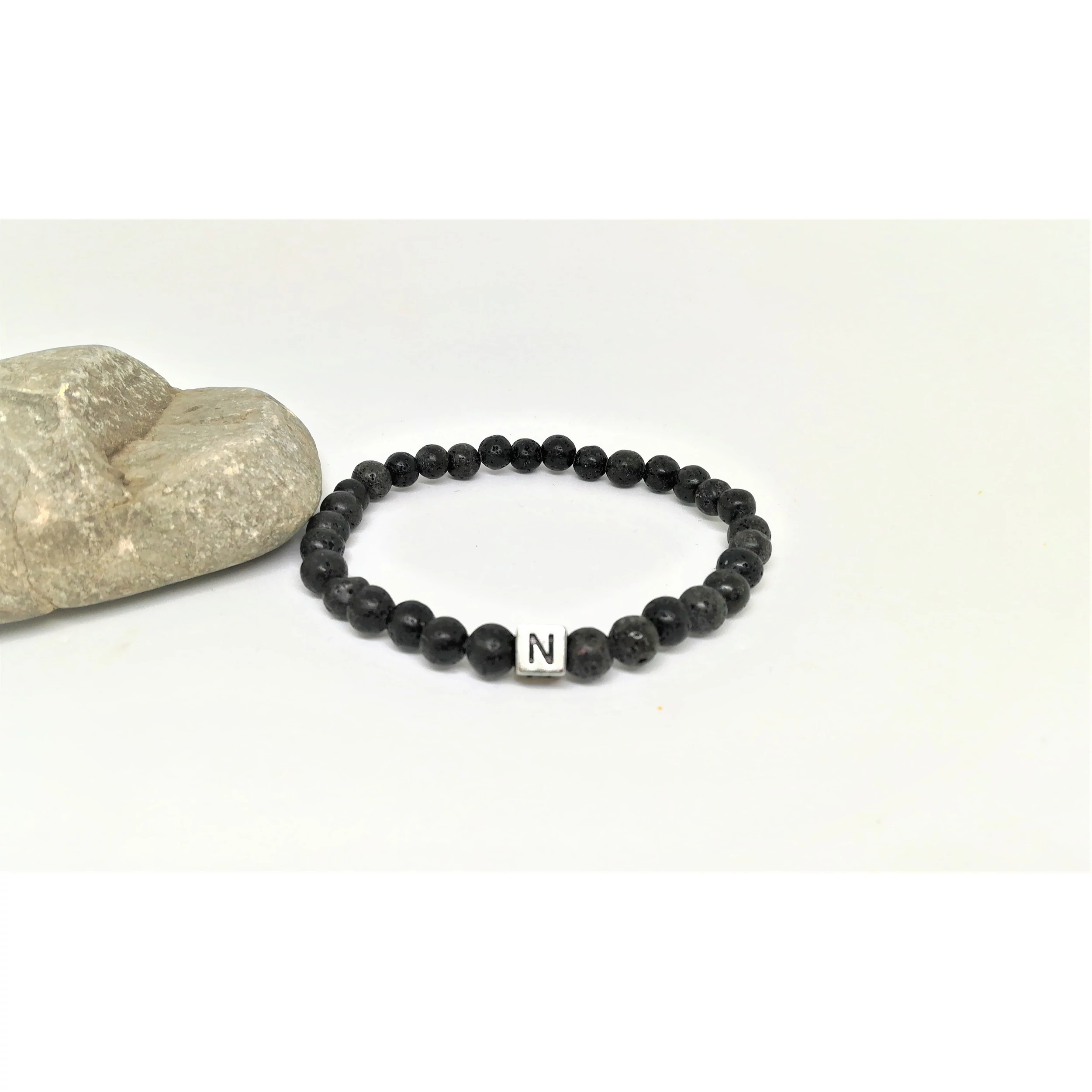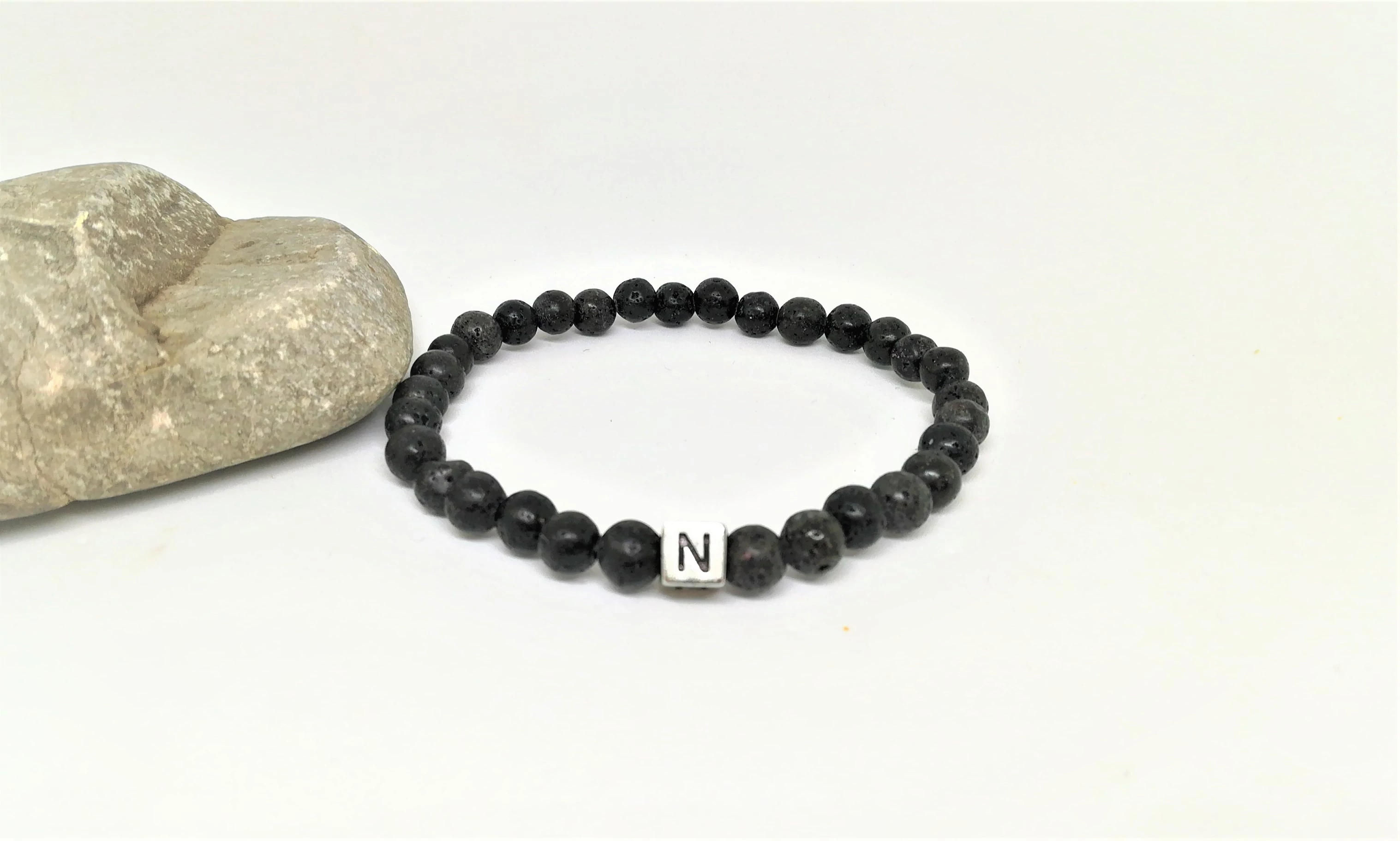 Ez az egyedi karkötő, 6 mm lávakő ásványokból készült, és egyedileg rendelhető hozzá a betű.