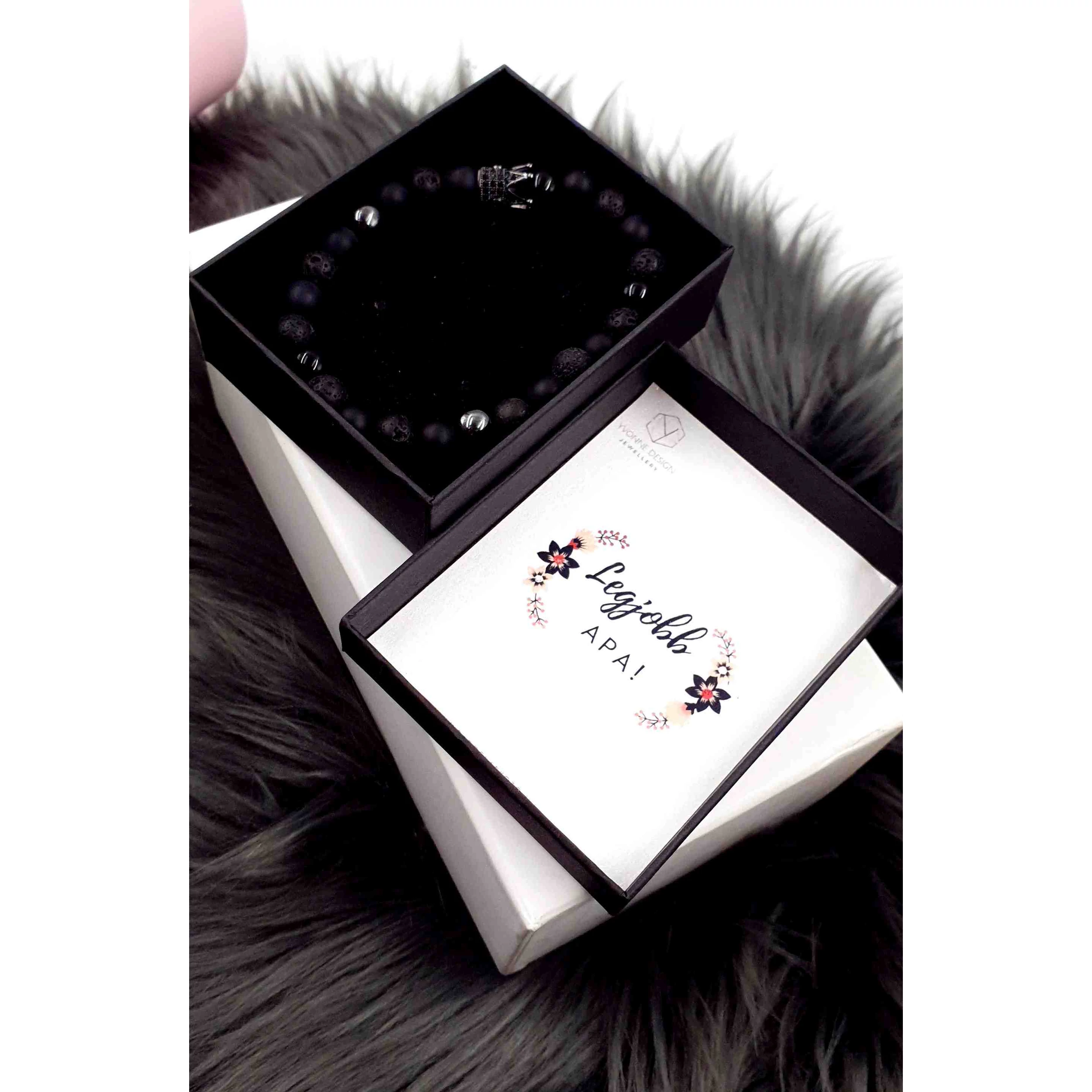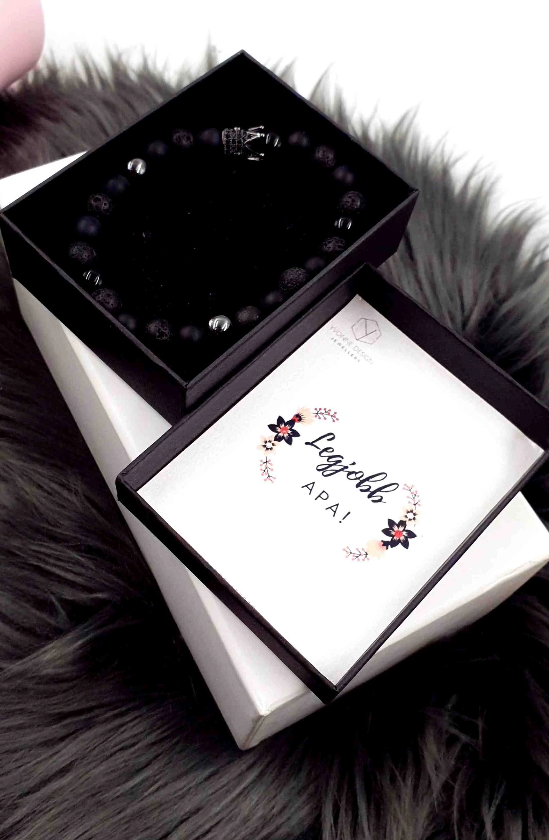 Díszdobozos ásványkarkötő személyre szabottan egyedi üzenettel: "Legjobb Apa!" A karkötő matt fekete ónixból és lavakőből készült, LUXURY korona  medállal.