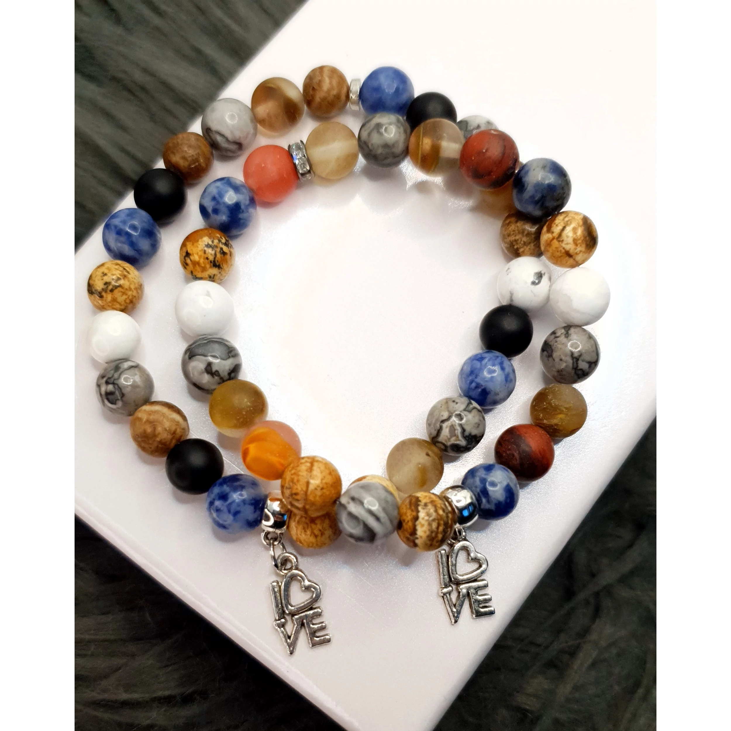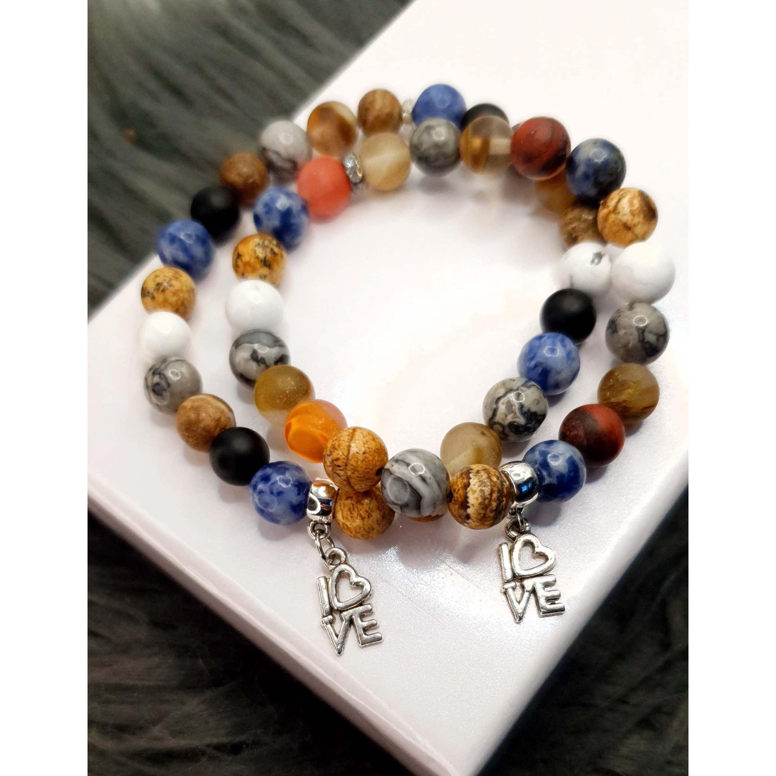 Gyönyörű egyedi tervezésű LOVE medálos ásványkarkötőpár szodalittal. A szerelmi karkötőpár rózsaopál,  howlit, zebrajáspis, képjáspis és szodalit ásványokat tartalmaz. Az  ár egy pár (2db) karkötőre vonatkozik.