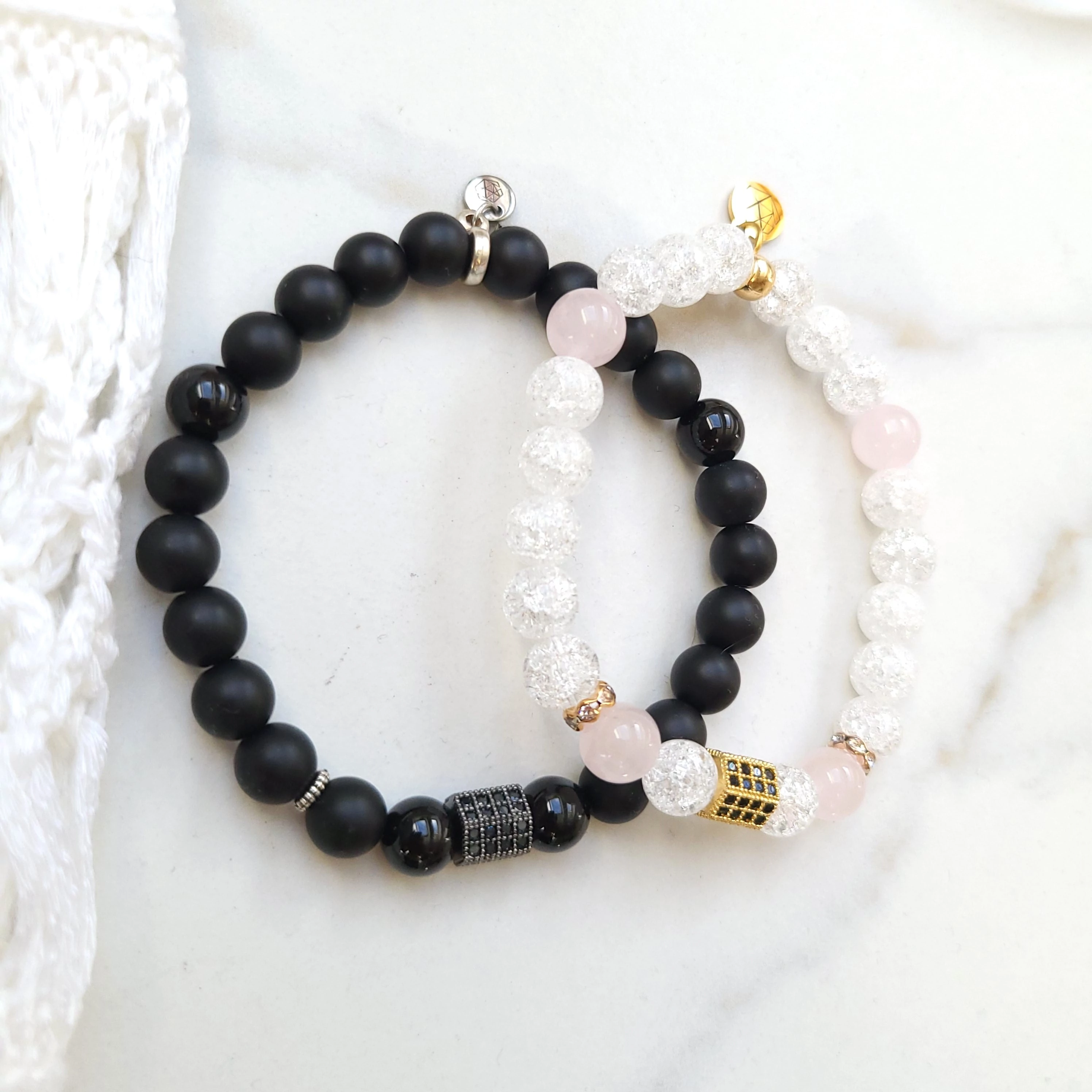 A női karkötő roppantott hegyikristály és fényes rózsakvarc ásványból készült, és egy aranyszín luxury cirkónia medál díszíti, a férfi karkötő pedig matt és fényes fekete ónix ásványokból készült, és egy antracit fekete luxury cirkónia medál díszíti. Gyönyörű csillogó csoda, mely az összetartozást szimbolizálja! heart