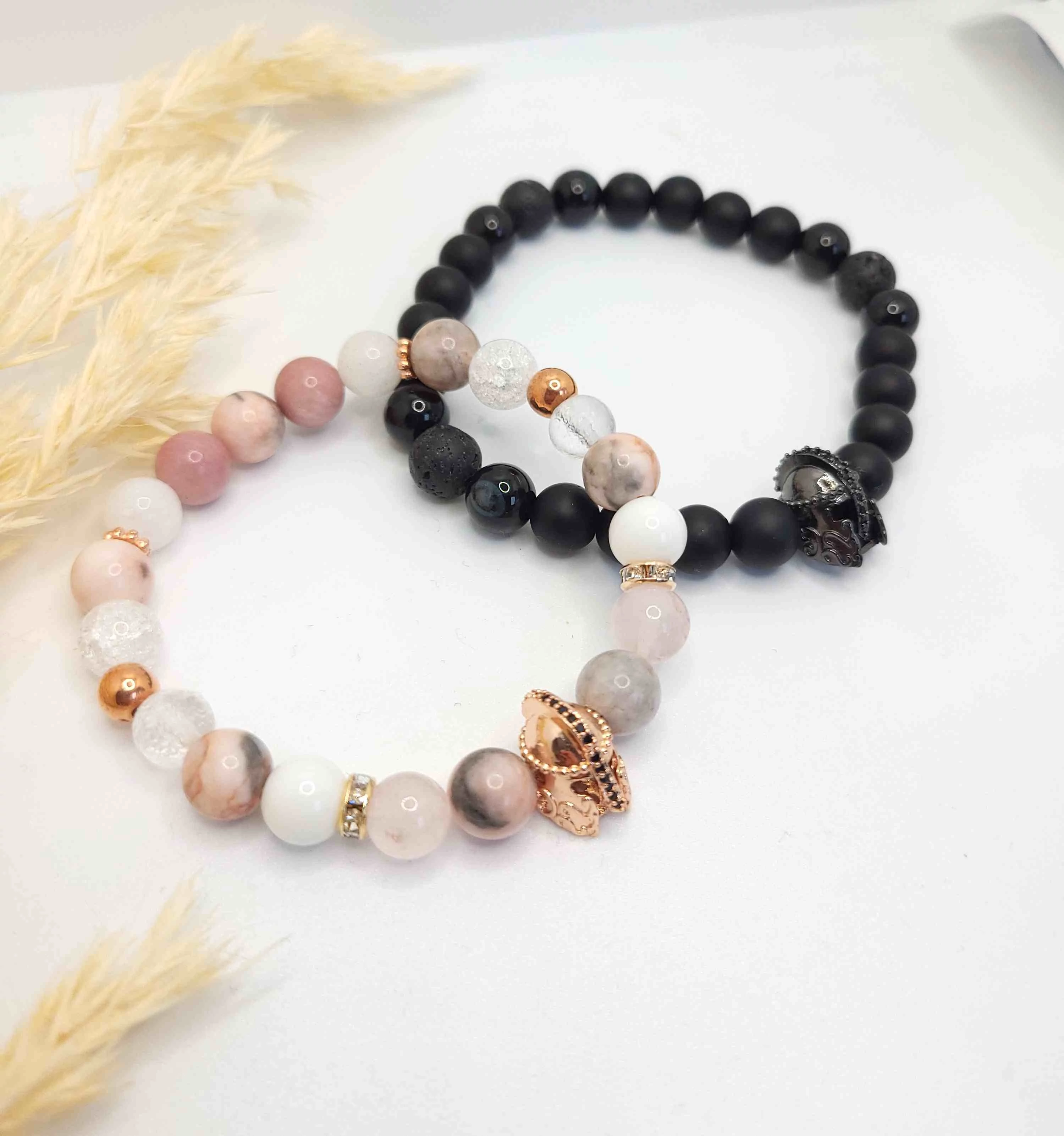 A női karkötő tejkvarc, rózsakvarc, roppantott hegyikristály és zebrajáspis ásványból, rosegold díszitéssel készült, rosegold luxury medállal, a férfi karkötő pedig ónix és lávakő ásványokból készült, fekete luxury medál díszíti.
