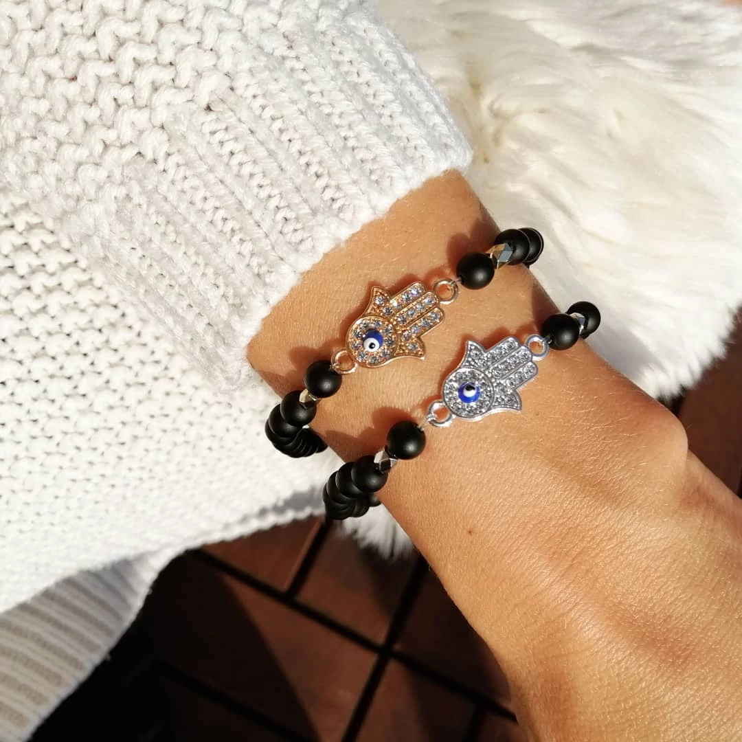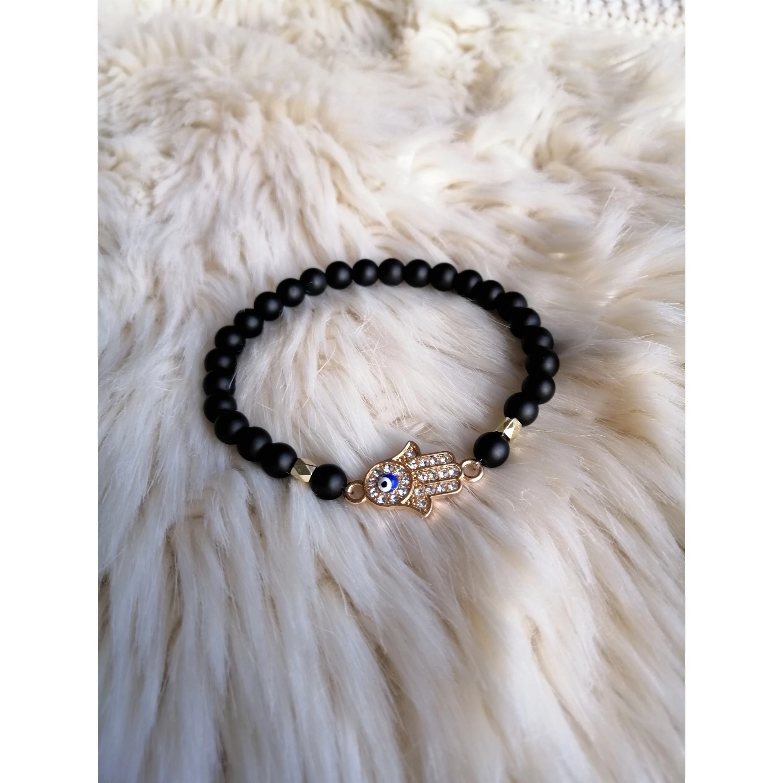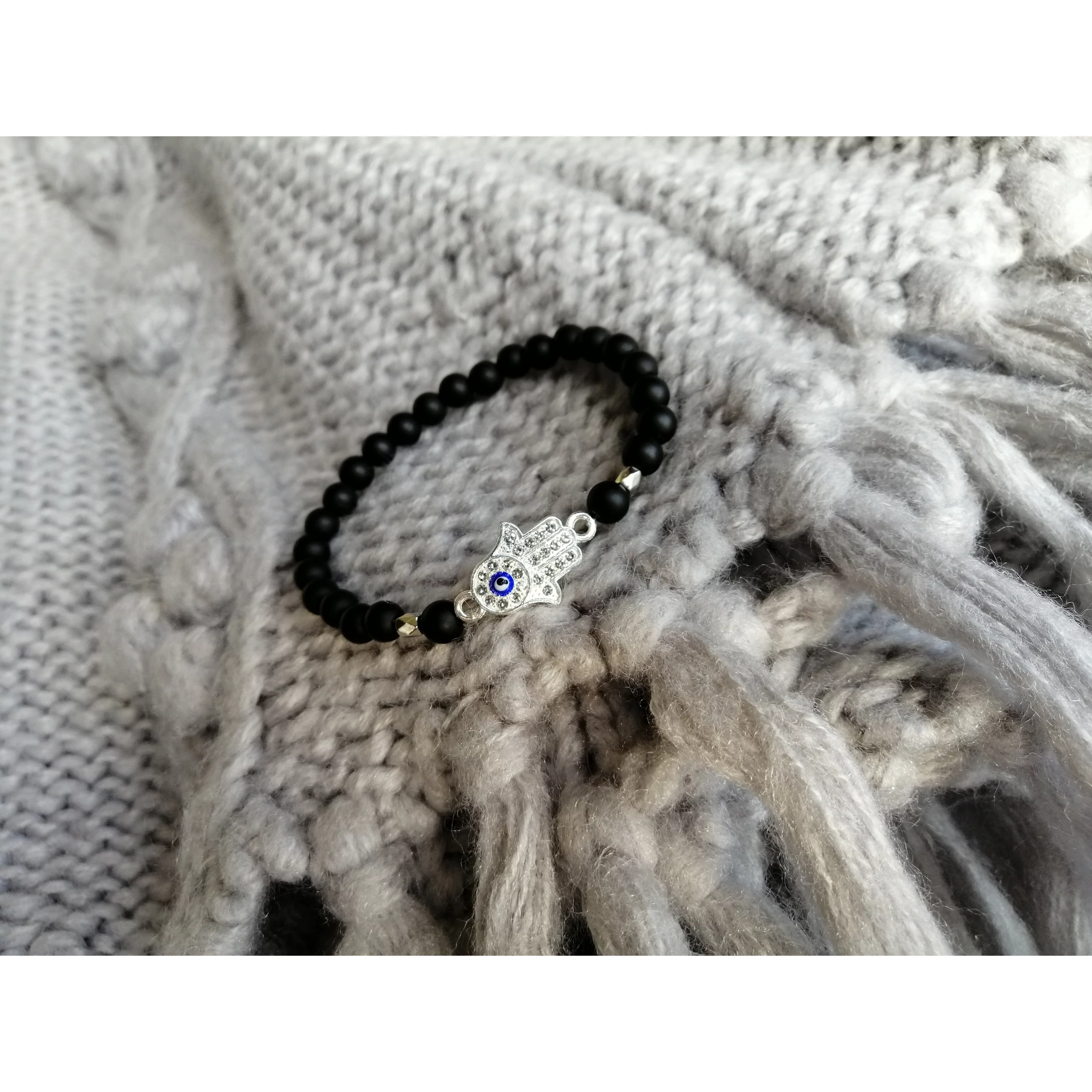Gyönyörű Yvonne Design LUXURY  matt ónix ásványokból készült karkötő hamsakéz medállal.