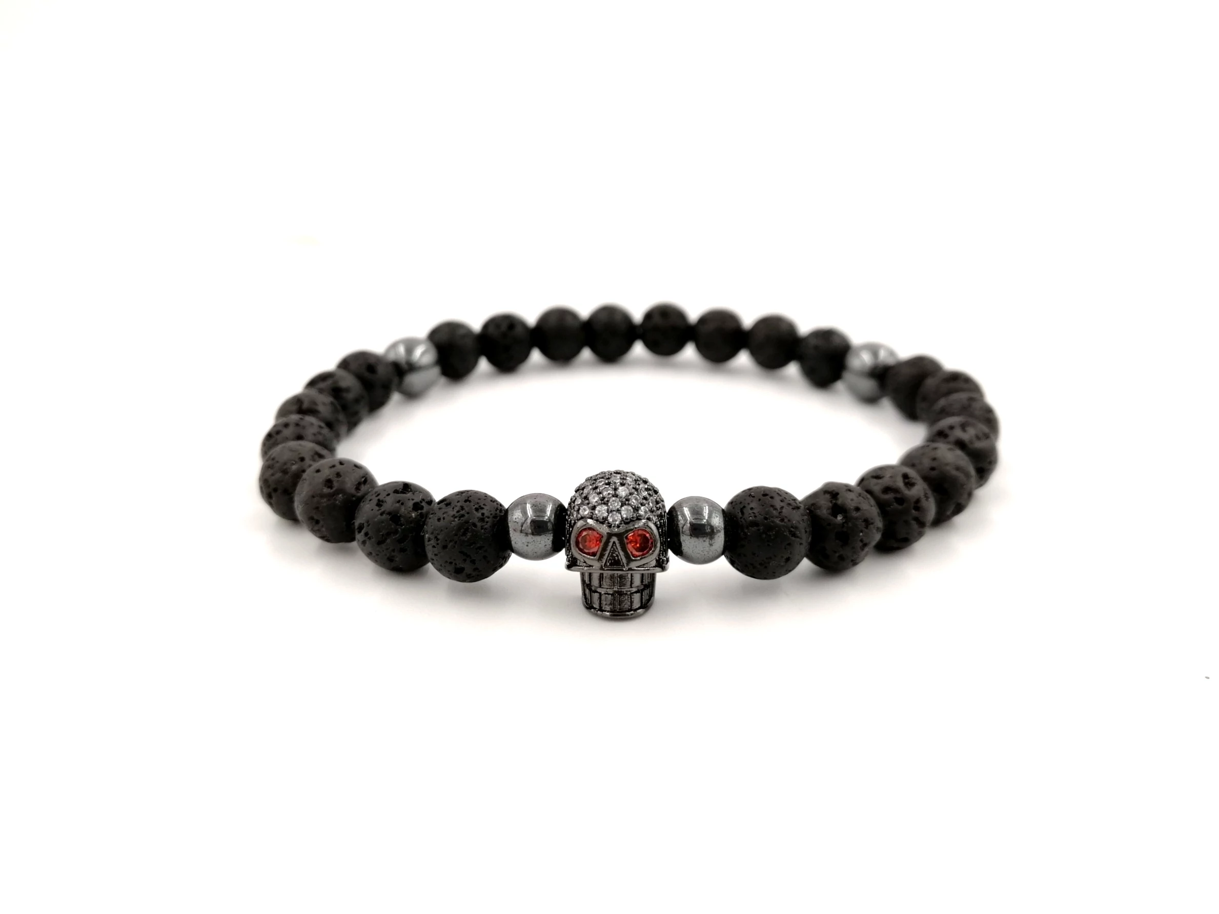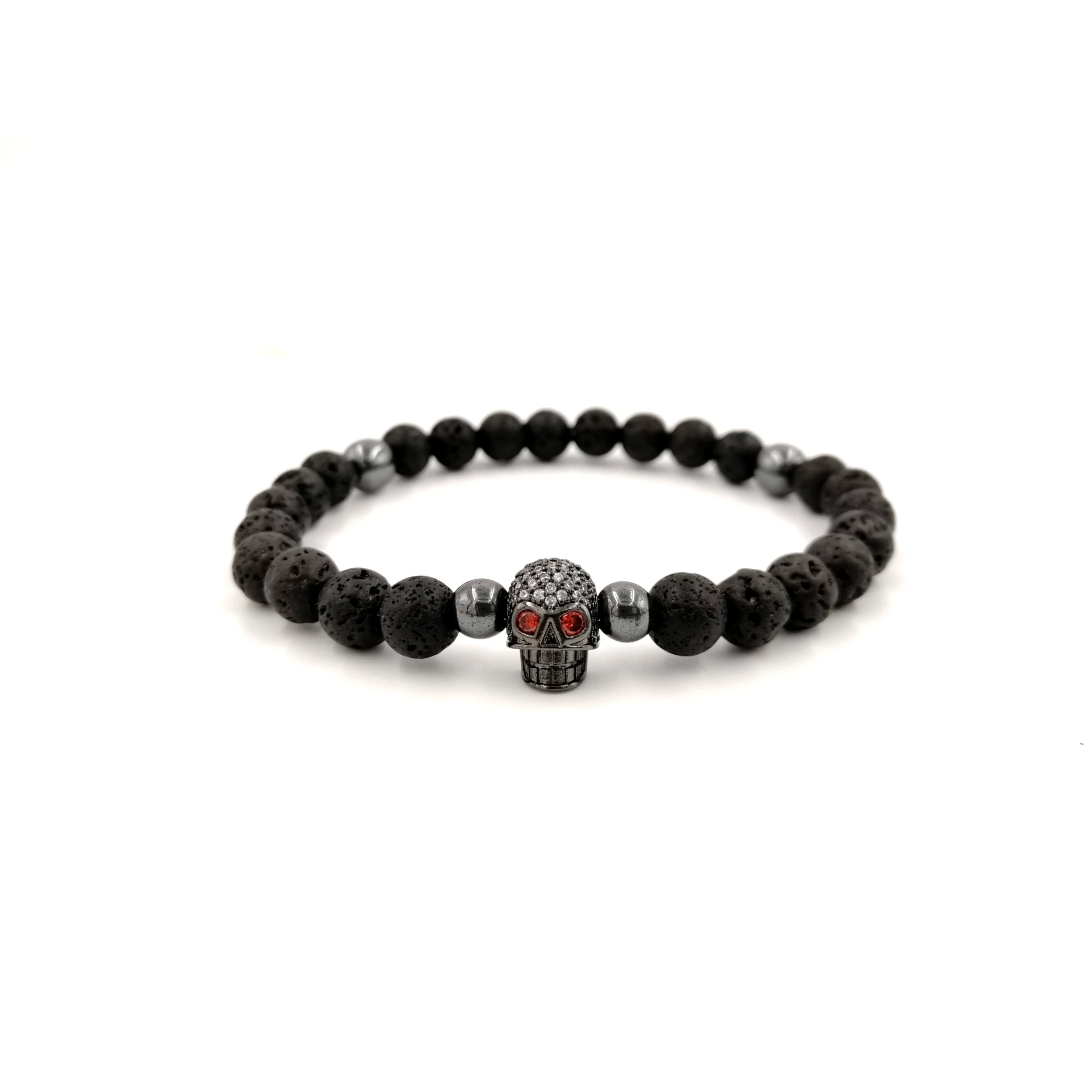 Ez egy gyönyörű egyedi tervezésű LUXURY férfi karkötő, 8mm átmérőjű gyöngyökből készült fekete lávakő ásványokból, 1-1 hematit díszítéssel és mikrokristály koponya medállal.