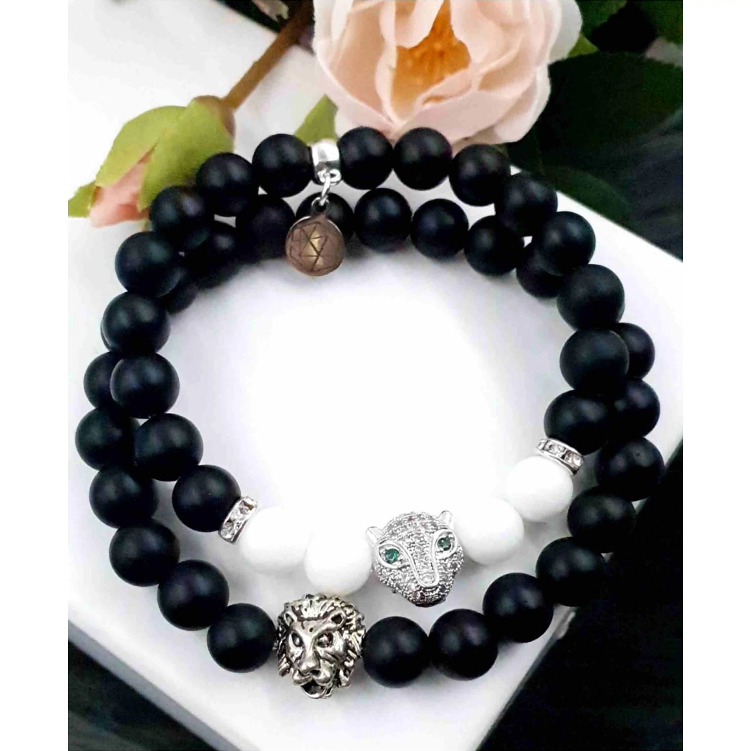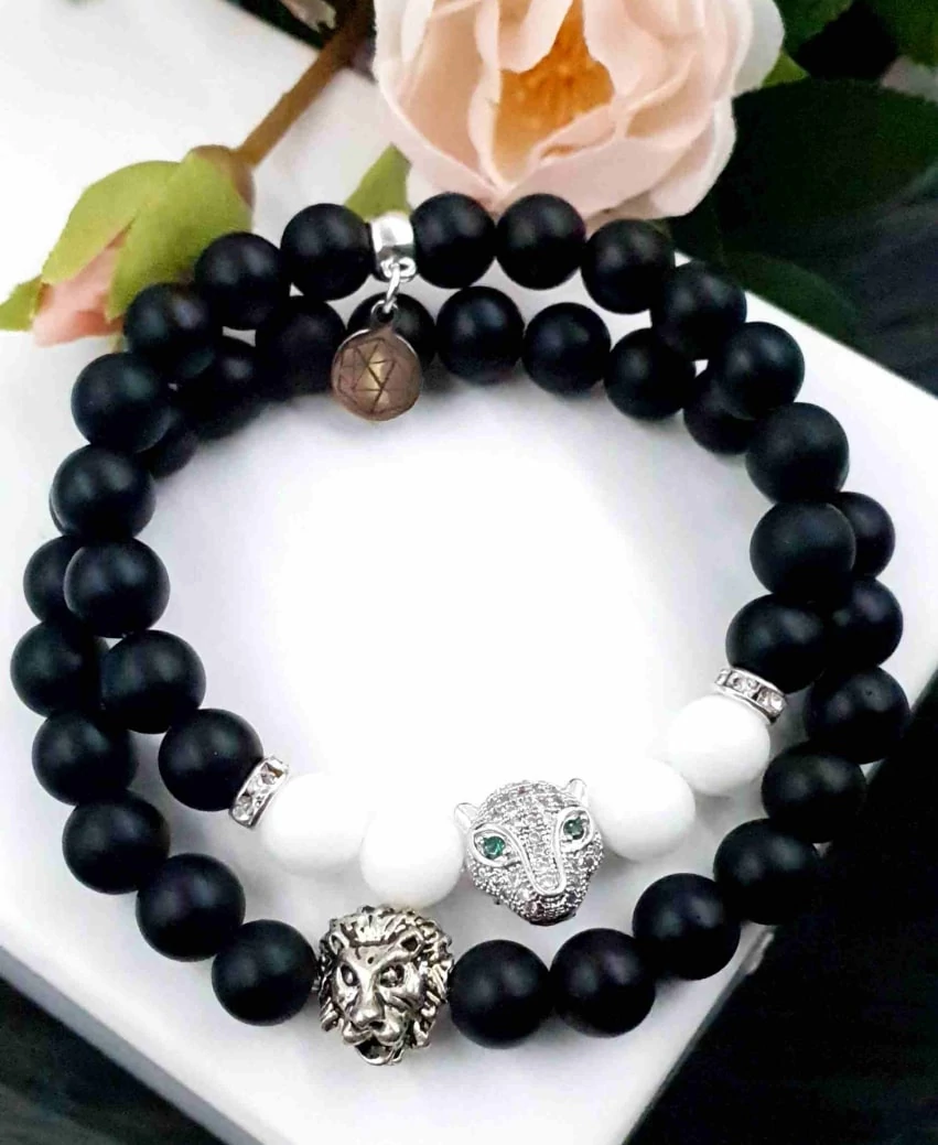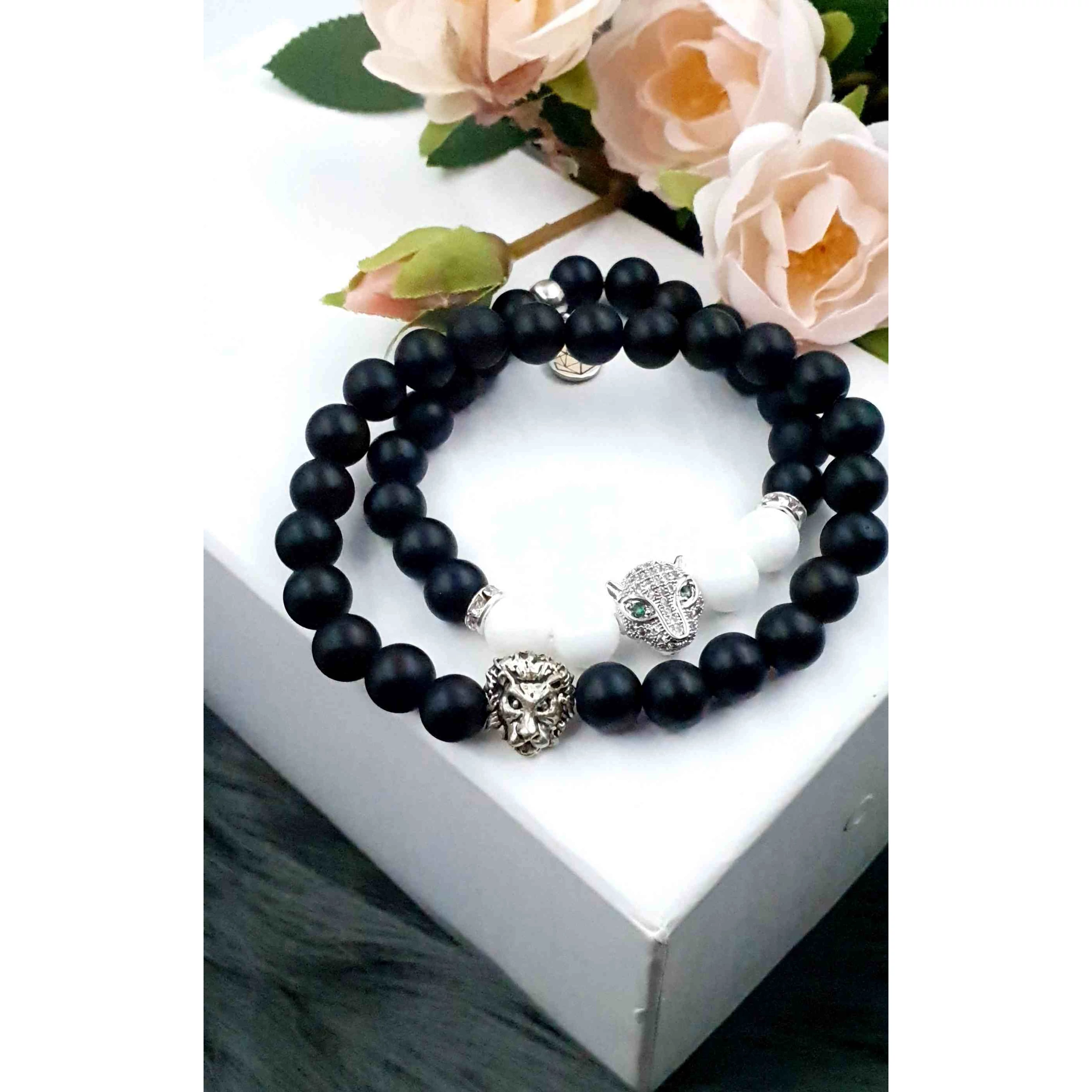 Gyönyörű egyedi karkötőpár fekete ónix és  tejkvarc ásványokból. A női karkötő hófehér tejkvarcból és matt fekete ónixból készült, LUXURY Leopárd fejjel. A férfi karkötő matt fekete ónixból és egy ezüst szín oroszlánfejet tartalmaz. Az  ár egy pár (2db) karkötőre vonatkozik.