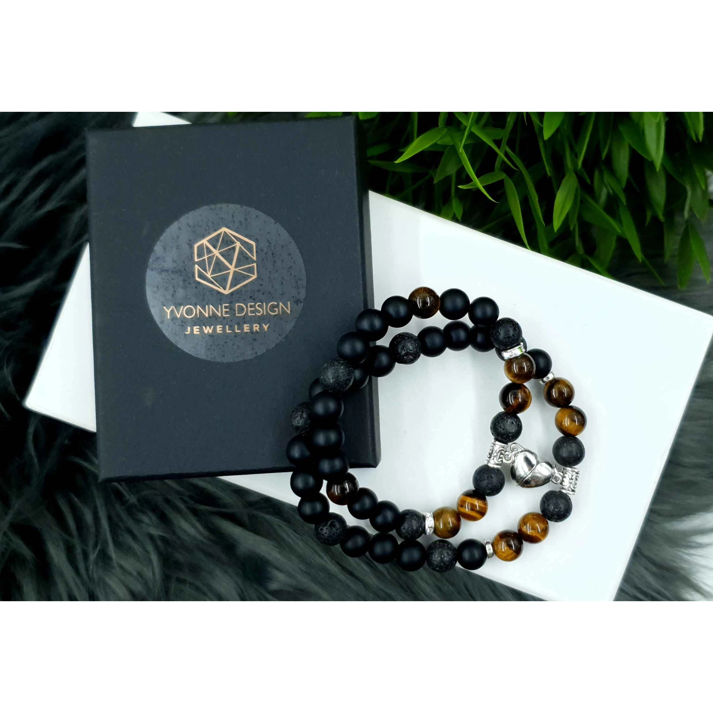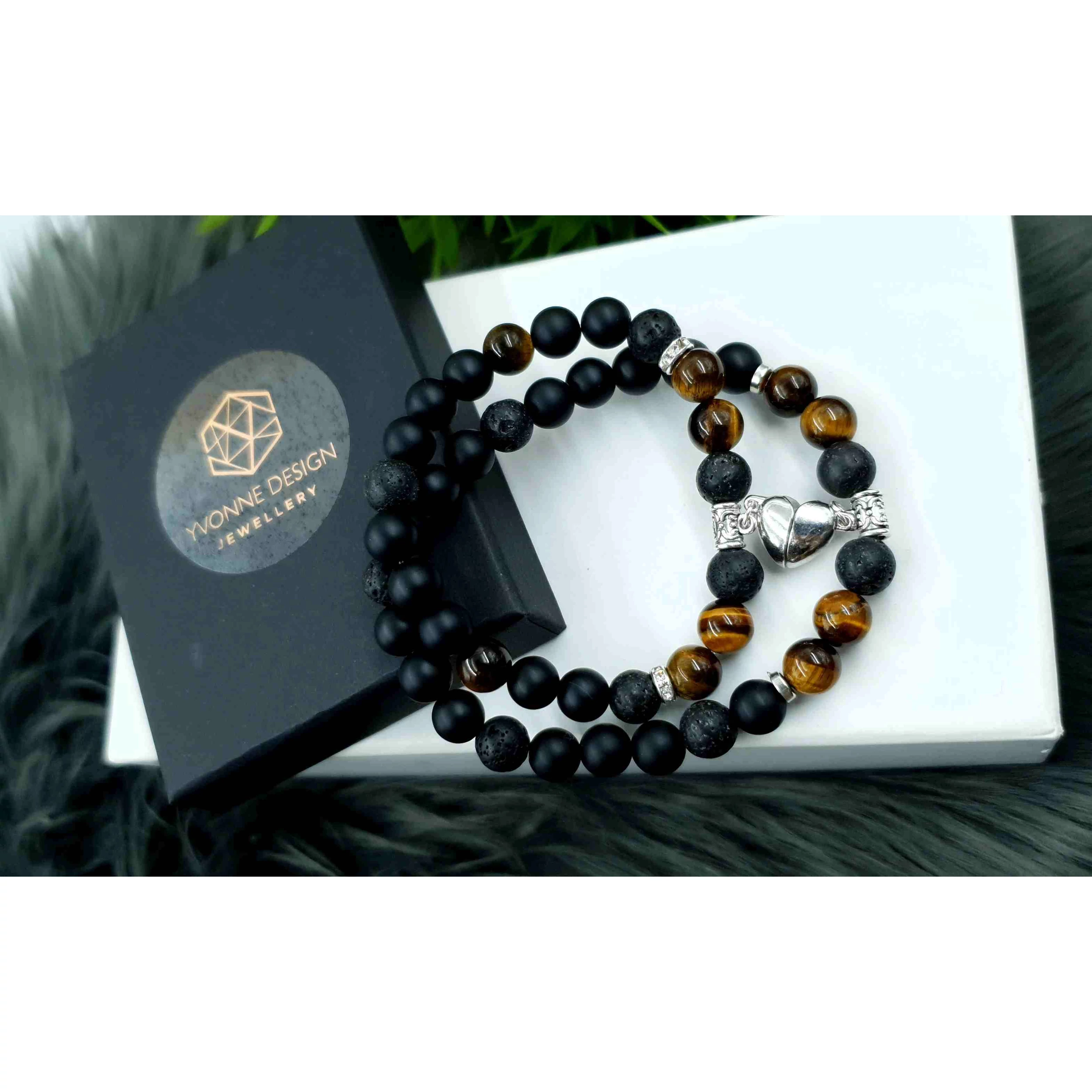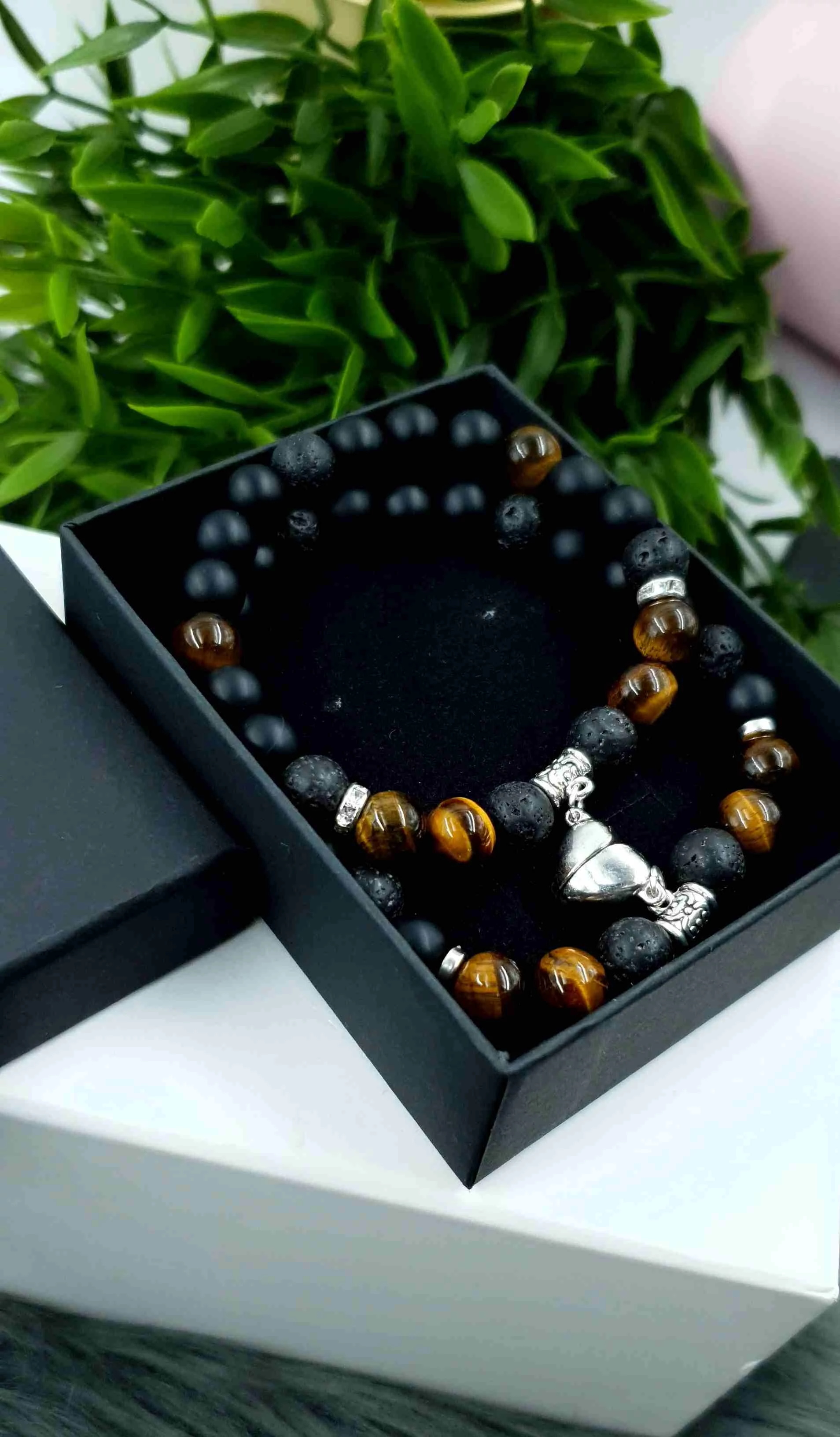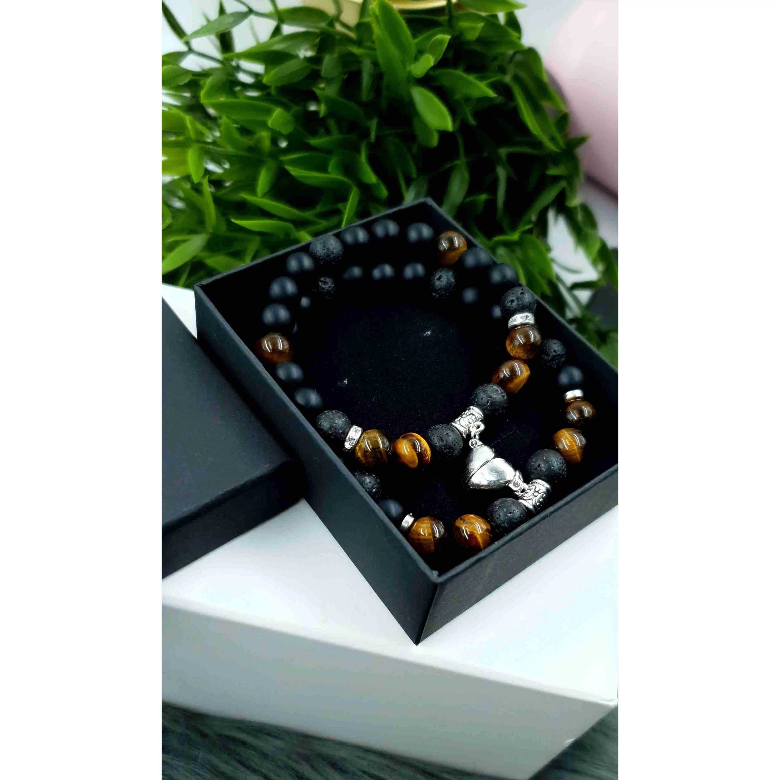 Gyönyörű egyedi szerelmi karkötőpár, apró szívecske mágnesekkel, melyek össze vonzzák egymást, ha egymás közelébe kerülnek. A női karkötő és a férfi a férfi karkötő is fekete ónix és lávakőből és barna tigrisszem ásványokból készültek. Ez a karkötőpár az összetartozást és szerelmet szimbolizálja két ember között. Az  ár egy pár (2db) karkötőre vonatkozik.