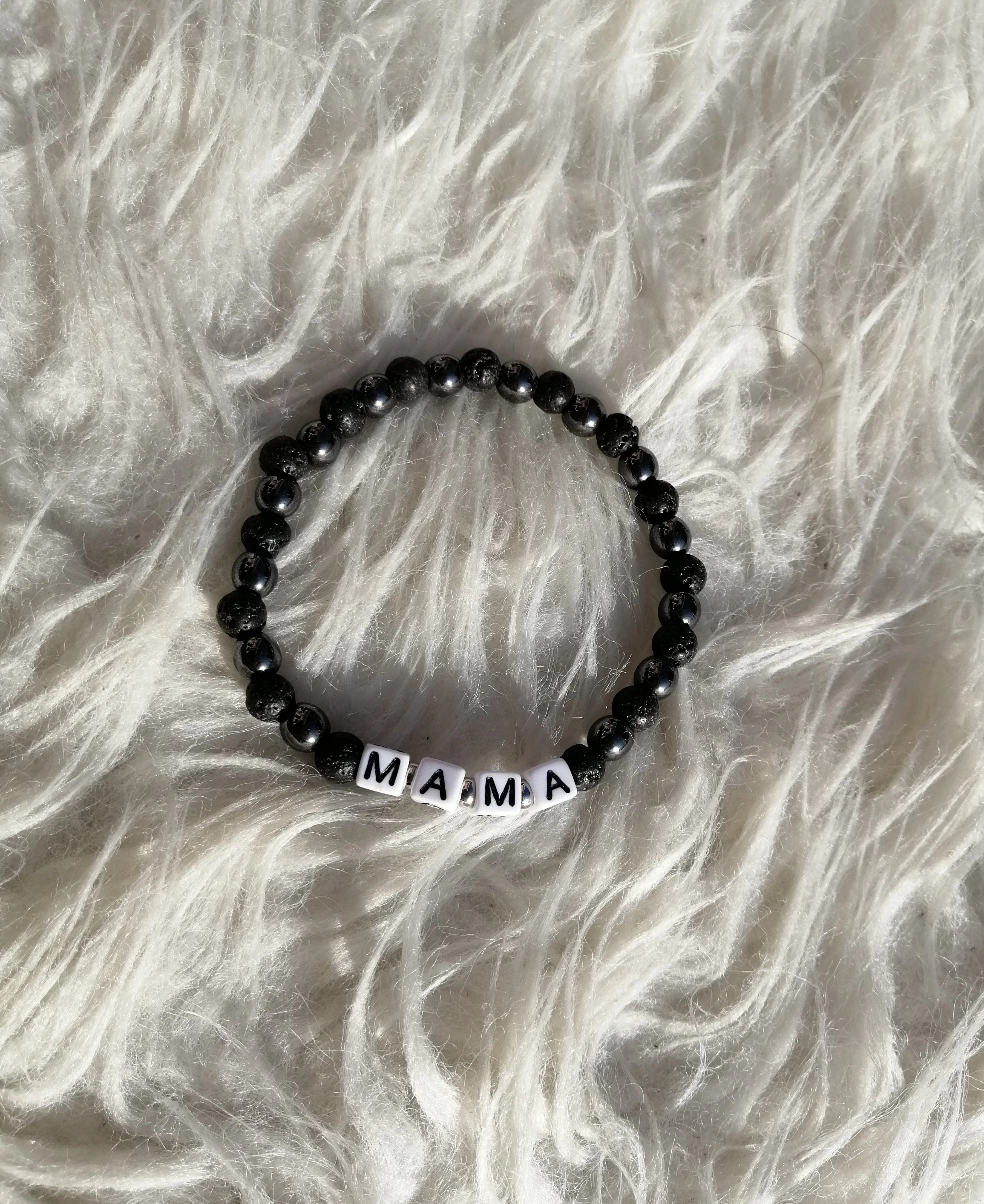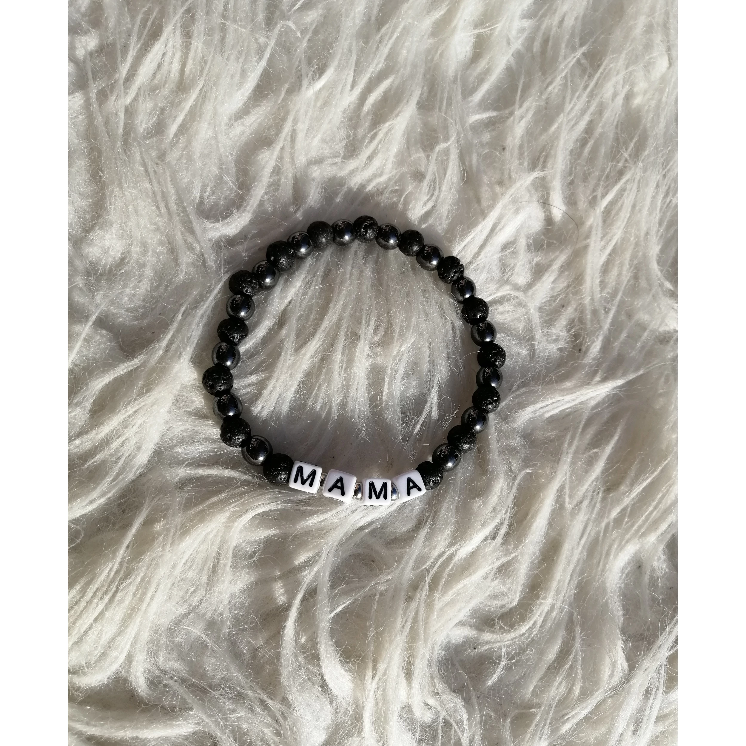 MAMA feliratos hematit-lávakő ásványkarkötő