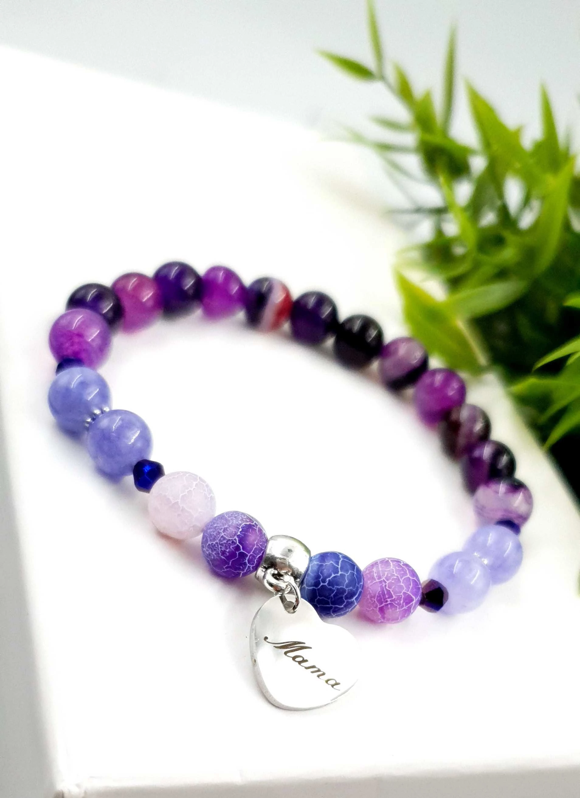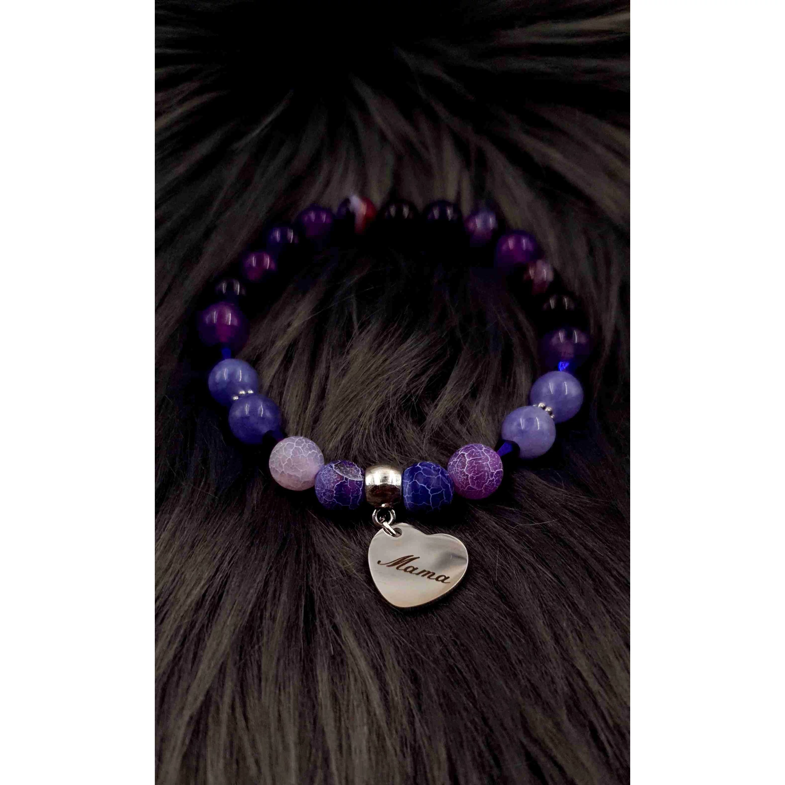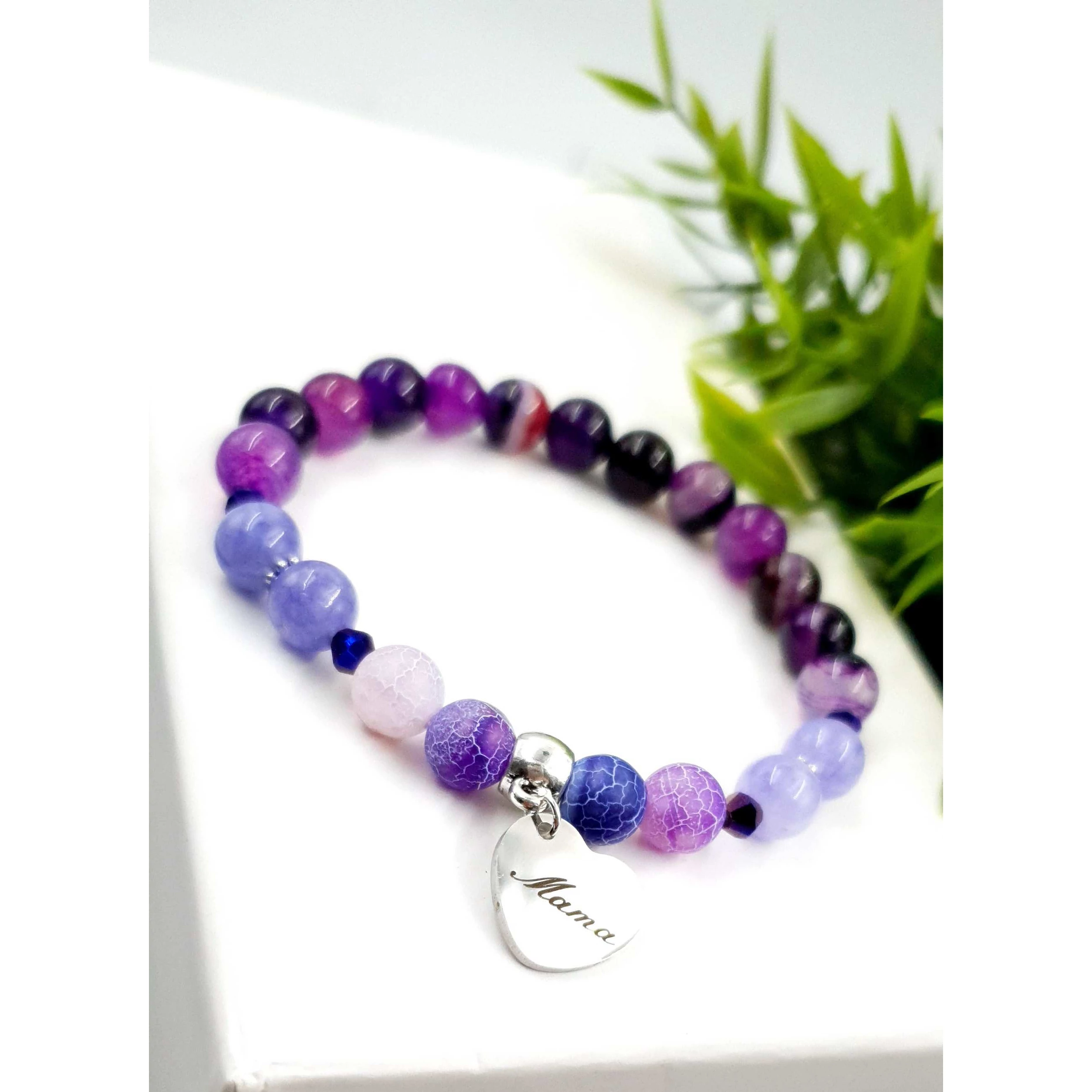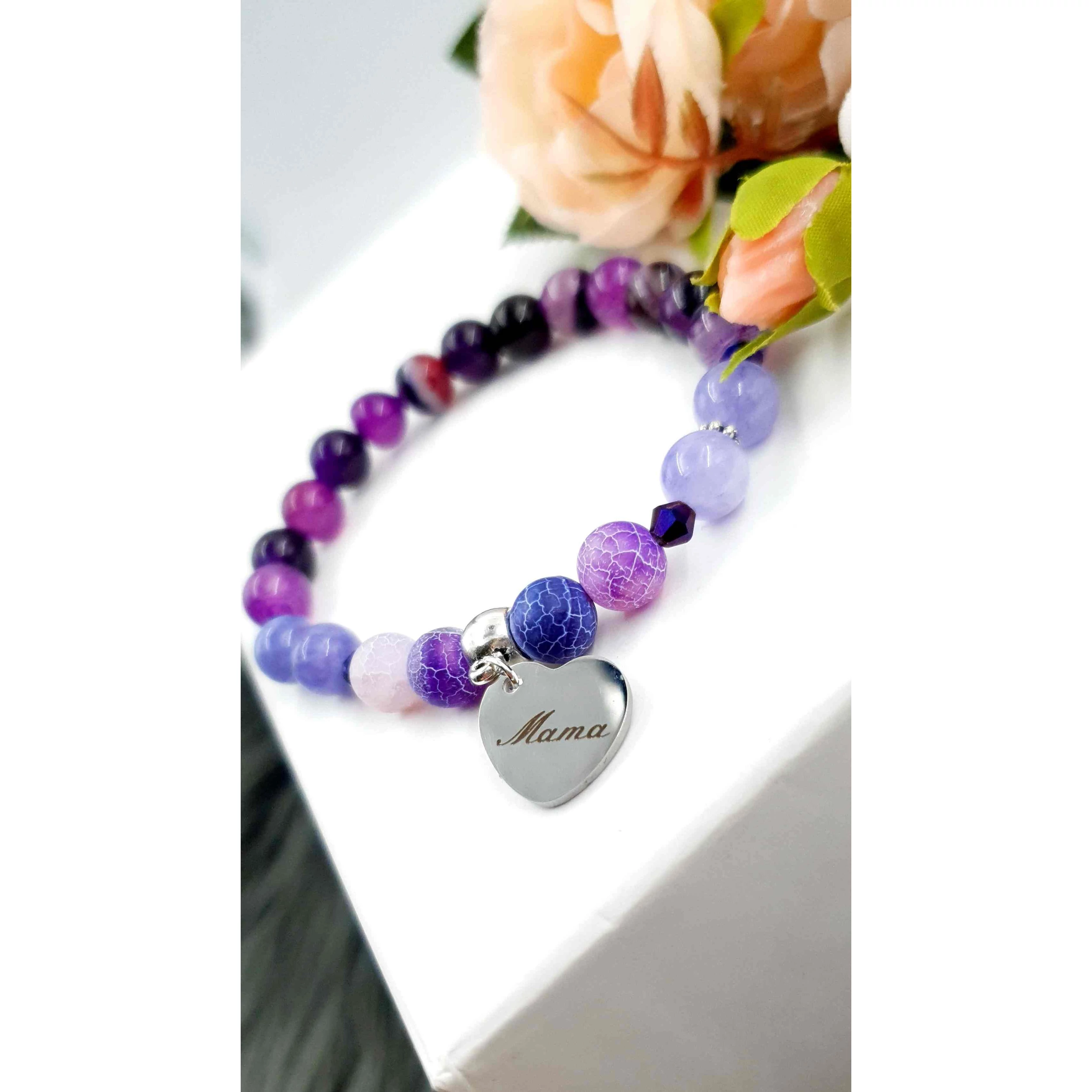 Mama medálos kristály karkötő 8 mm-es ásványgyöngyből készítve. 1 cm átmérőjű nemesacélból készült gravírozott medállal.