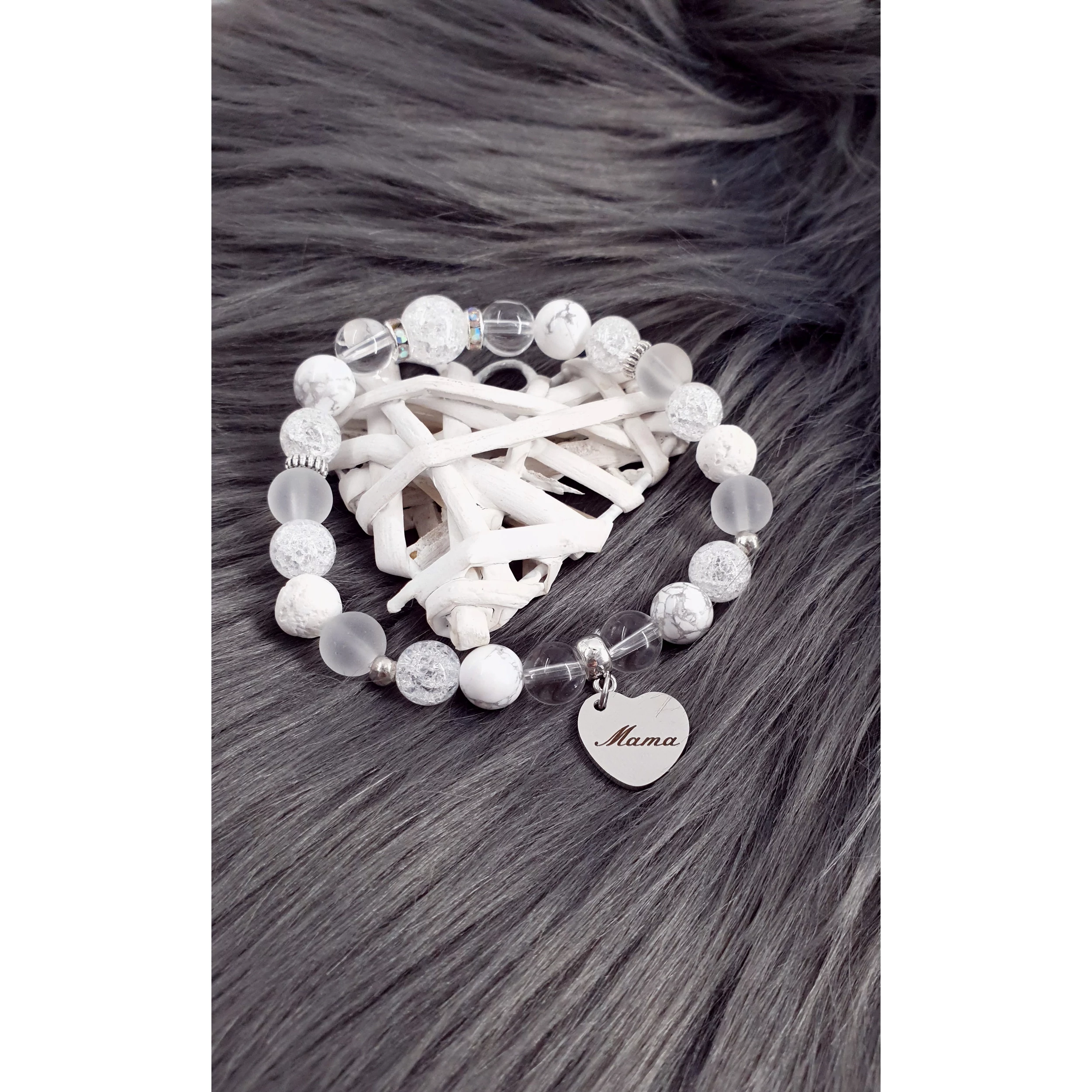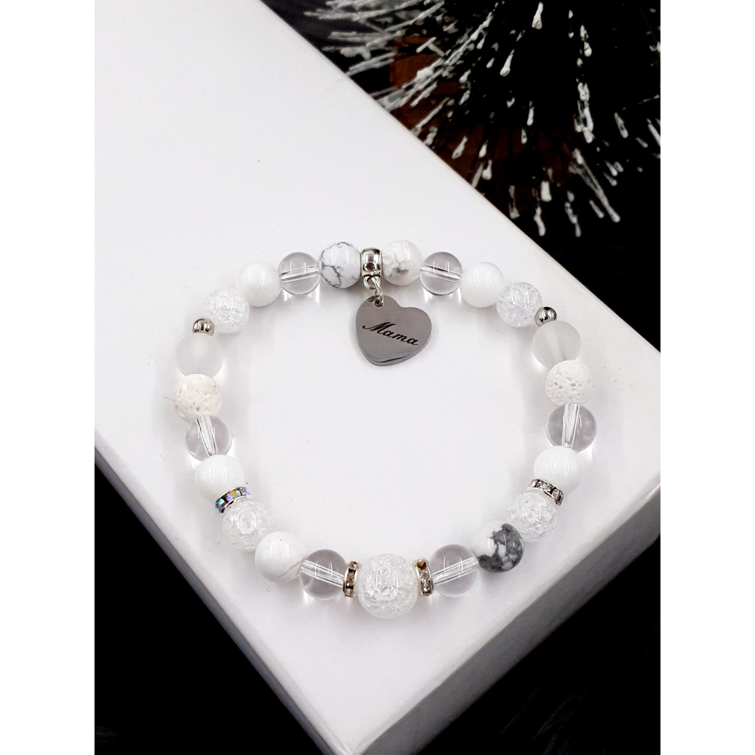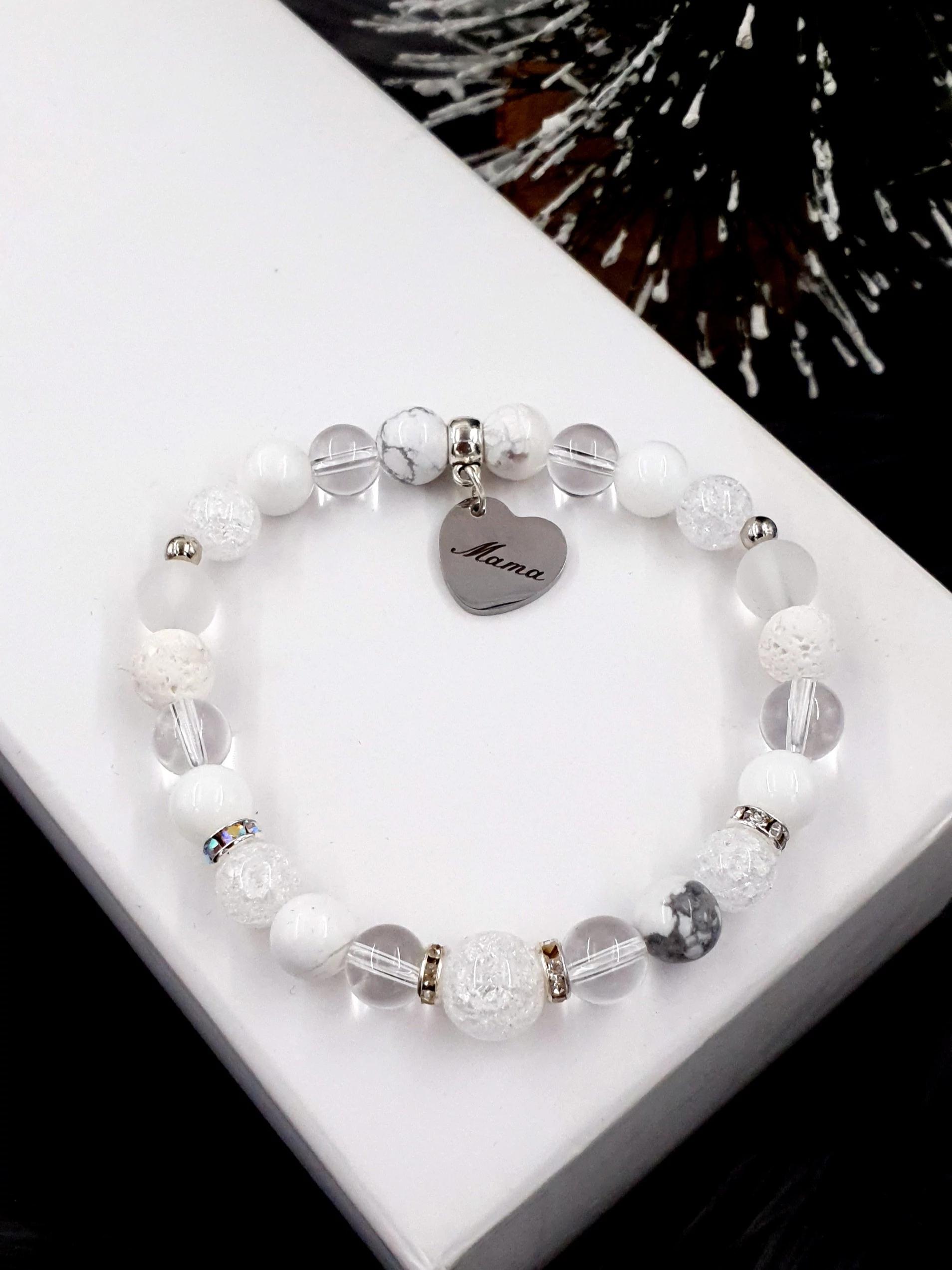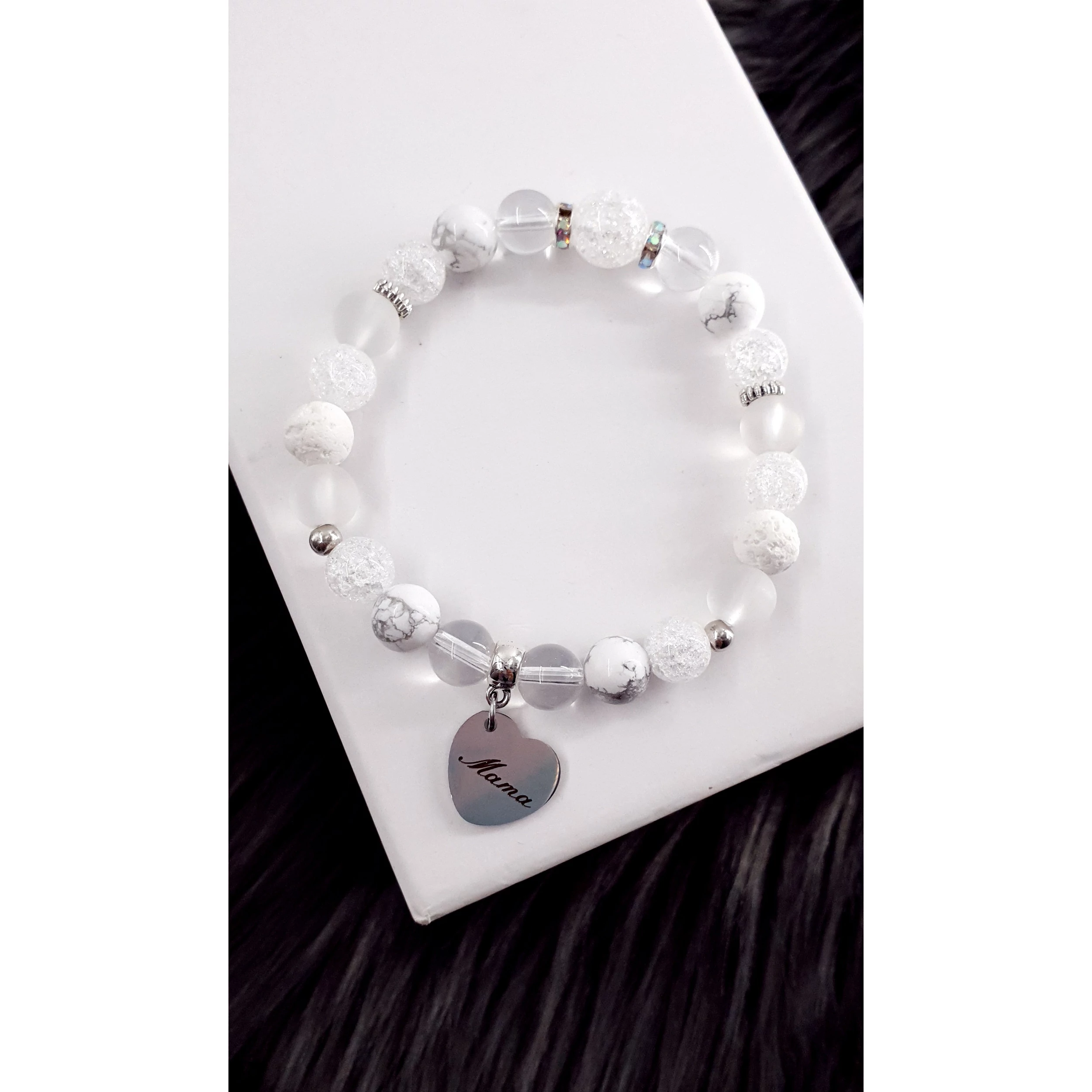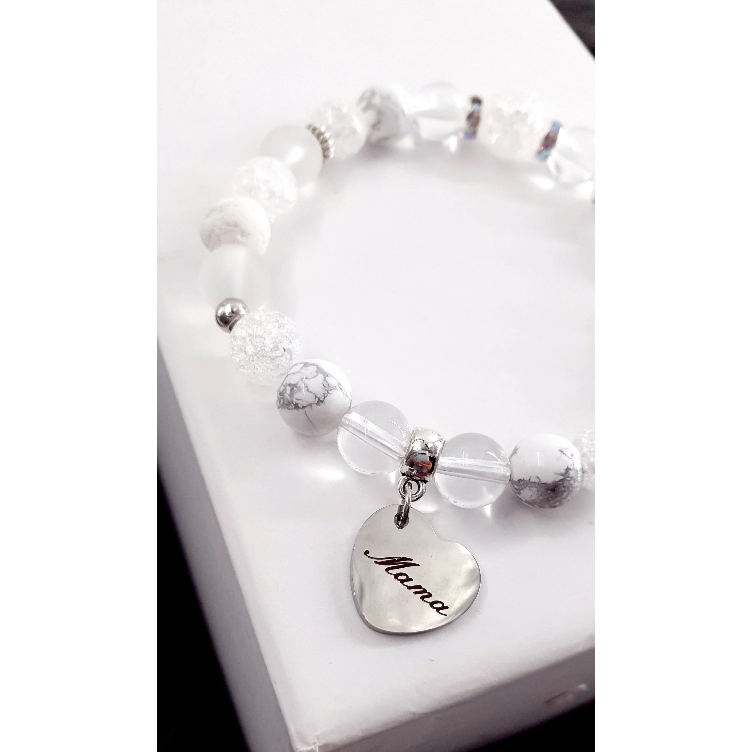 Mama medálos kristály karkötő 8 mm-es ásványgyöngyből készítve. 1 cm átmérőjű nemesacélból készült gravírozott medállal.