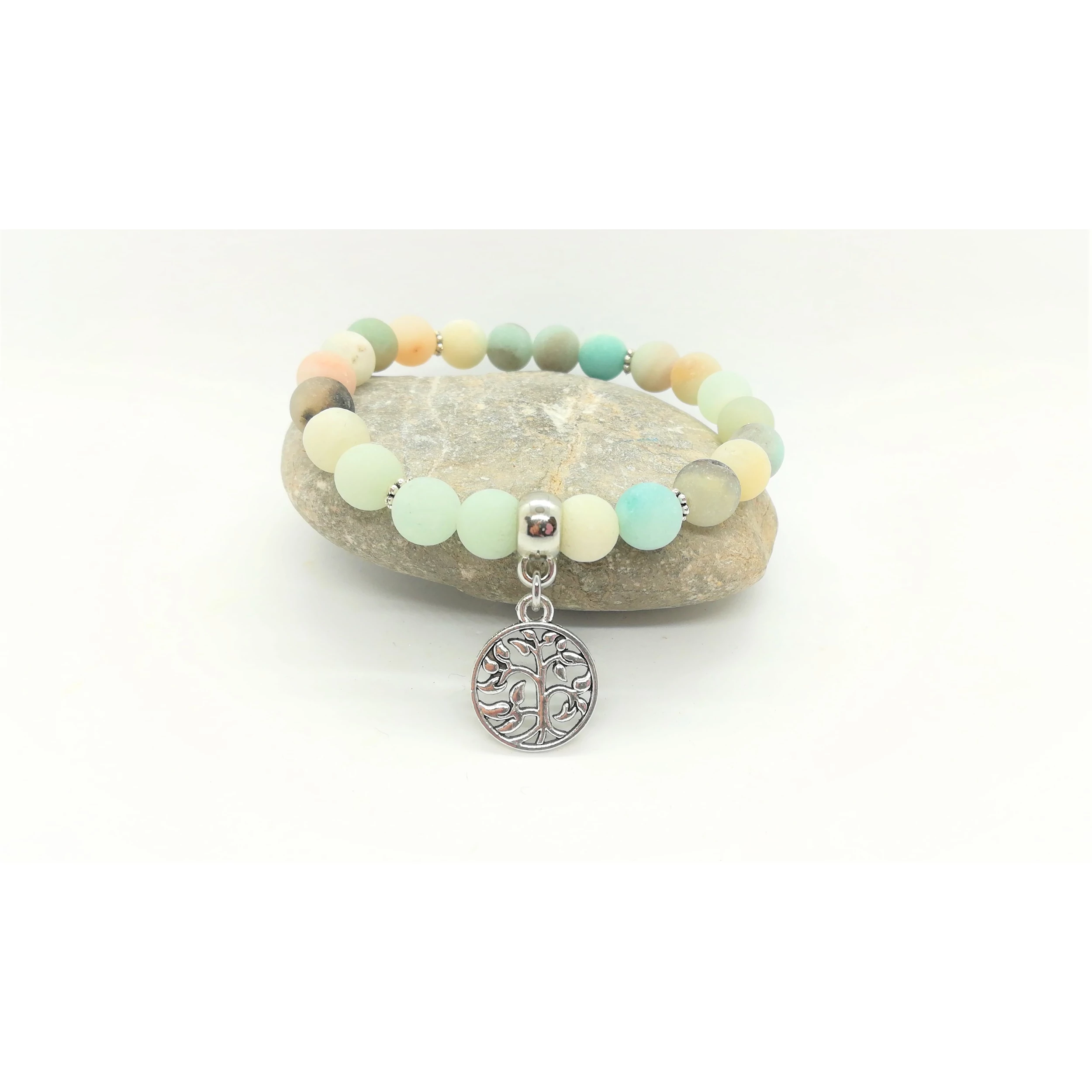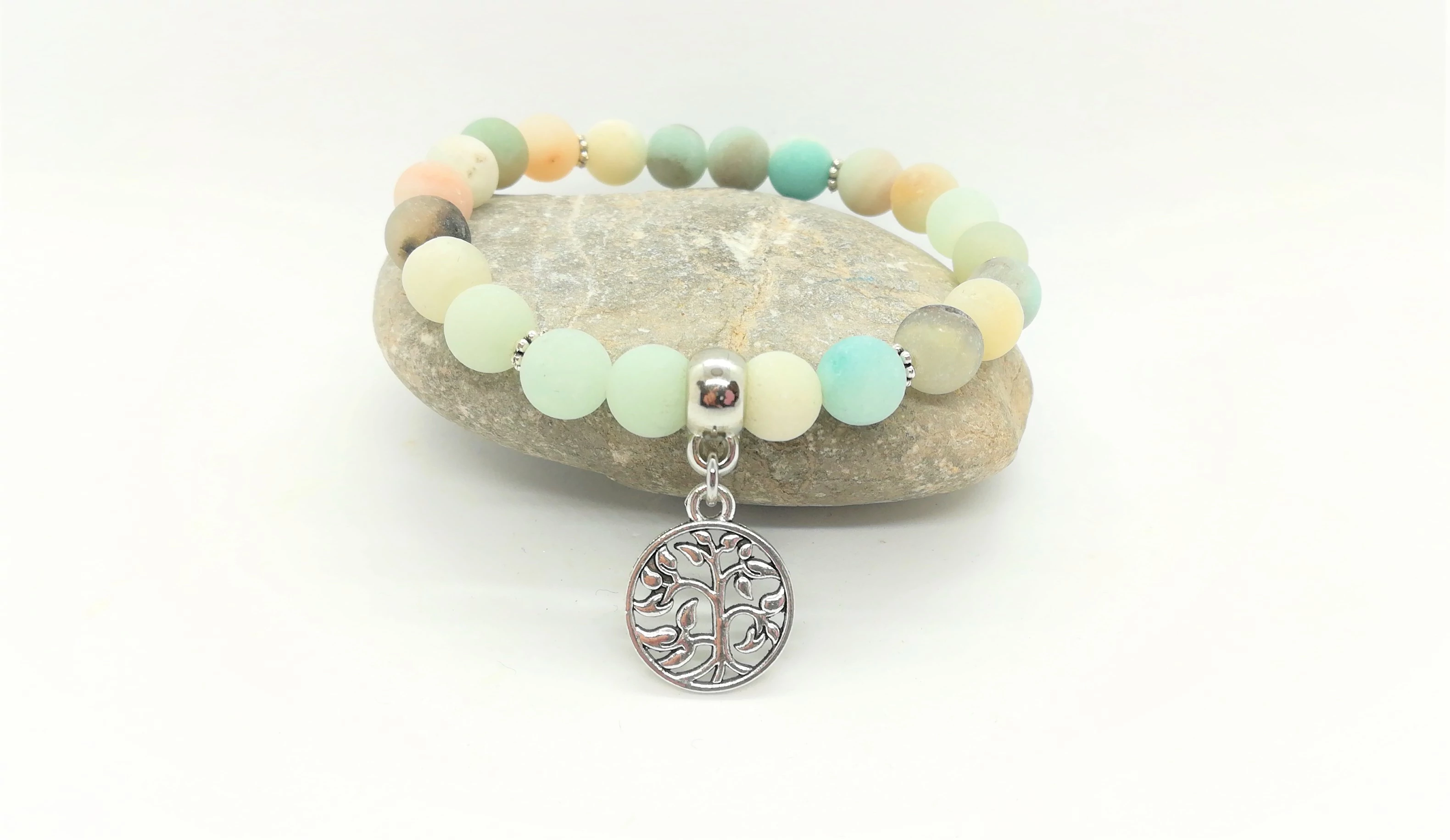 Egyedi tervezésű matt amazonit ásványokból készült karkötő, életfa medállal díszítve.