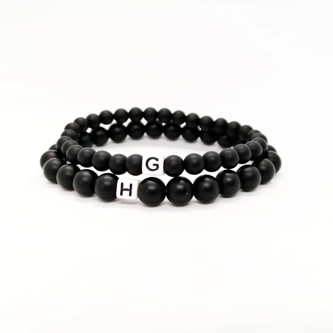 Gyönyörű egyedi szerelmi karkötőpár fekete ónixból egy-egy hófehér betűgyönggyel. A lenyíló fülek segítségével megtudod adni a nevetek kezdőbetűjét, illetve a karkötők méretét. A párok cserélni szoktak betűt, hogy egymás nevének kezdőbetűjét viseljék, ha te is így szeretnéd, ennek megfelelően add meg a betűket! Az ár egy pár (2db) karkötőre vonatkozik.