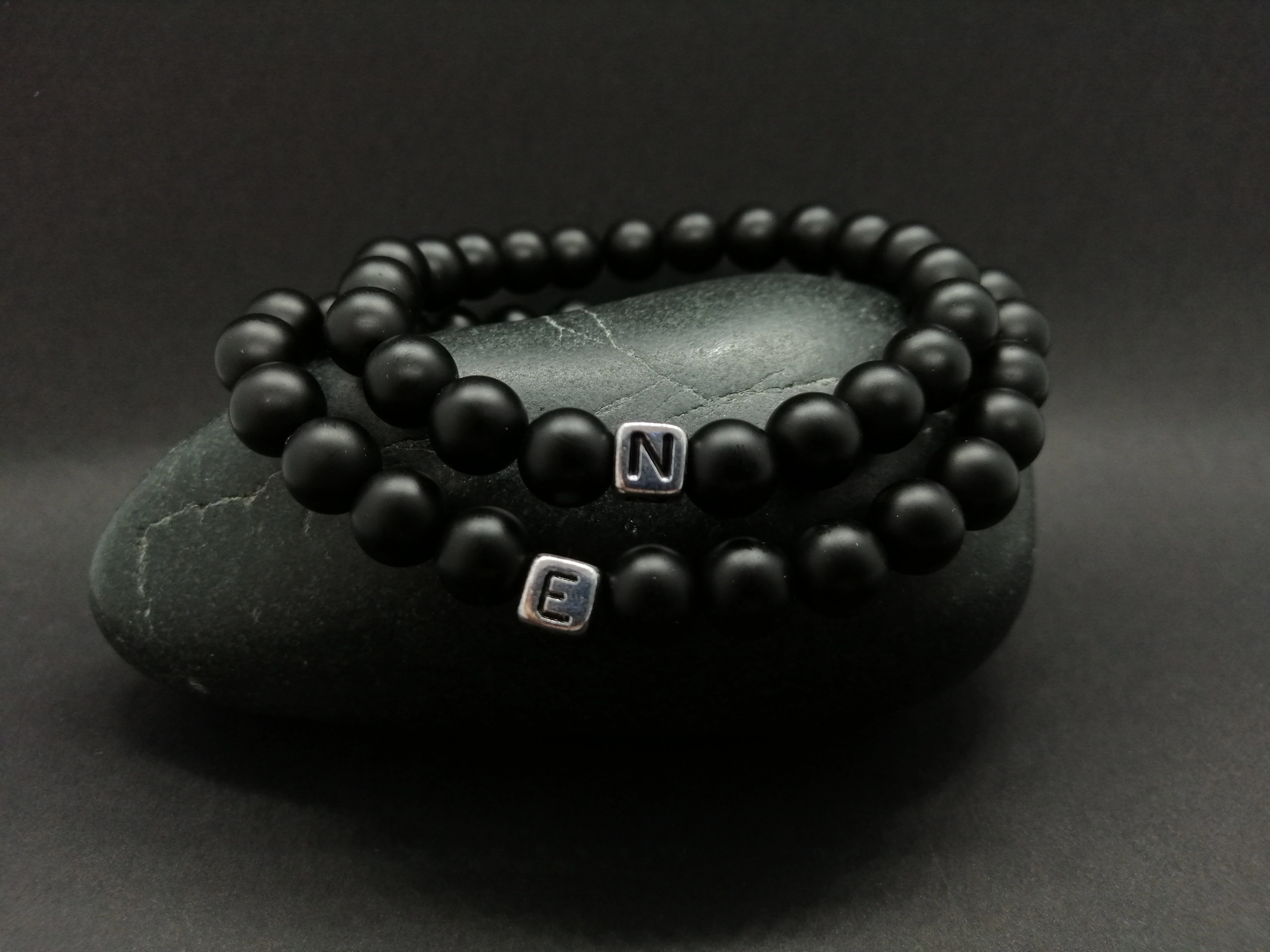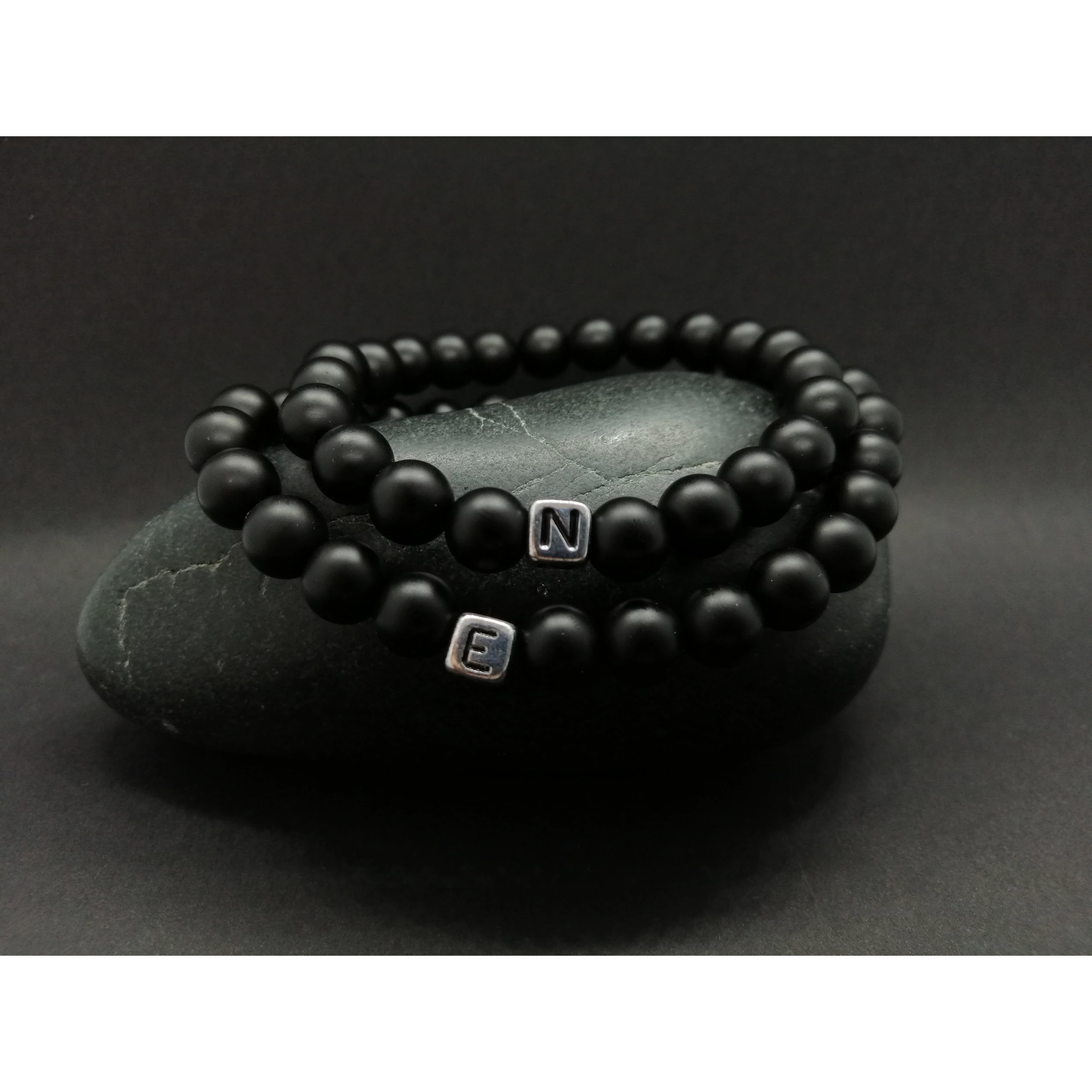 Matt fekete ónix szerelmi karkötőpár ezüst betűkkel