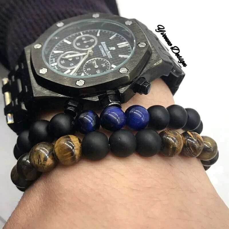 Ez egy gyönyörű egyedi tervezésű 8 mm átmérőjű gyöngyökből készült fekete ónix karkötő, kék vagy barna tigrisszem ásvánnyal.