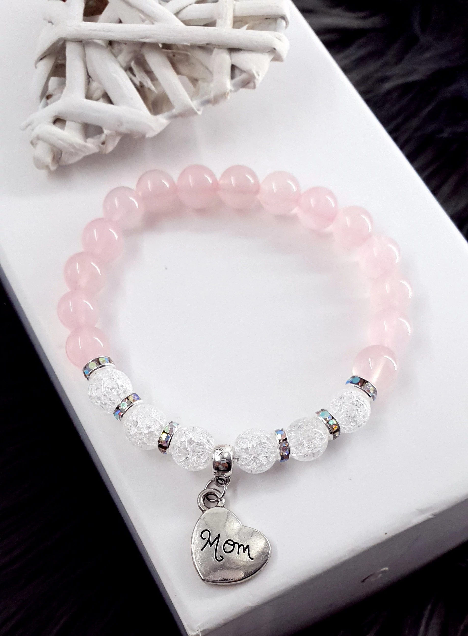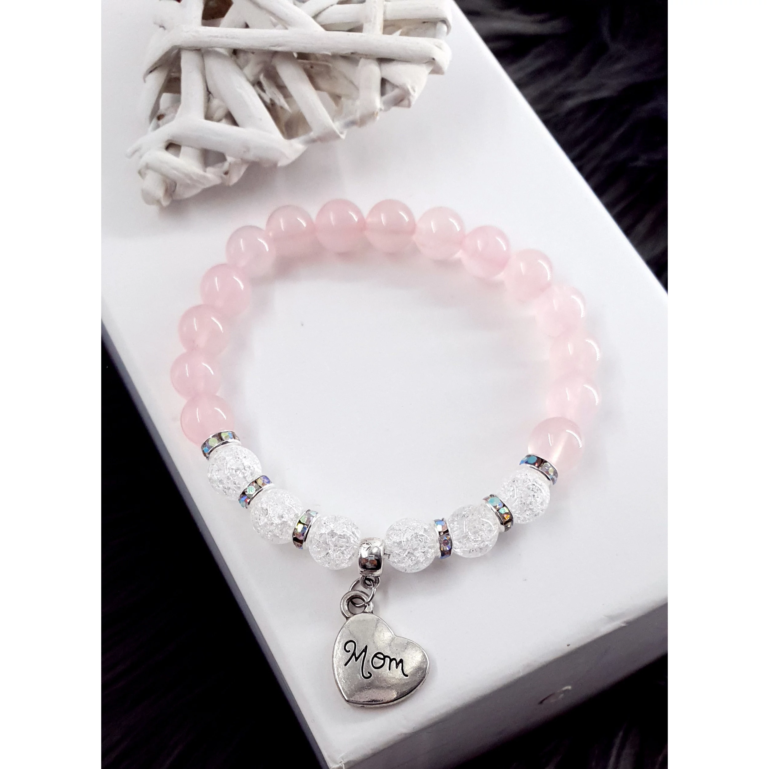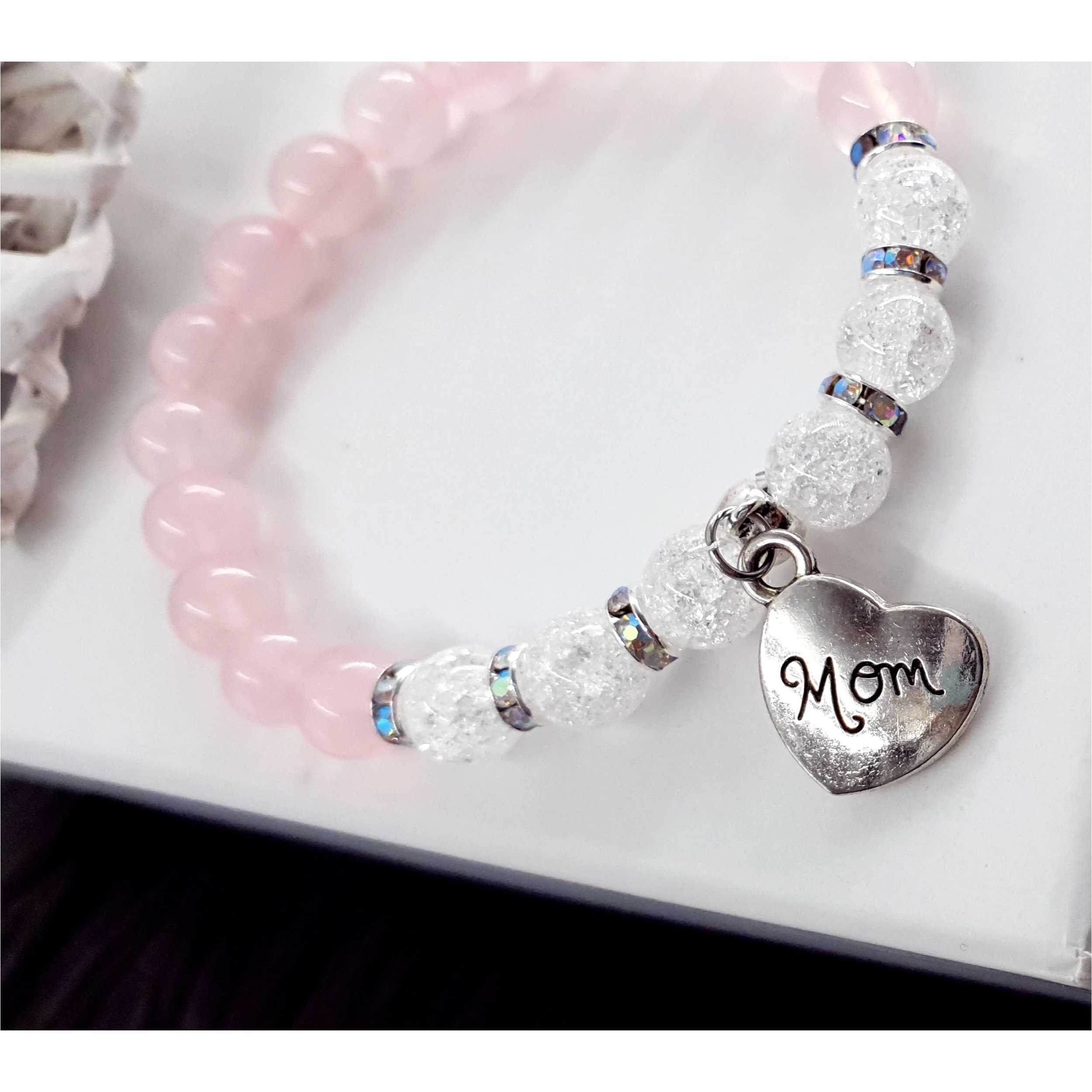 Gyönyörű hegyikristály és rózsakvarc ásványokból készített karkötő "MOM" (Anya) medállal.