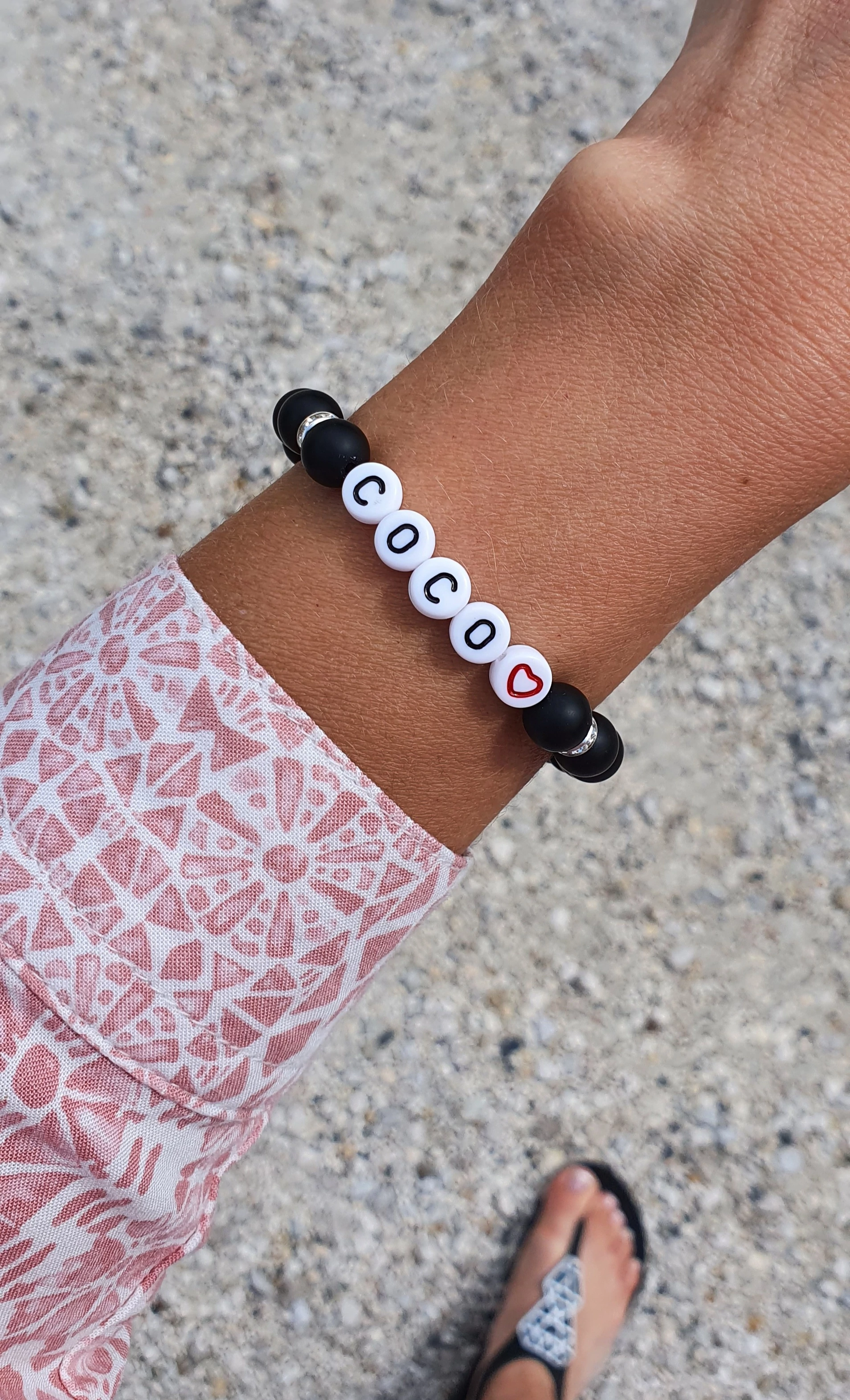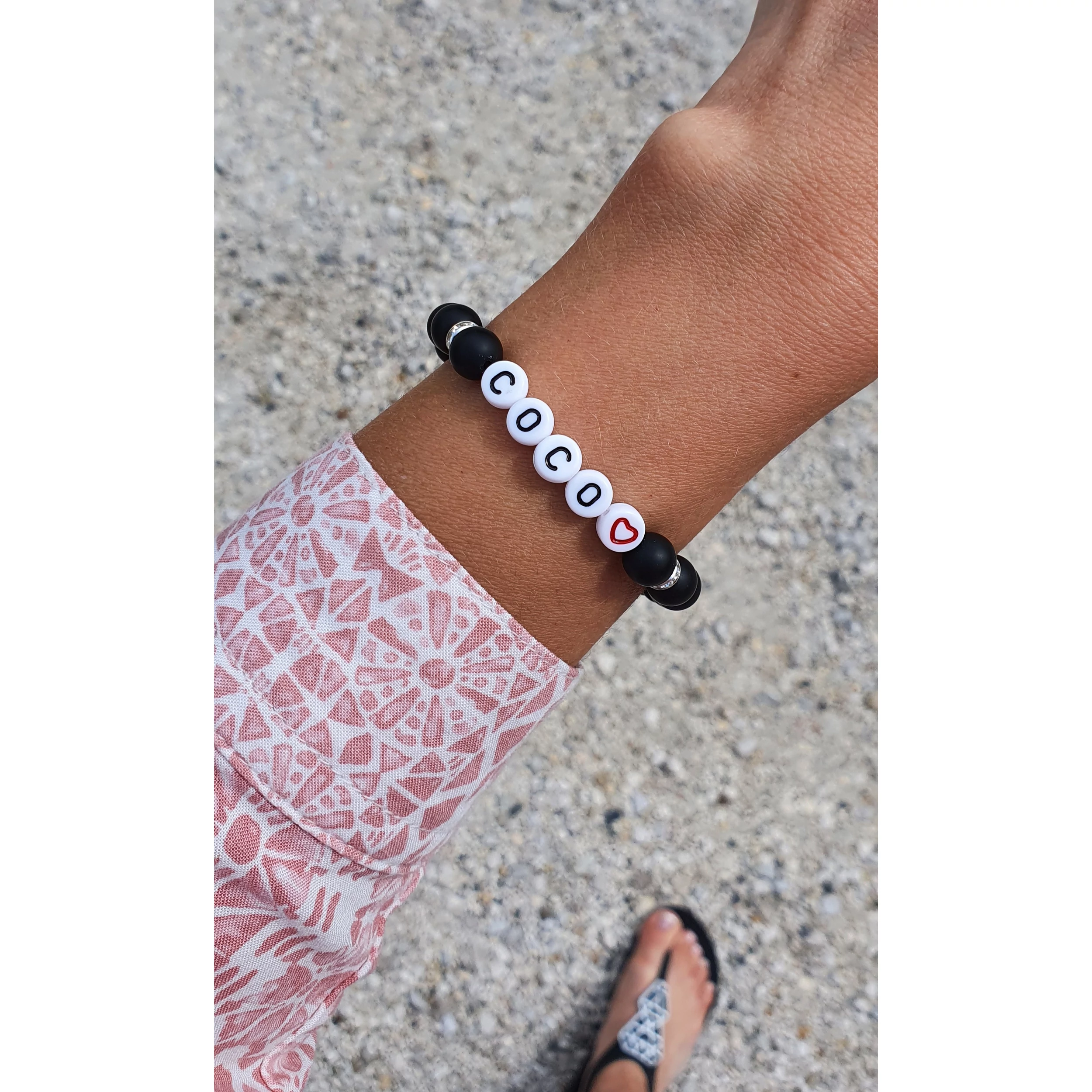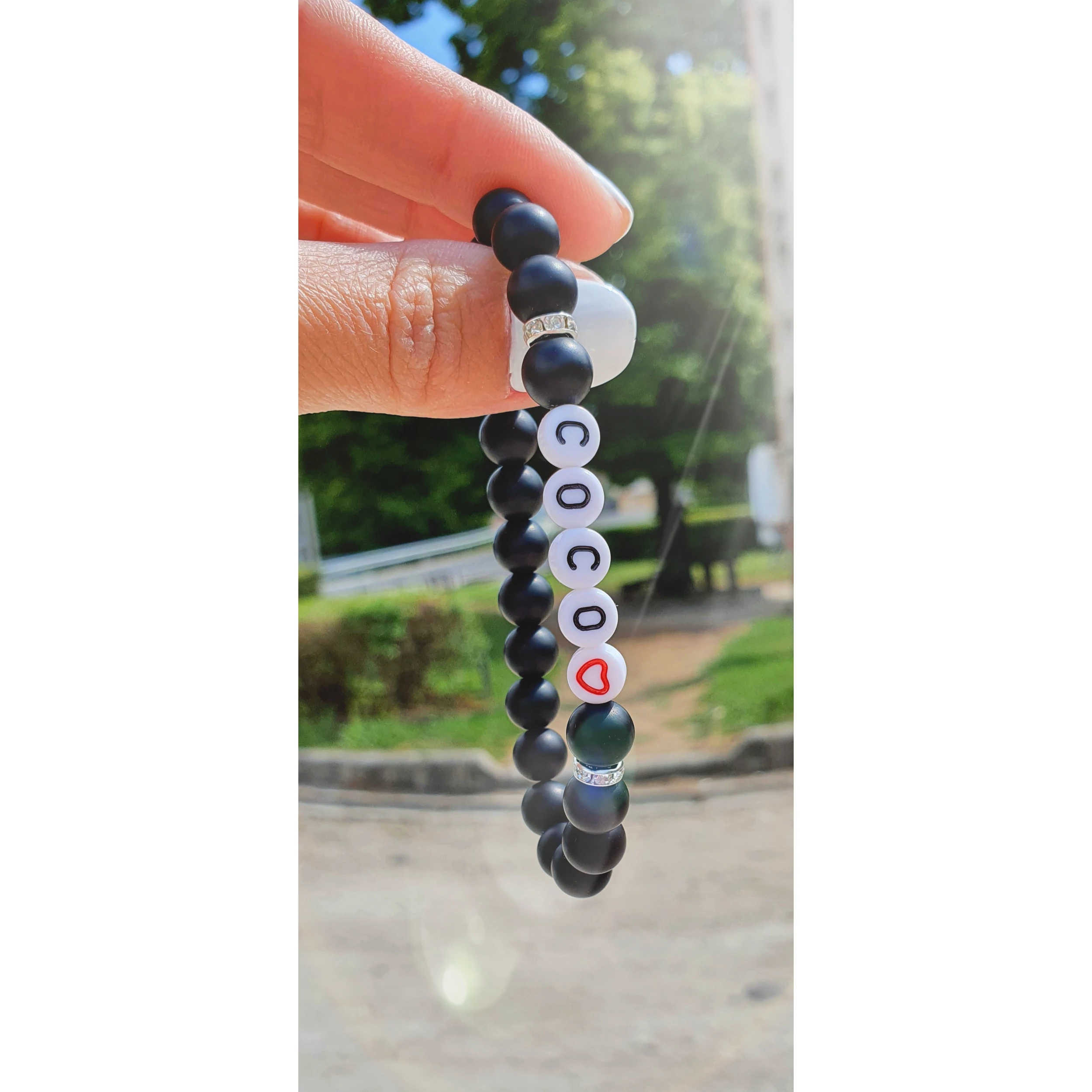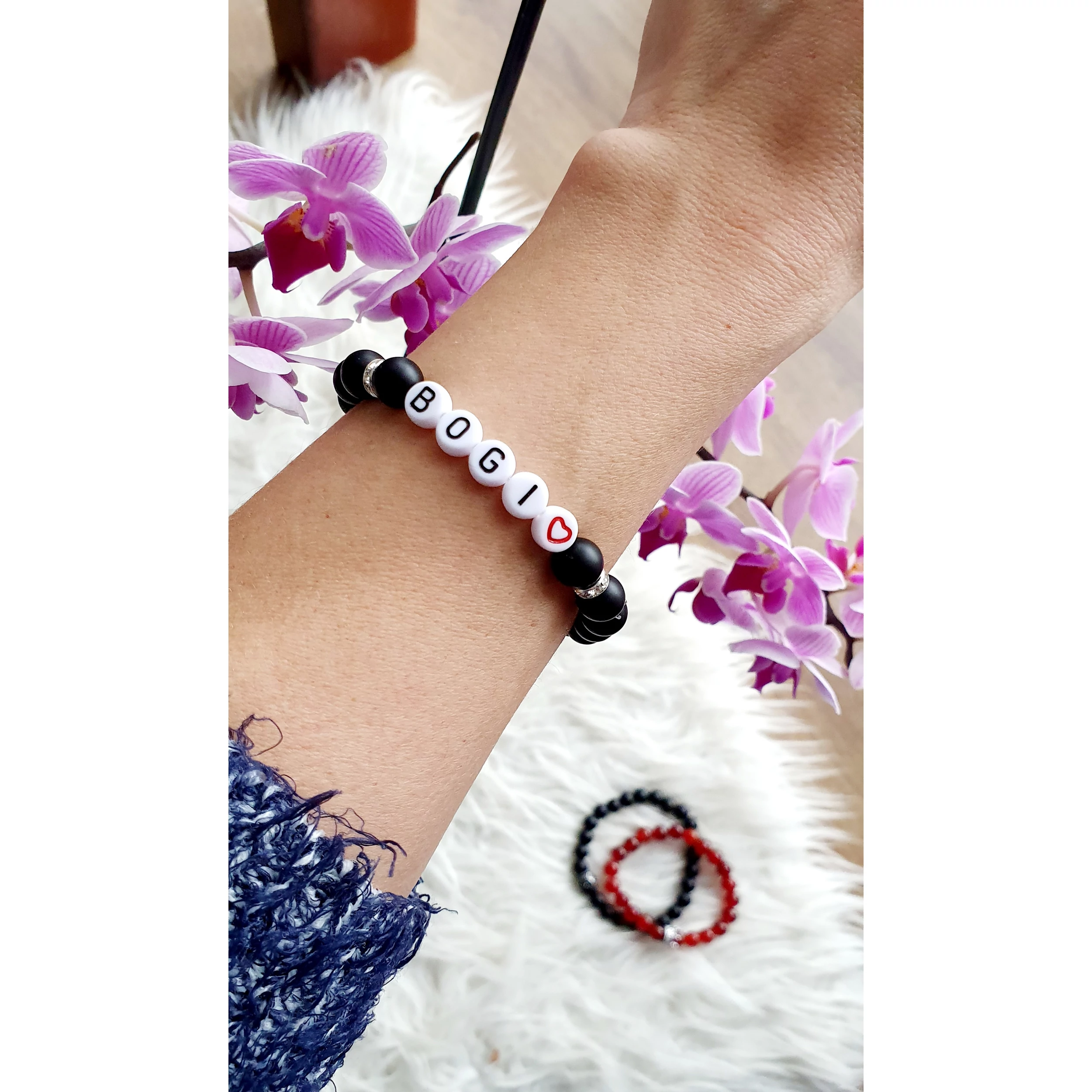 Csodálatos lehetőség, hogy gyermeked nevét magadon viseld! heartDe más, számodra fontos személy nevével, vagy akár a saját neveddel is készülhet  smiley  Ez az egyedi karkötő  matt ónix ásványokból készült, és egy nevet tartalmaz. A karkötő unisex, a vásárlásnál kiválaszthatod, hogy férfi vagy női változatot szeretnél (a díszítés miatt) illetve a betűgyöngy színét is kiválaszthatod, mely lehet fekete, fehér, vagy ezüst is.  A név egyedileg rendelhető hozzá,  a vásárlás végén a megjegyzés rovatban add meg nekünk!