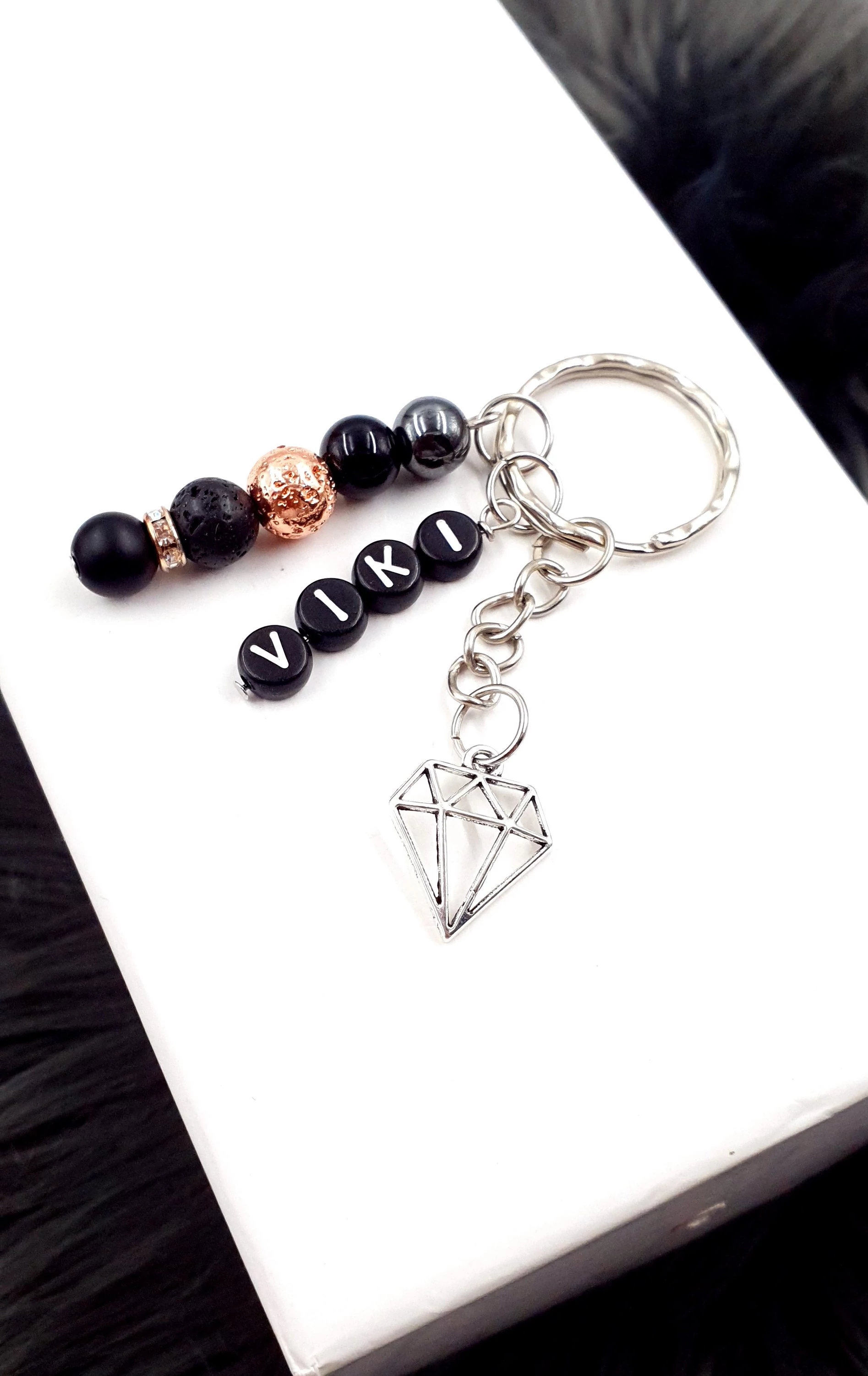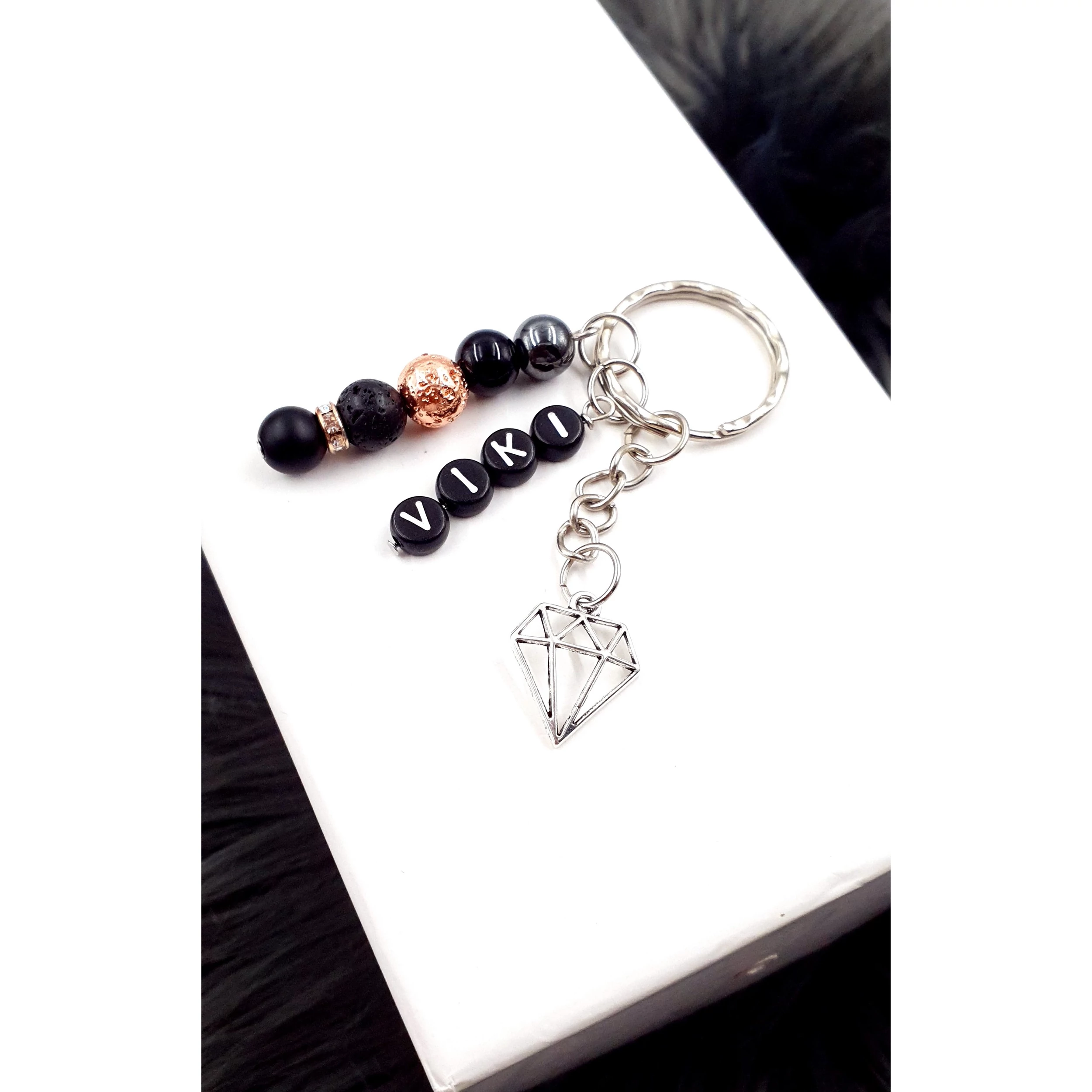 Névvel ellátott feliratos kulcstartó fekete-rosegold színben, mely még tartalmaz egy gyémánt medálkát és egy ásványos díszes medálkát is.