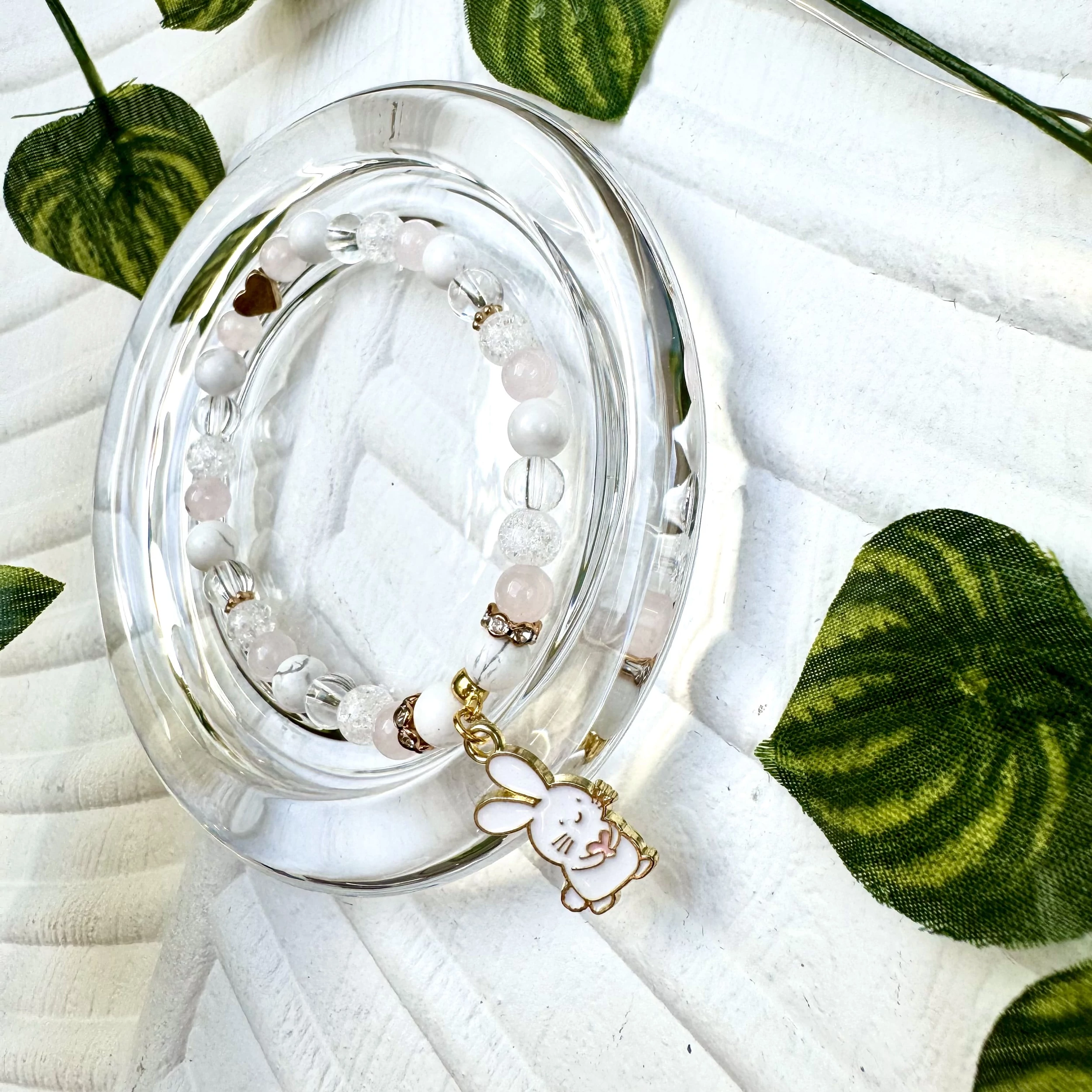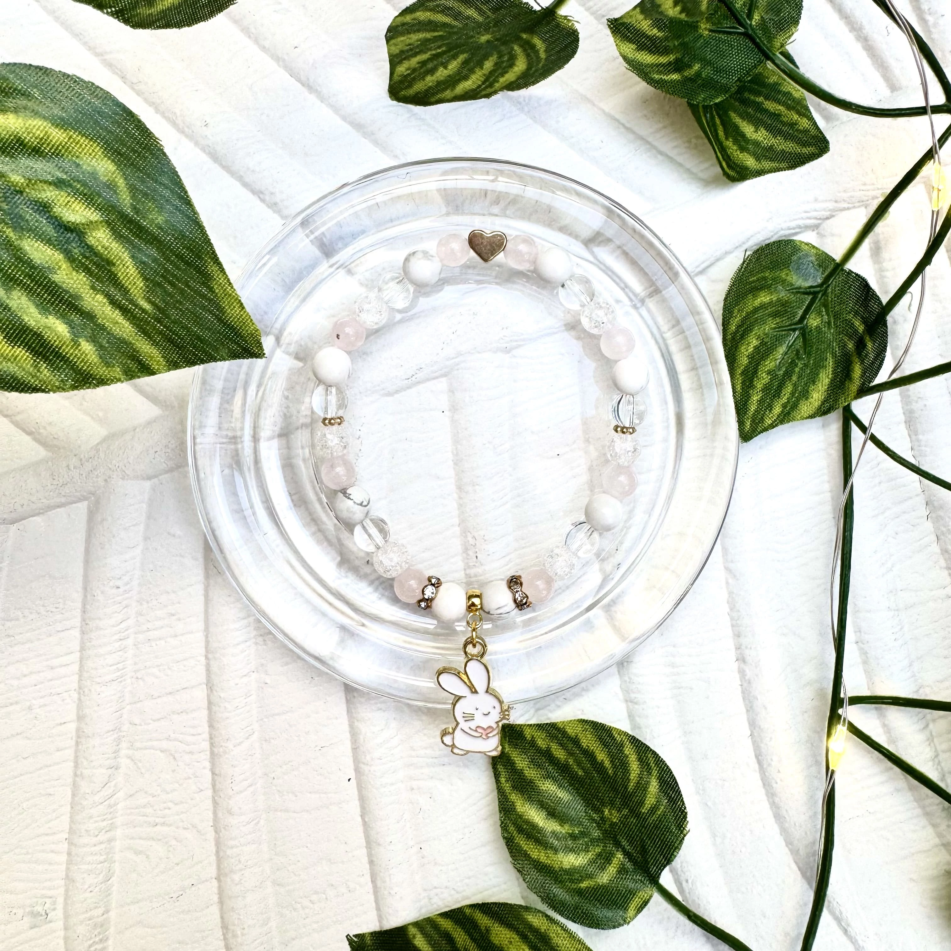Egyedi, elegáns szívecskés nyuszi medálos ásványkarkötő, mely 6 mm-es hegyikristály, rózsakvarc, roppantott hegyikristály és howlit ásványokból készült. Limitált kiadás!