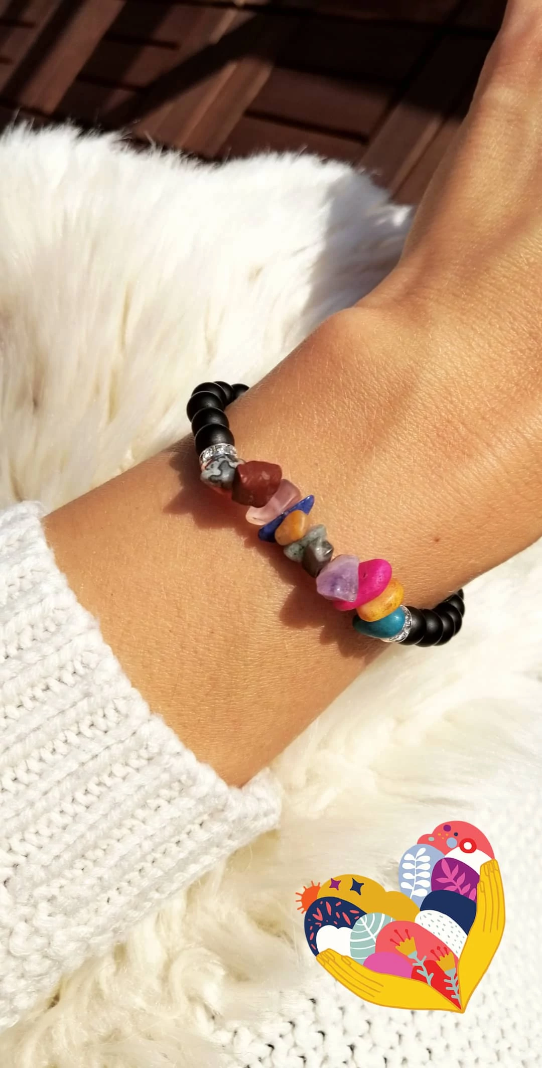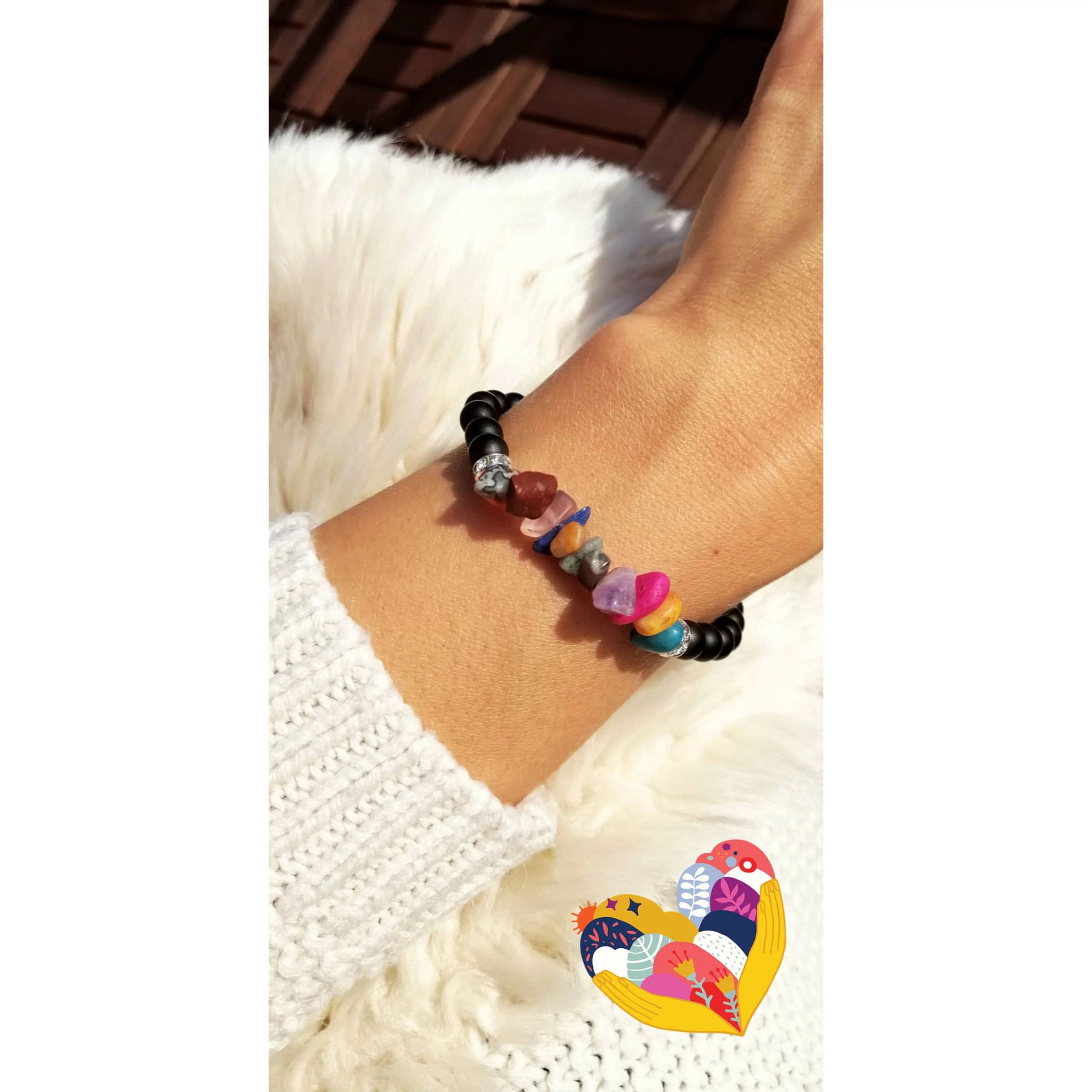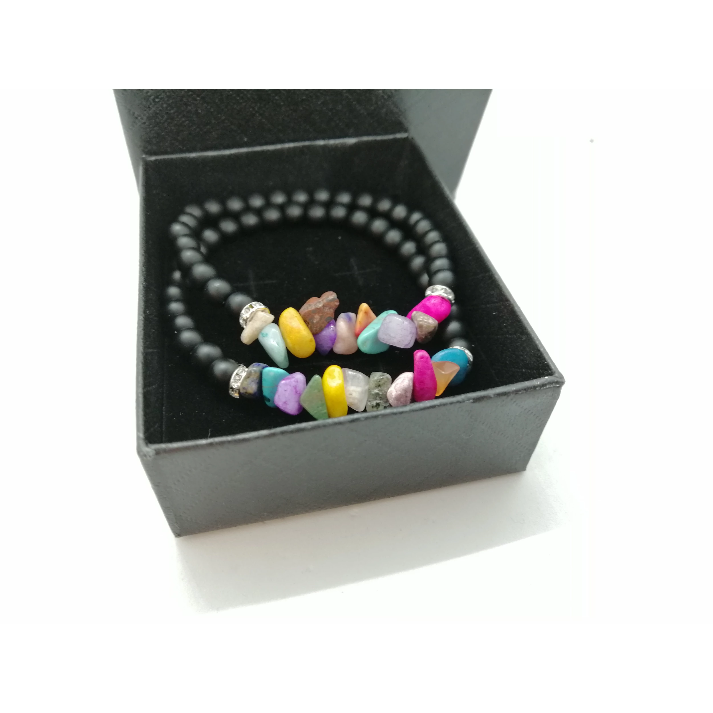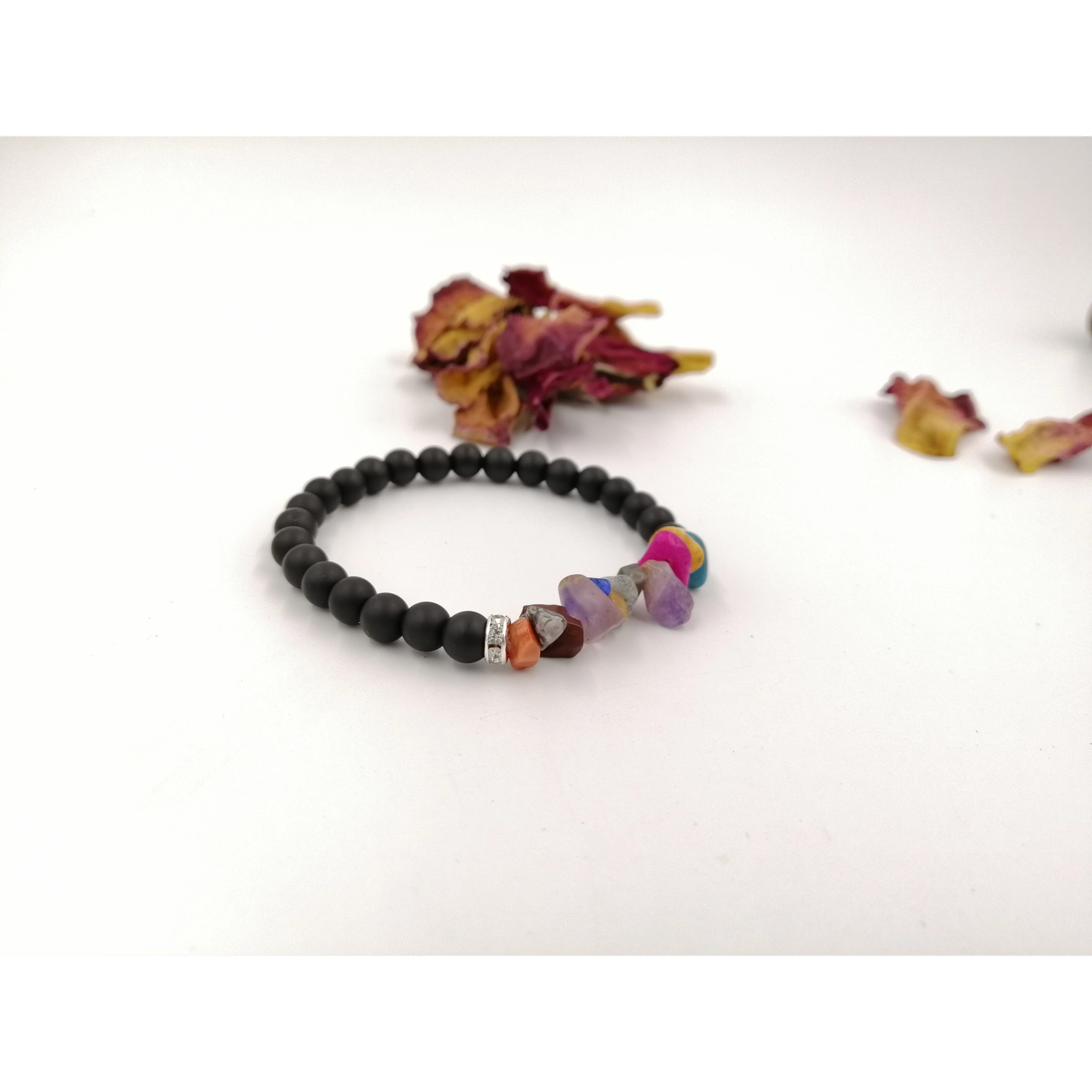 Egyedi tervezésű 6 mm fekete ónix és nagyon apró 6-8 mm-es ásványkavicsokból össze állított finom egyedi ásványkarkötő. (Az apró ásványkavicsok összeállítása változhat karkötőnként.)