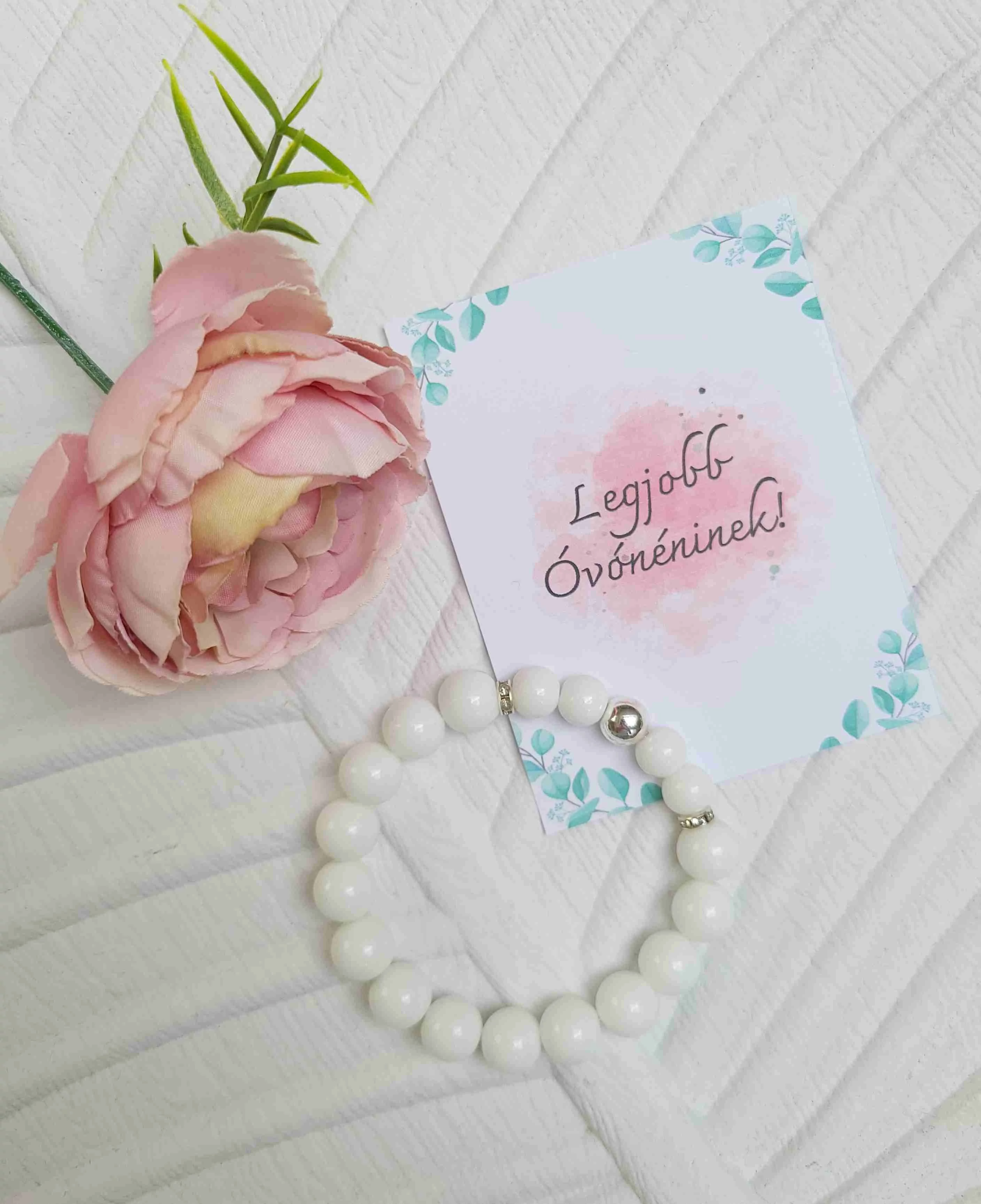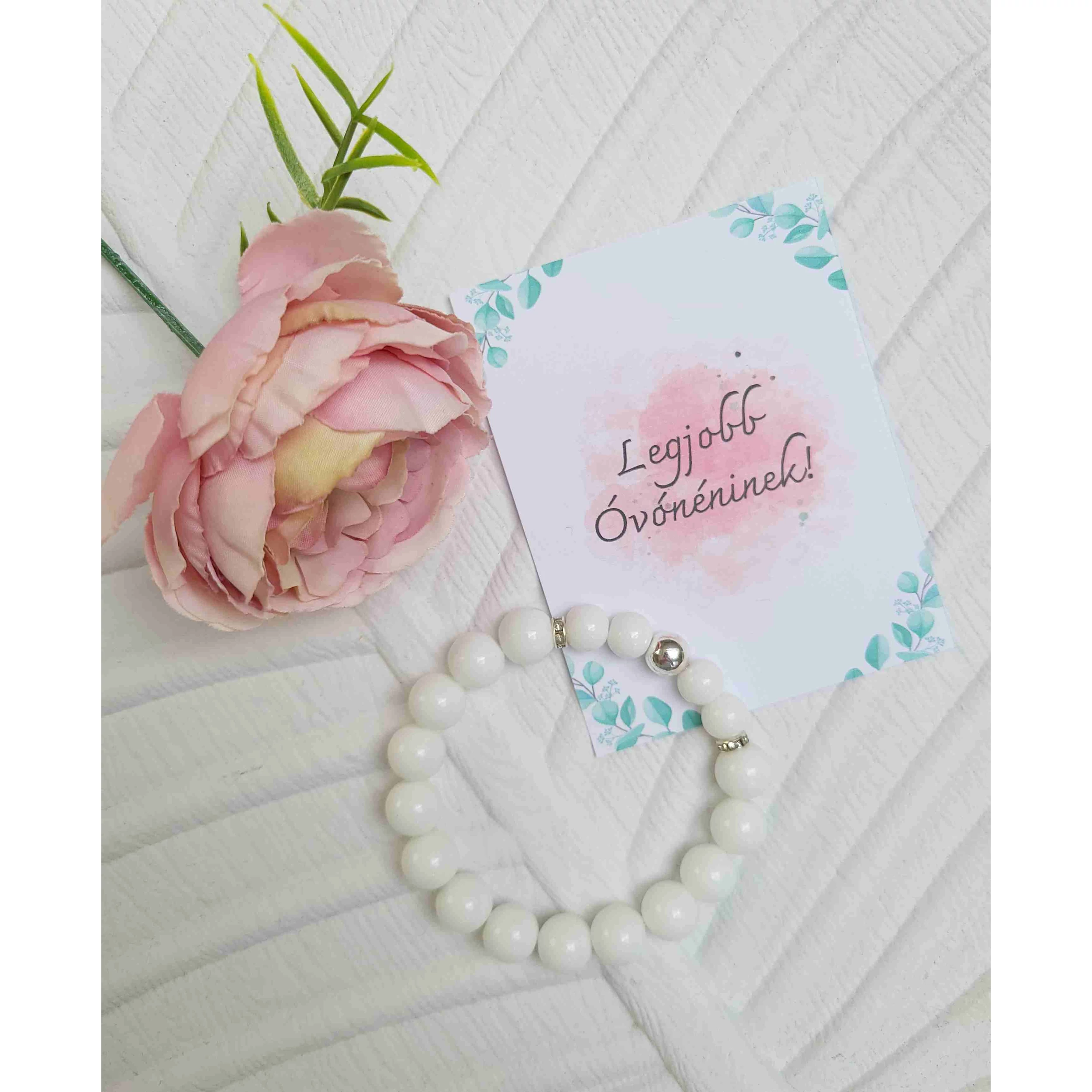 Dadusnak, Óvónéninek, tanár néninek köszönő ajándék. A karkötő 10 mm ásványokból lettek készítve: tejkvarc, ezüstre fújt hematit. Az ajándékszett része a karkötő, az üzenetes kártya, és egy tüll tasak, amiben küldjük. Amennyiben változtatni szeretnél az üzeneten, kérlek idézőjelben add meg nekünk, hogy egyértelmű legyen számunkra, mit szeretnél látni a díszdoboz belsejében! Ez a szívhez szóló személyes ajándékot Te teszed különlegessé, egészen biztos, hogy sikert arat és örök élmény marad!