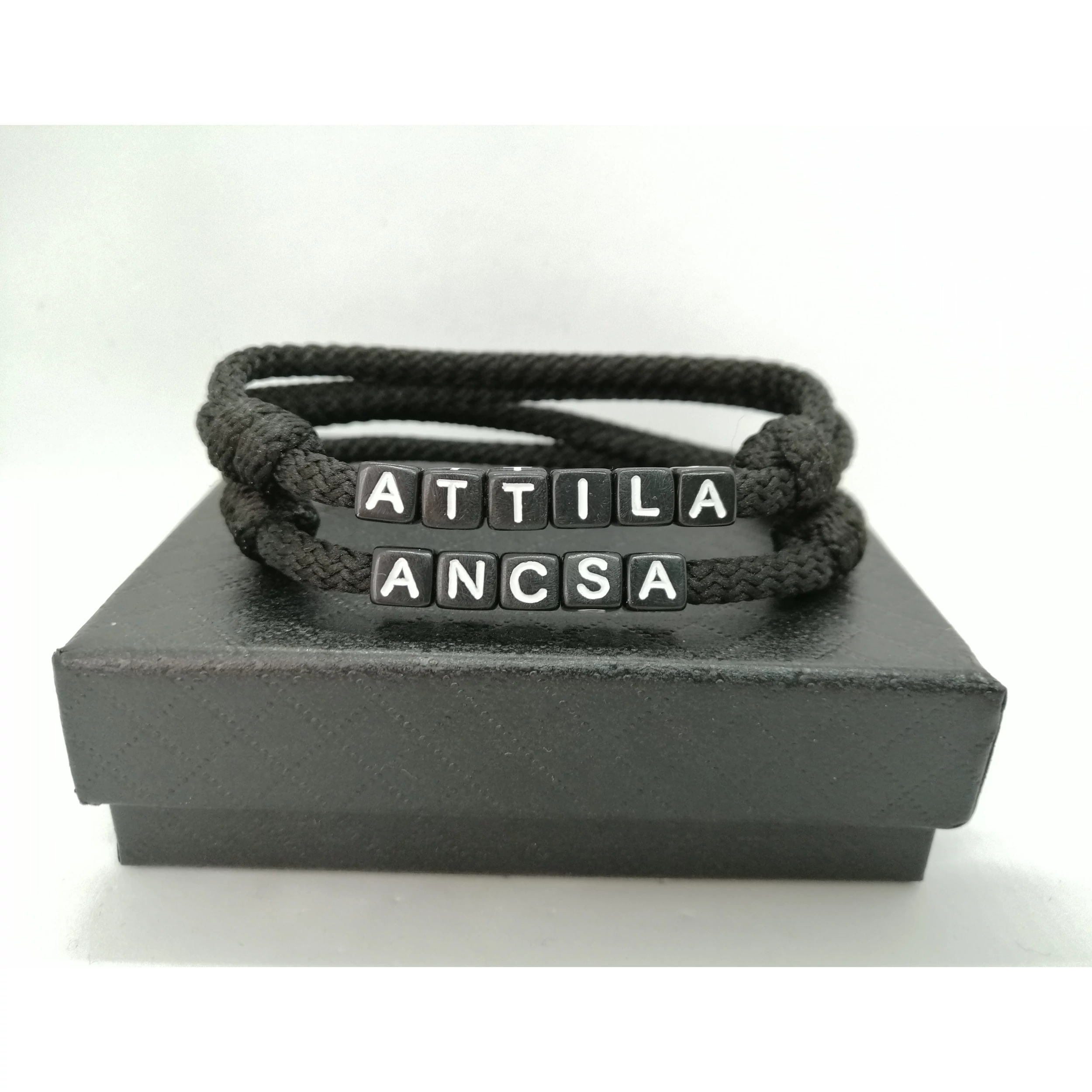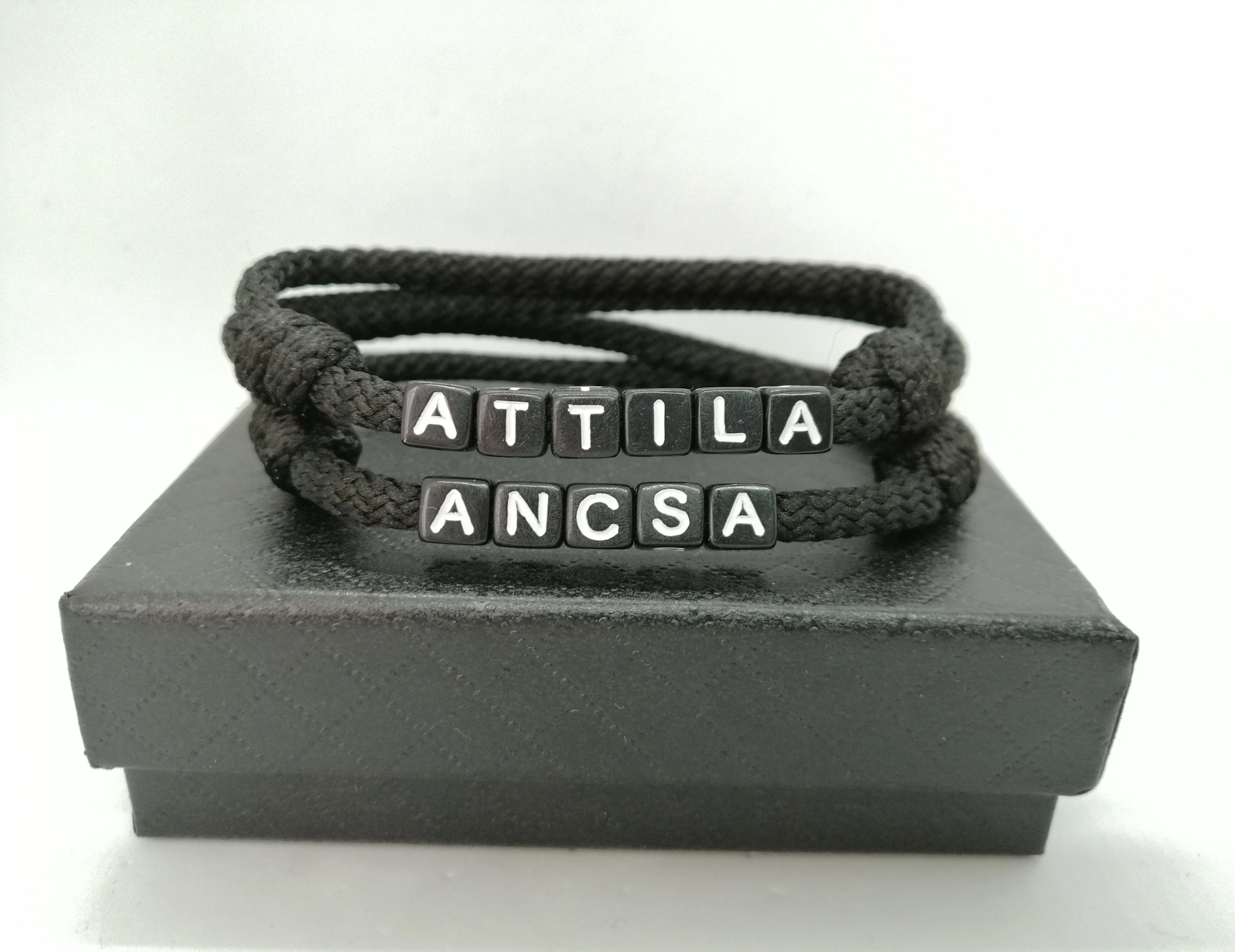 Ez az egyedi karkötő, fekete parakord zsinórból készült, csomózásos technikával, a karkötő csúszócsomókkal van ellátva, mellyel be lehet állítania a méretet felvételkor. A karkötőn pontos precíz eldolgozások vannak, gyönyörű, hibátlan tökéletes darabot fogsz kézhez kapni! Az ár egy pár (2db) karkötőre vonatkozik. Az egyedi nevet a vásárlás végén a "Megjegyzés" rovatban írd meg nekünk.