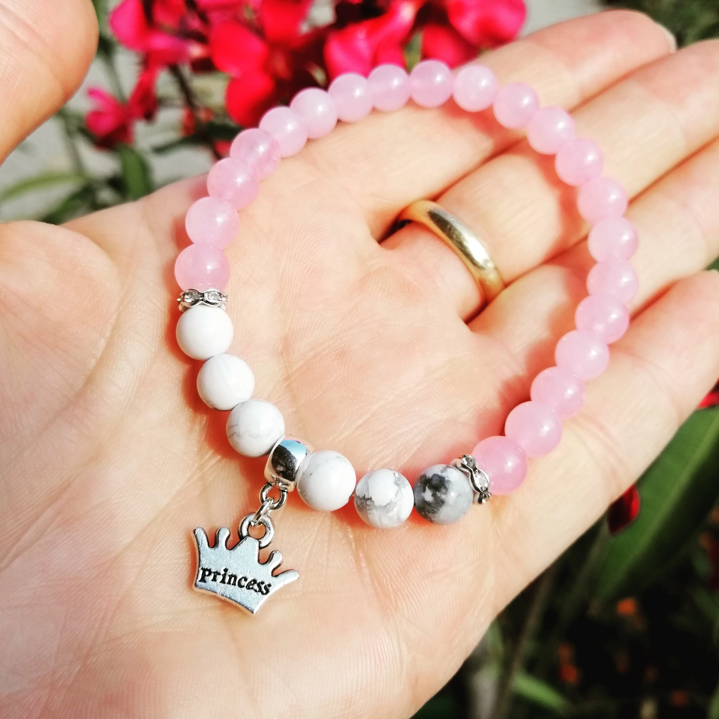 Egyedi tervezésű rózsakvarc- howlit ásványokból készült karkötő, princess medállal díszítve.
