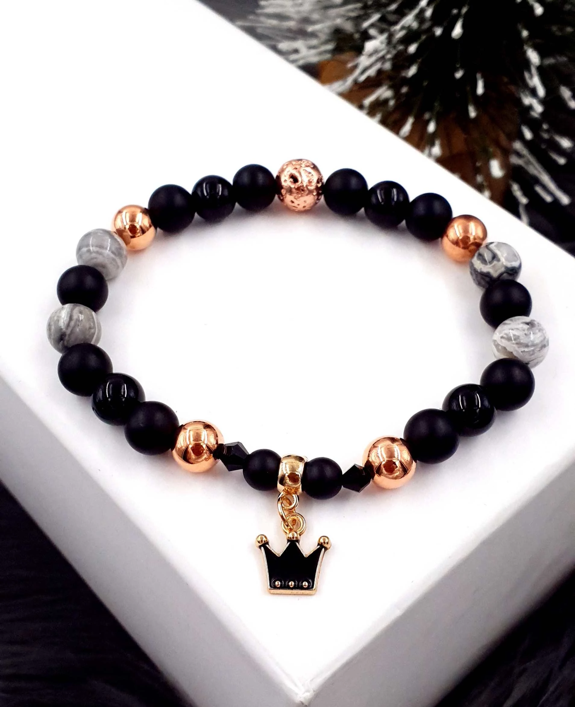 Gyönyörű egyedi Yvonne Design LUXURY ásványkarkötő, mely hegyikristályból, achátból, tejkvacból és jáspisból készült, rosegold szín díszítéssel és cirkon medállal.