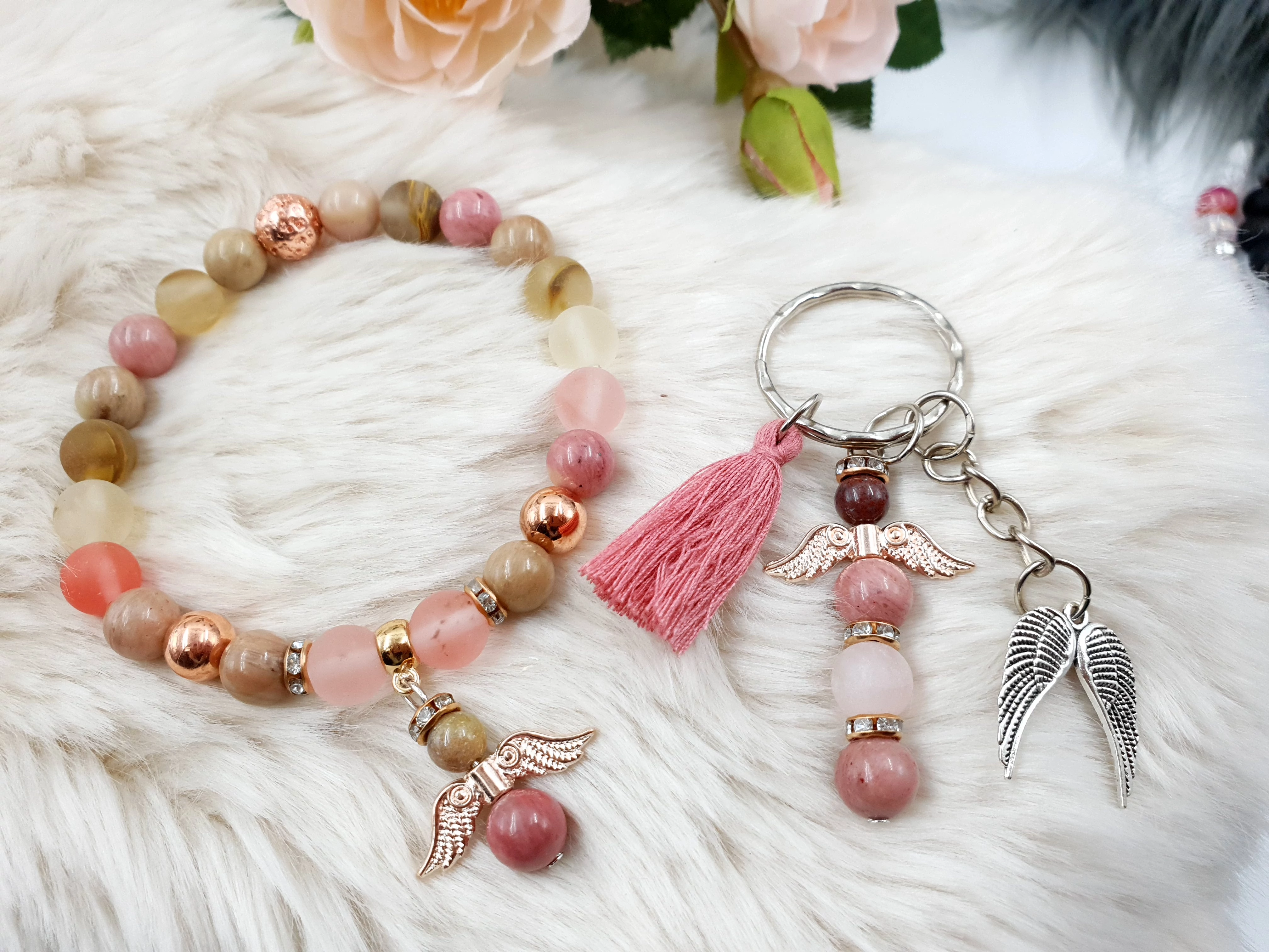 Ékszerszett, mely egy ásványkarkötőből és egy kulcstartóból áll.