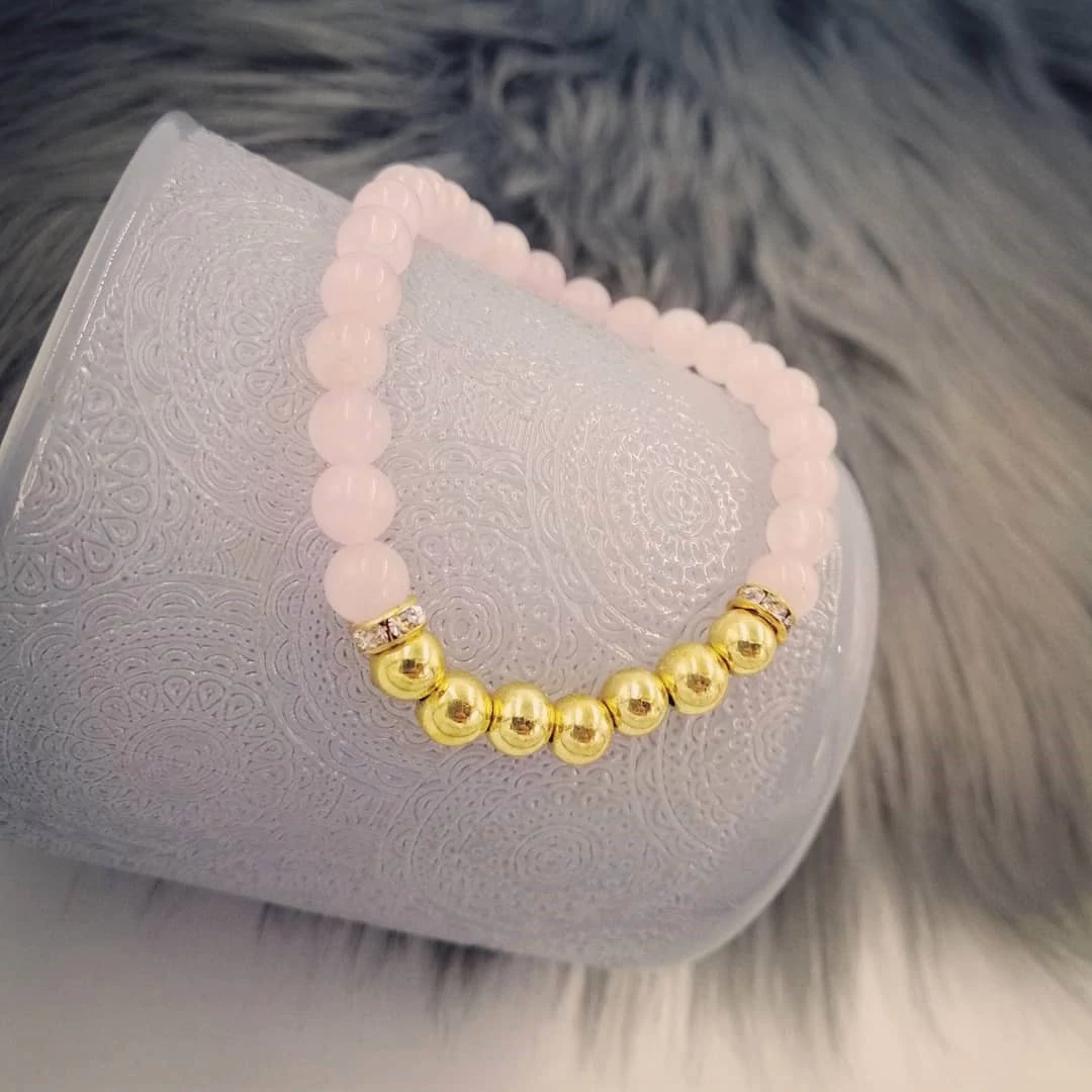 Rózsakvarc ásványkarkötő arany díszítéssel