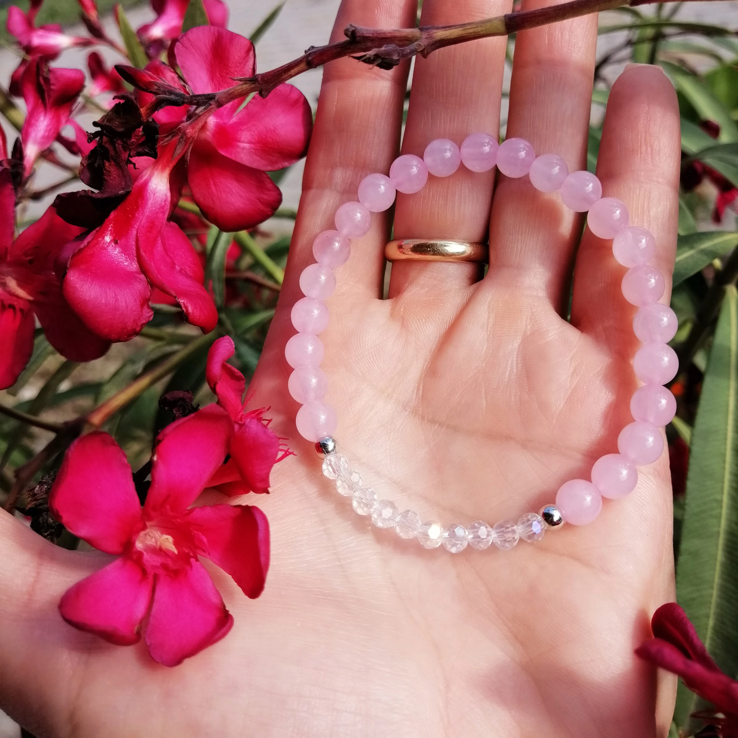 Egyedi tervezésű 6 mm rózsavarc és 4 mm csillogó fazettált mikrokristáy gyöngyökből készült karkötő. Nagyon kifinomult exkluzív darab, mely minden öltözéket feldob.