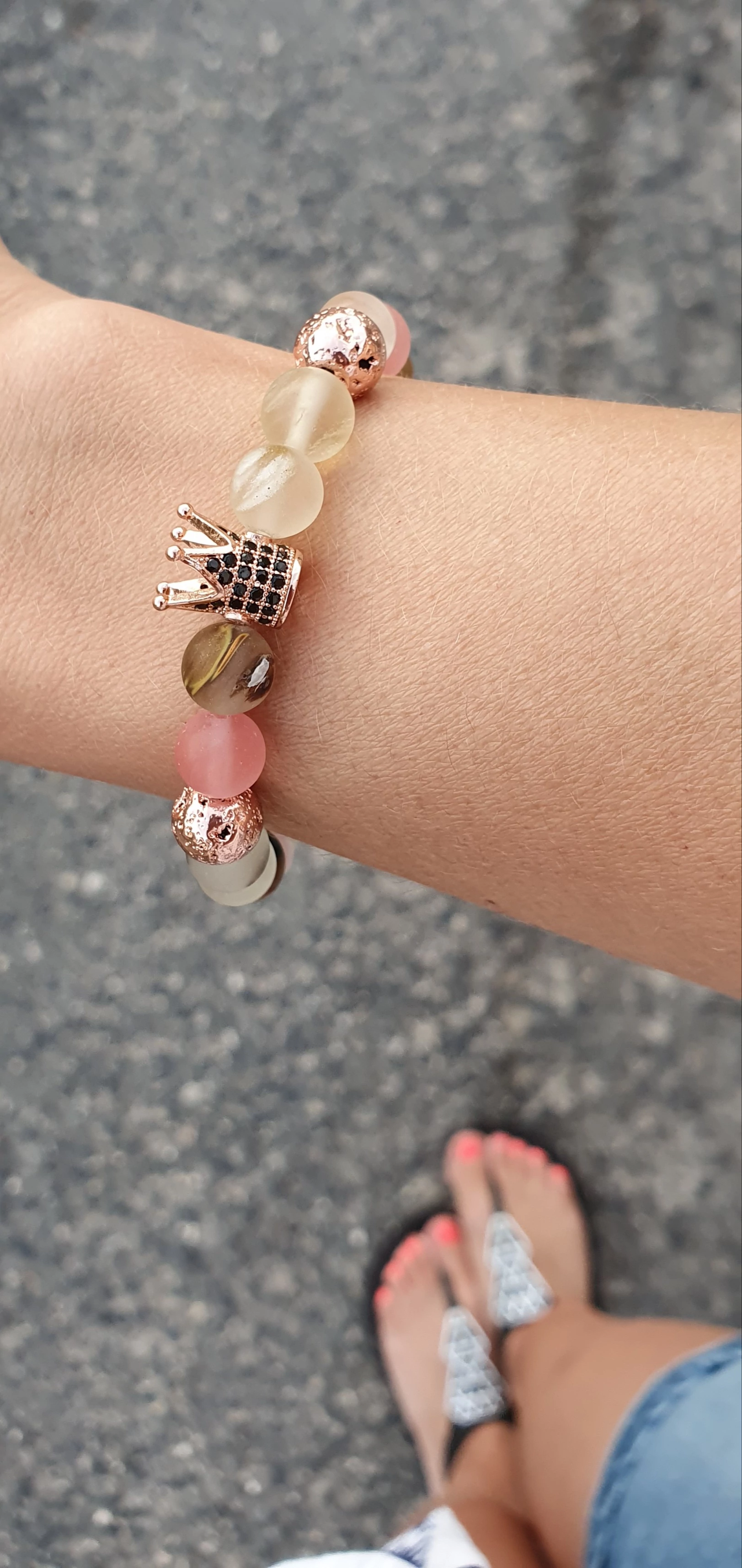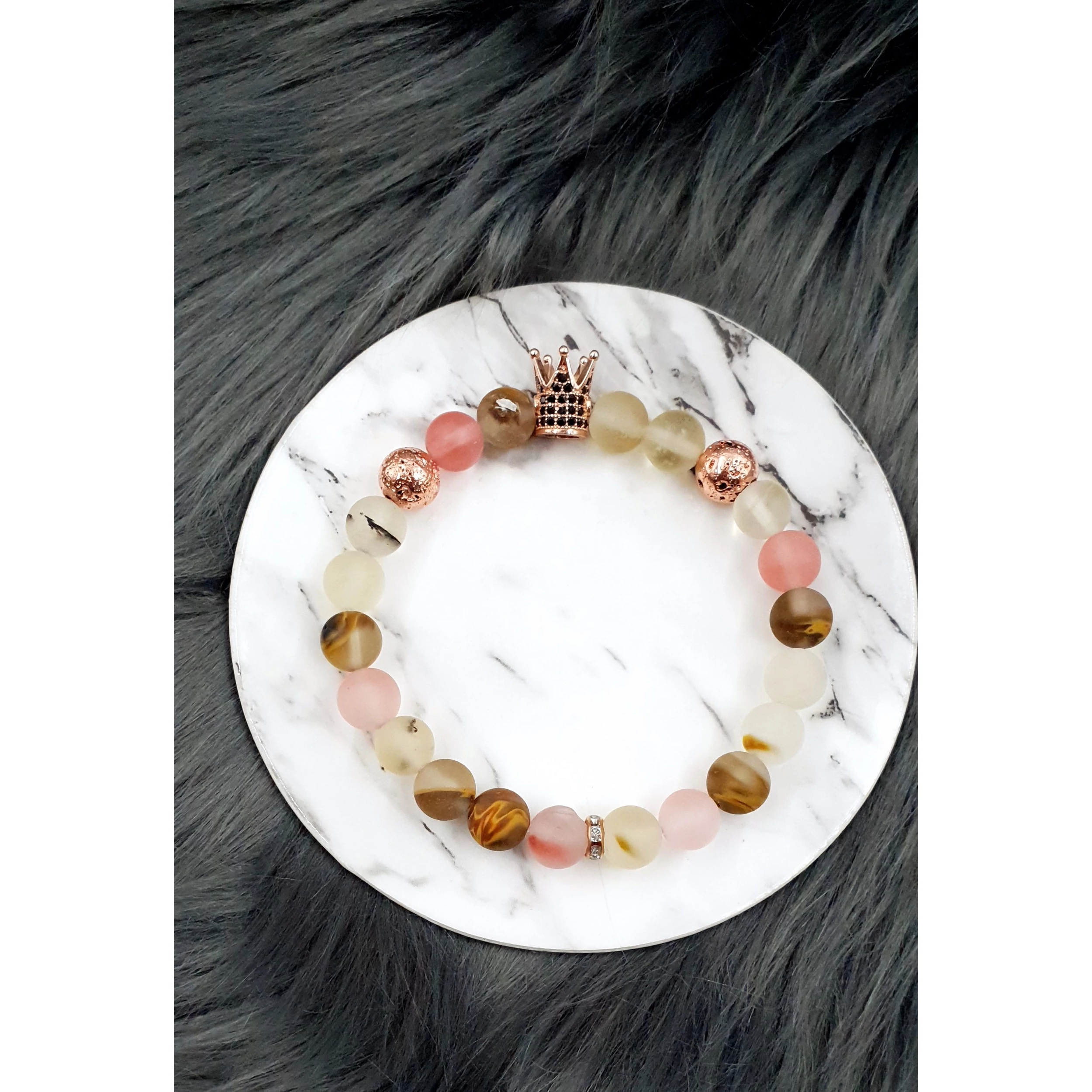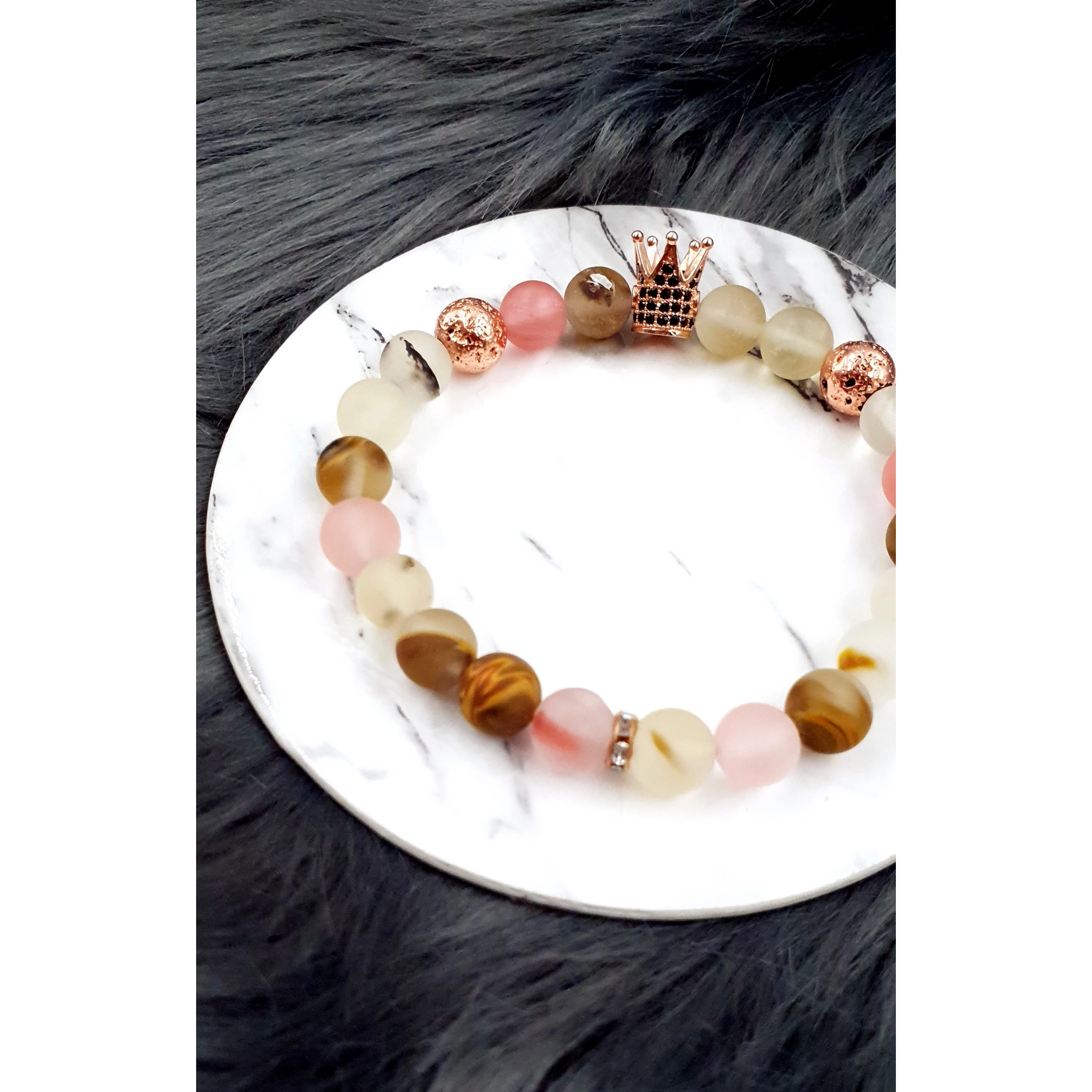 Gyönyörű egyedi LUXURY ásványkarkötő rosegold szín korona medállal és díszítéssel, matt rózsaopál ásványokból készítve.