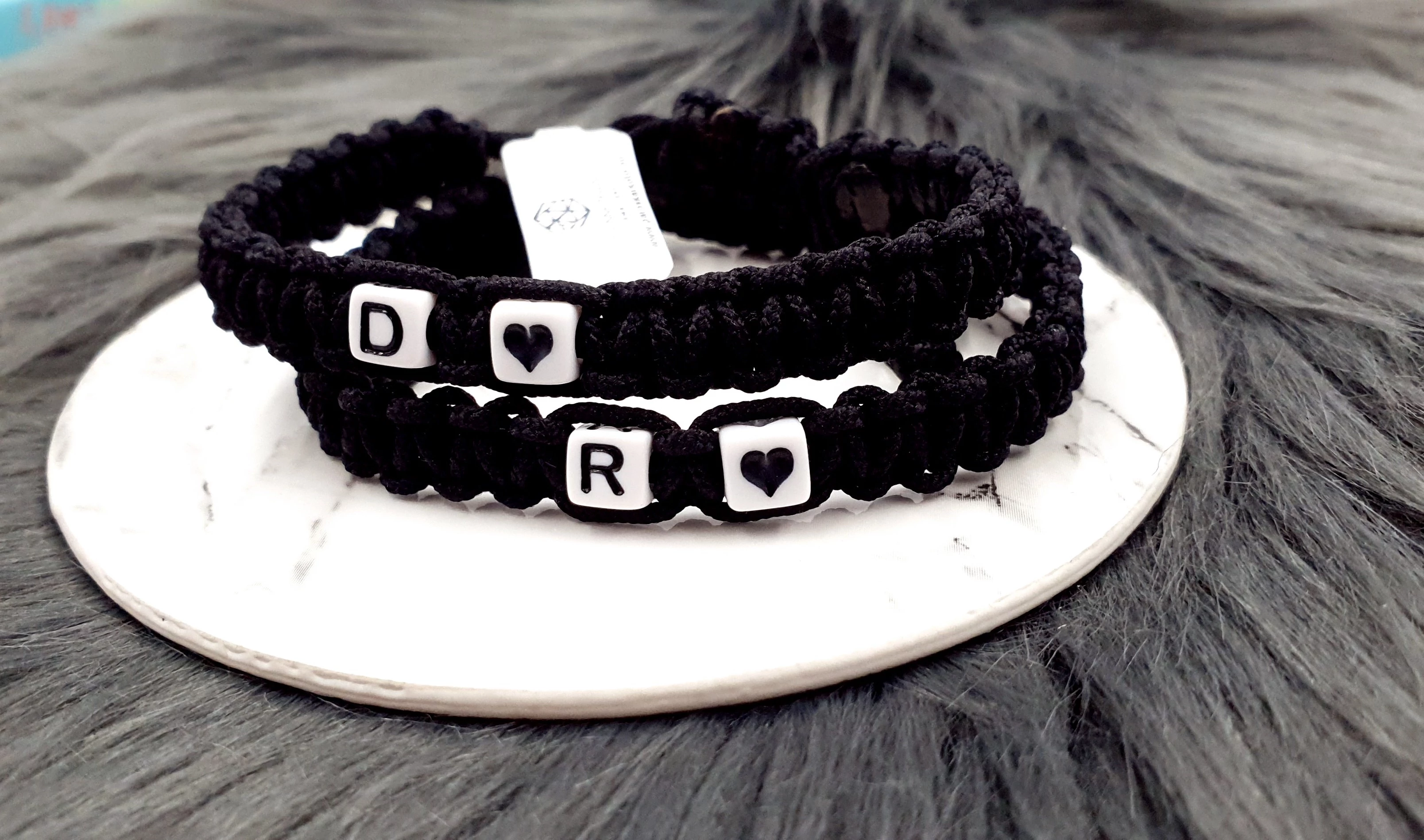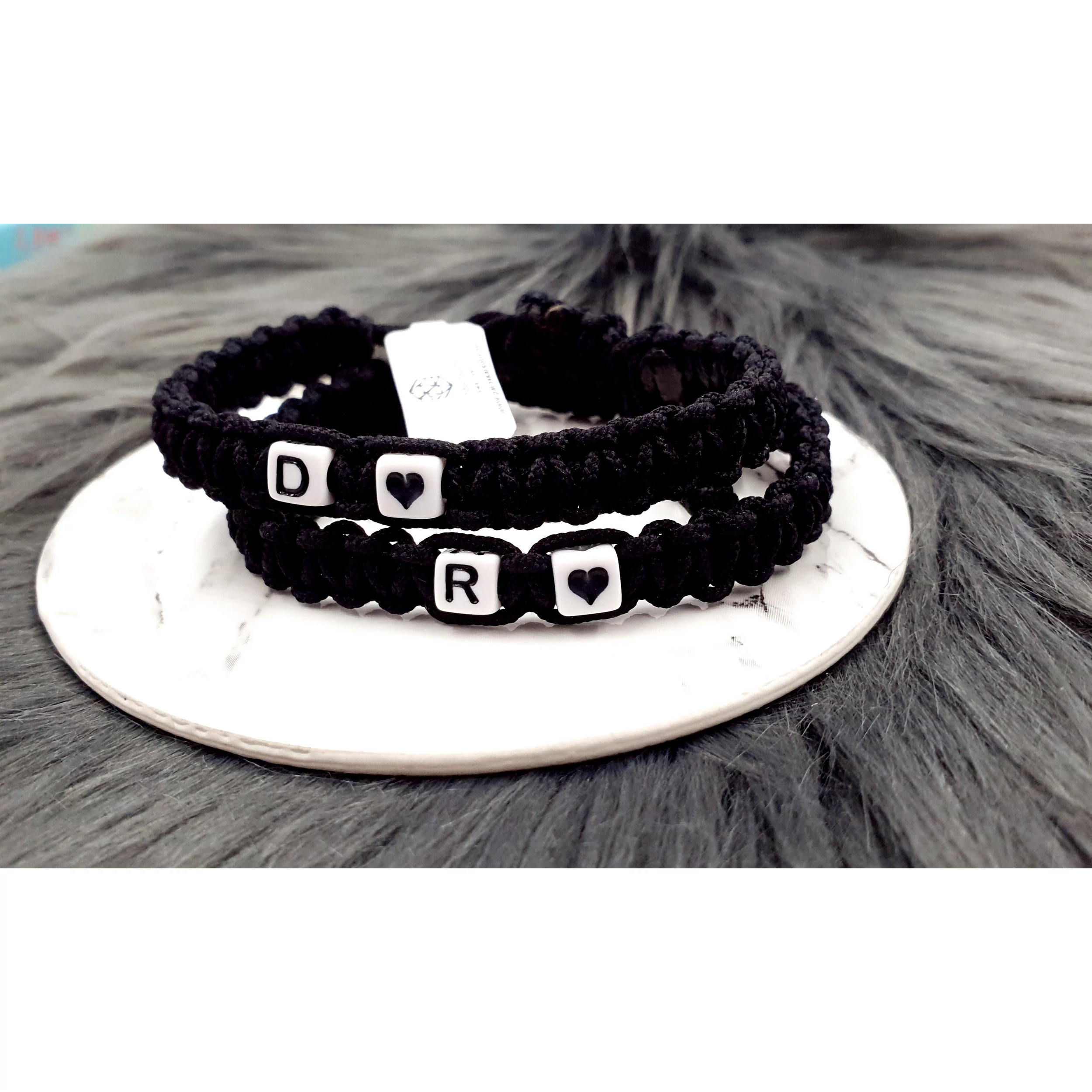 Gyönyörű egyedi, betűs szerelmi pároskarkötő, mely vékony parakord zsinórból font és egy betűt plusz egy fekete szívecskét tartalmaz. Az ár egy pár (2db) karkötőre vonatkozik. A zsinór és a betűk is kiemelkedő minőségűek és kopásállóak!