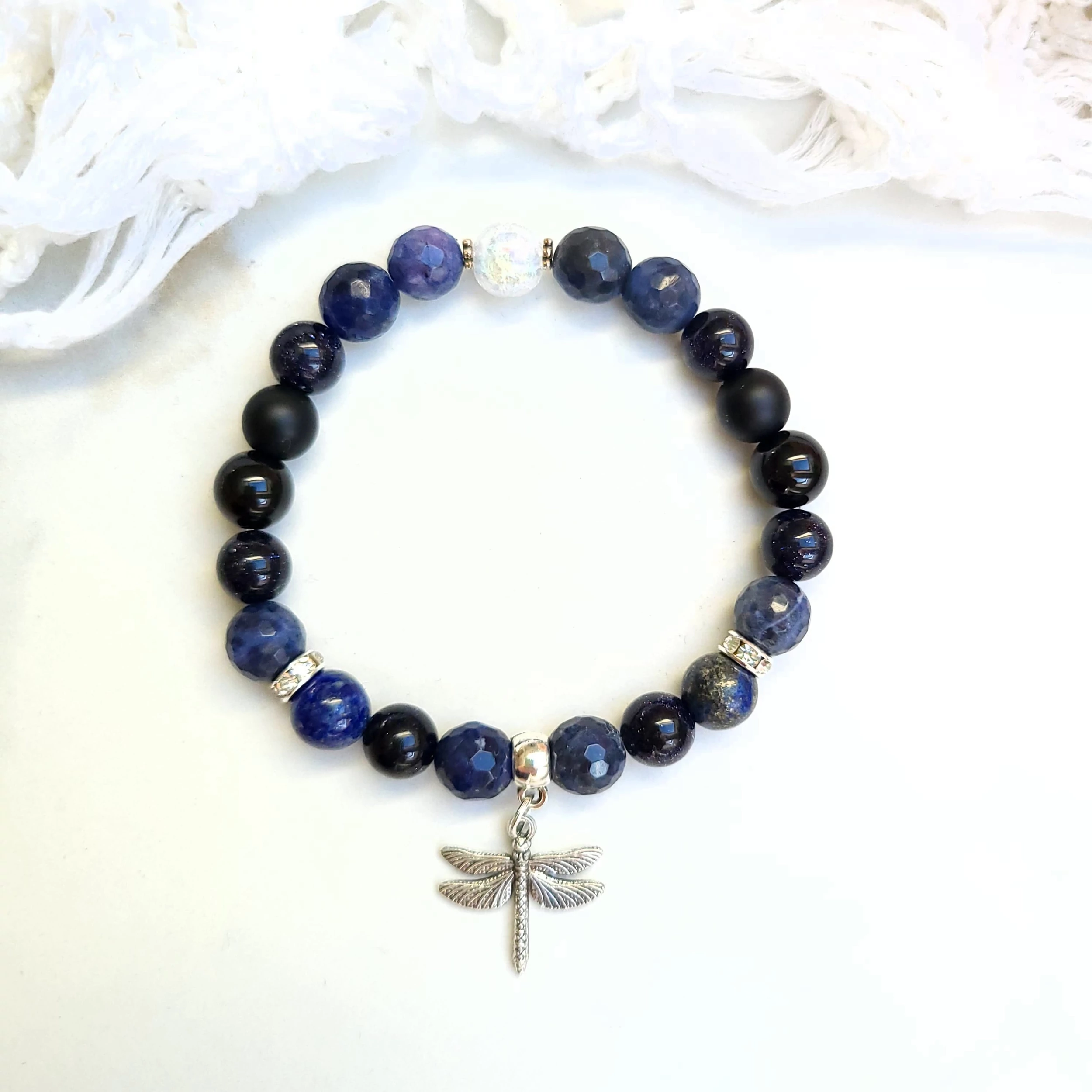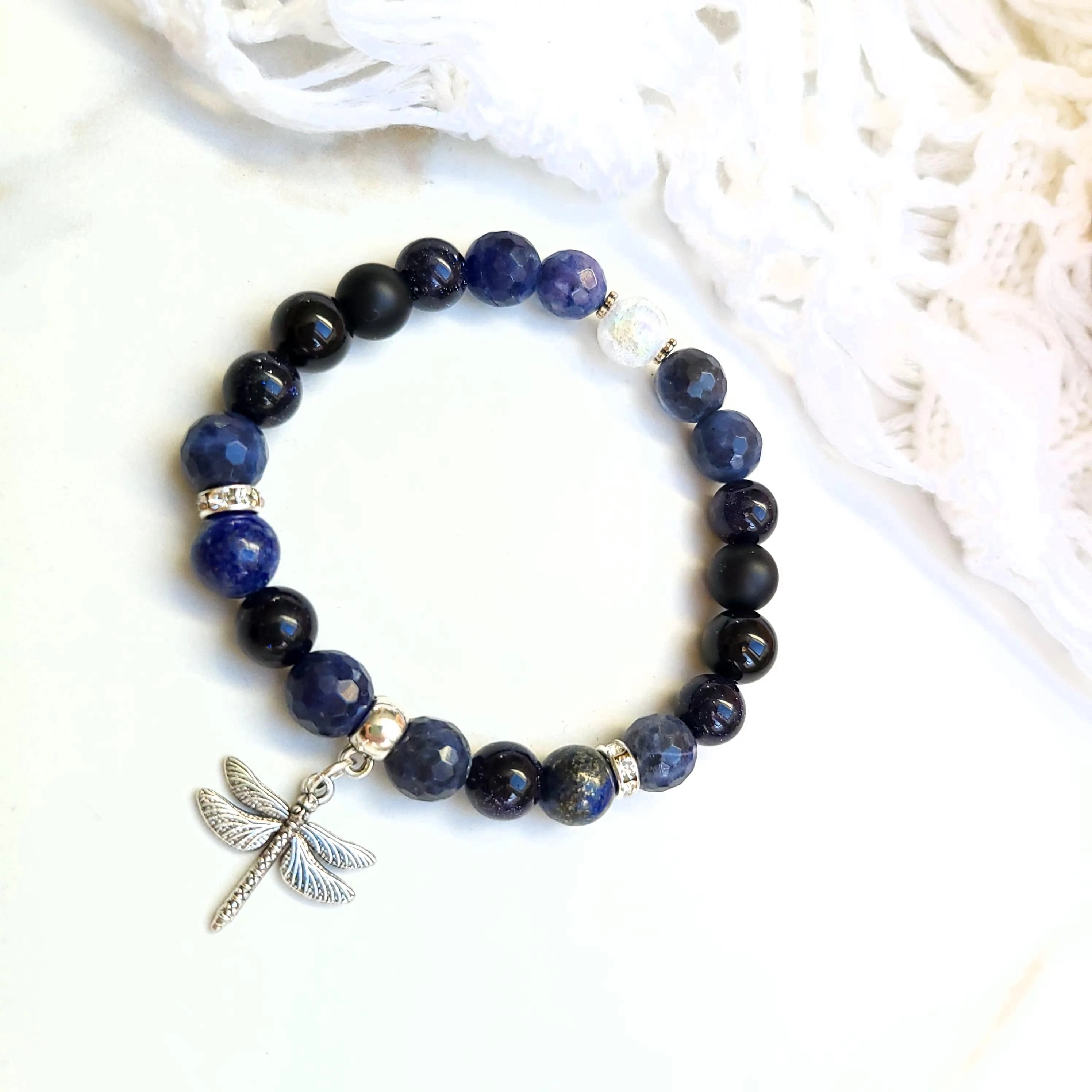 A karkötő egyedi tervezésű, lazurit, ónix és kéknapkő ásványokból készült szitakötő medállal és ezüst díszítéssel.