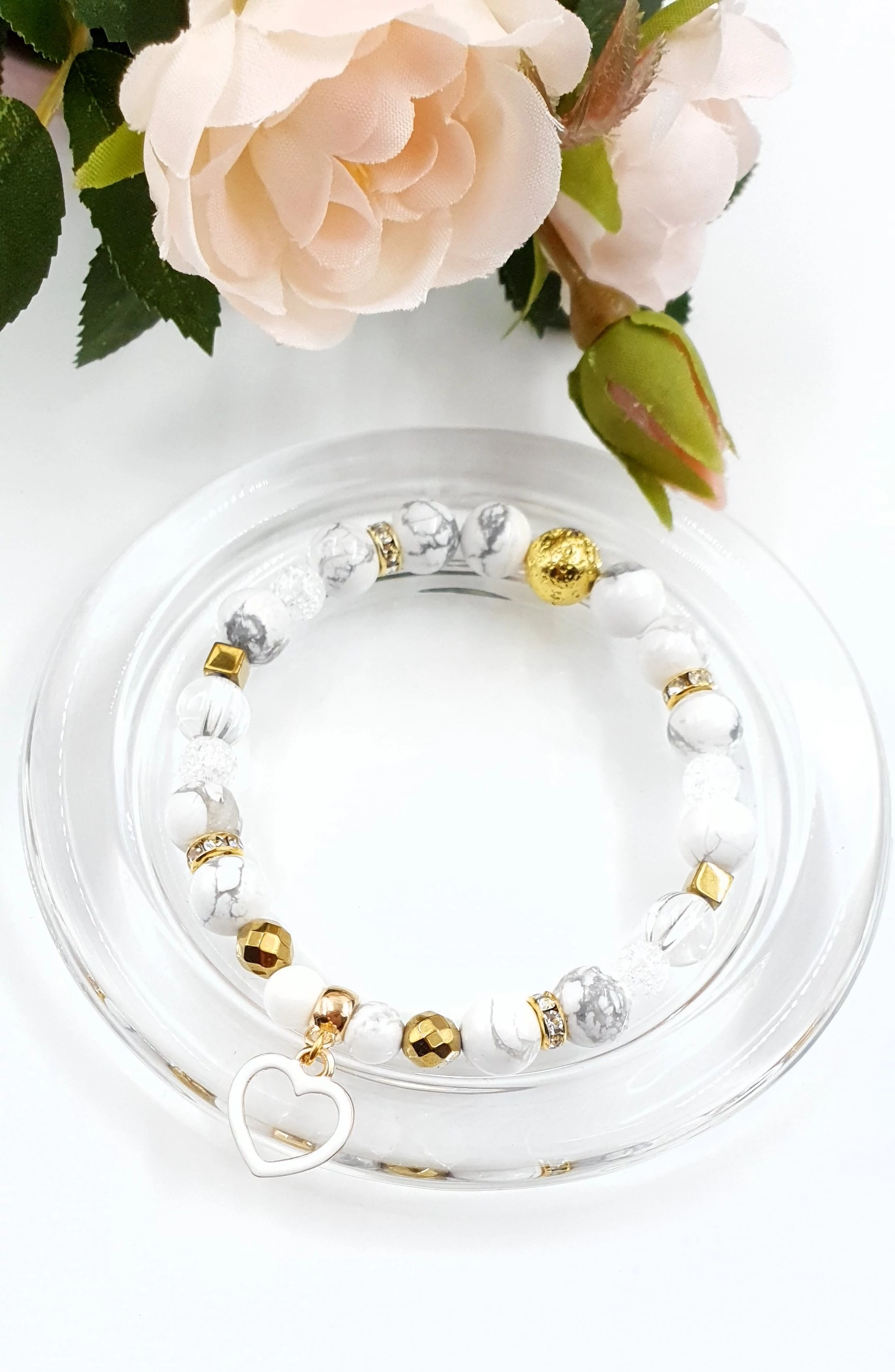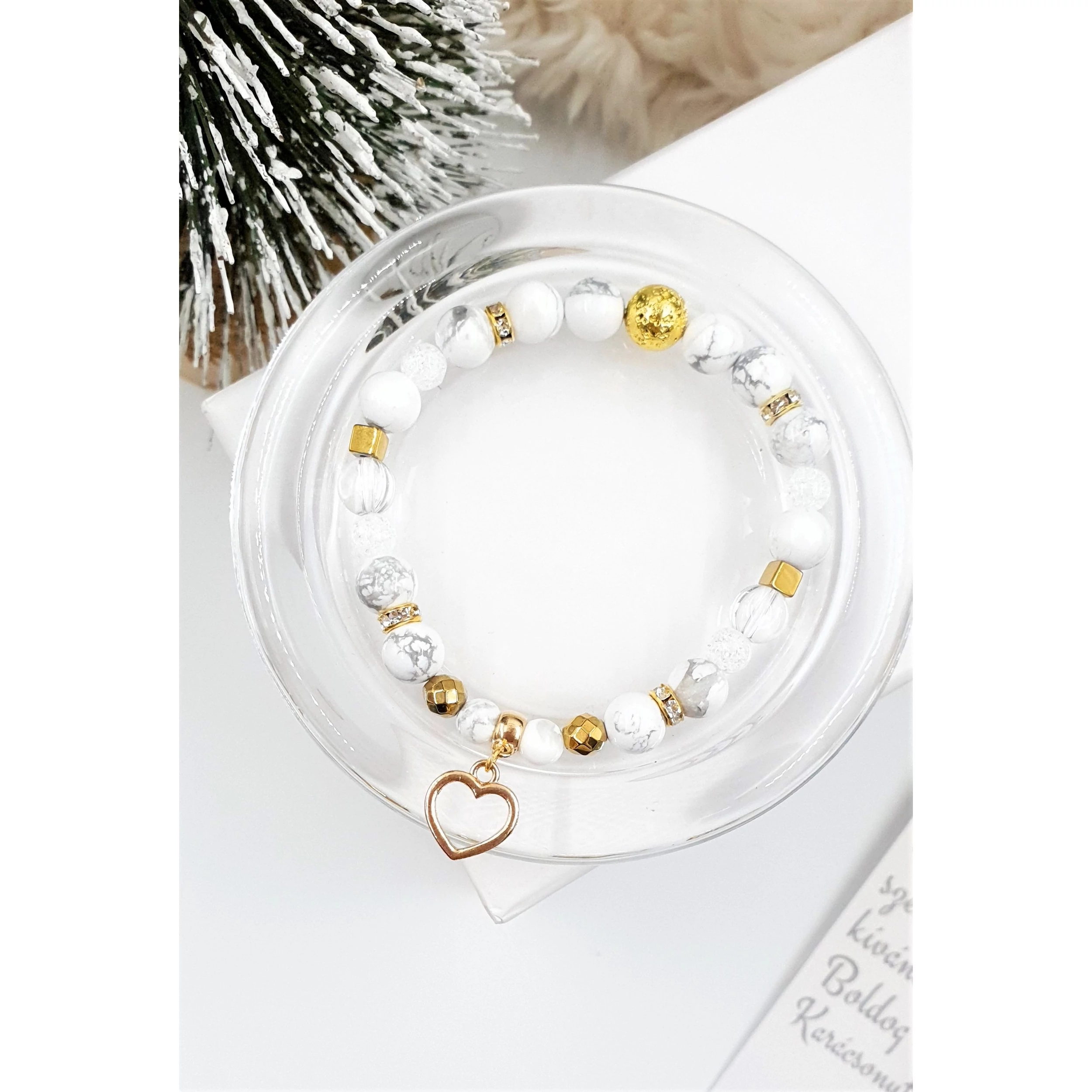Howlit és Hegyikristály ásványokból készült karkötő, arany szín díszítéssel és egy szívecske medállal.