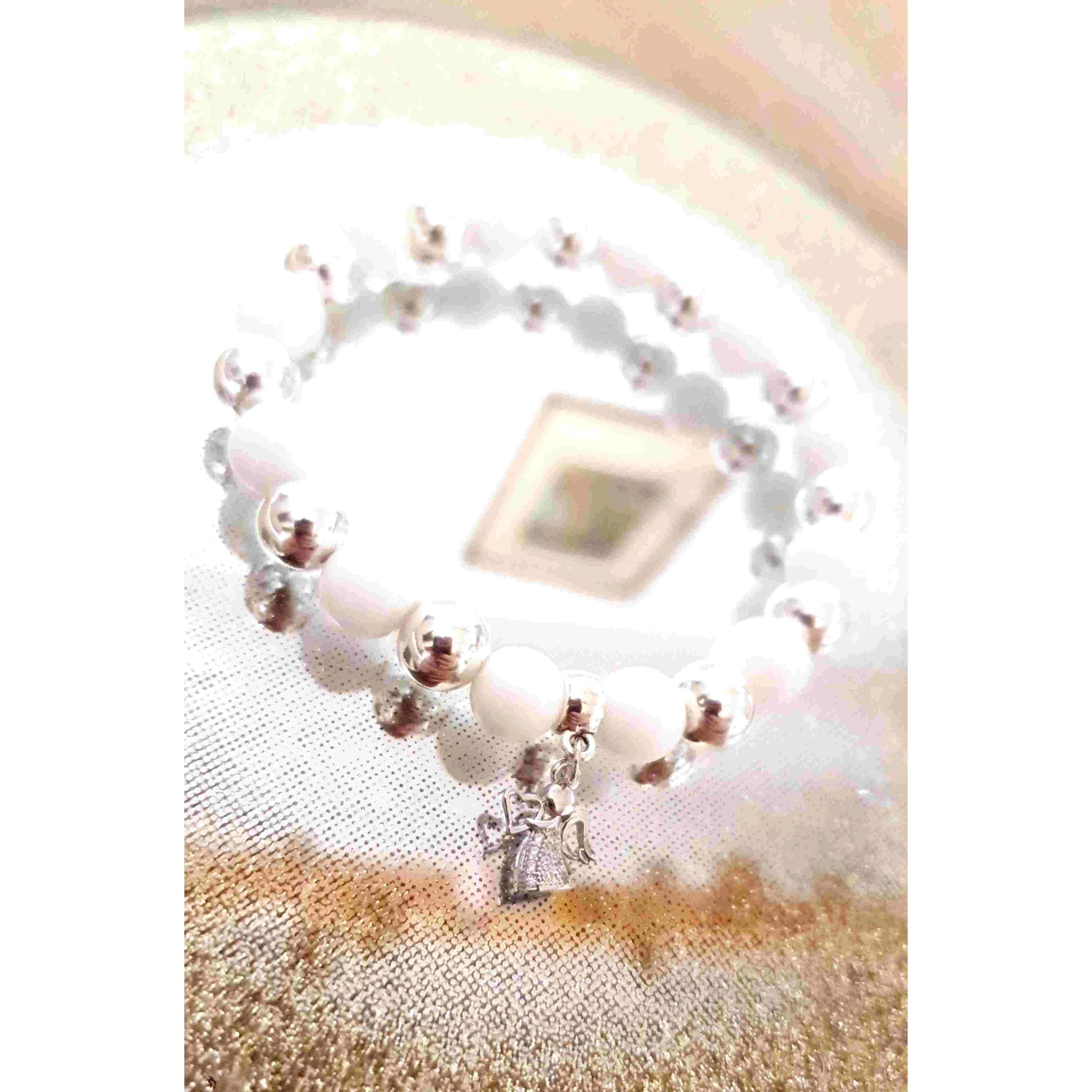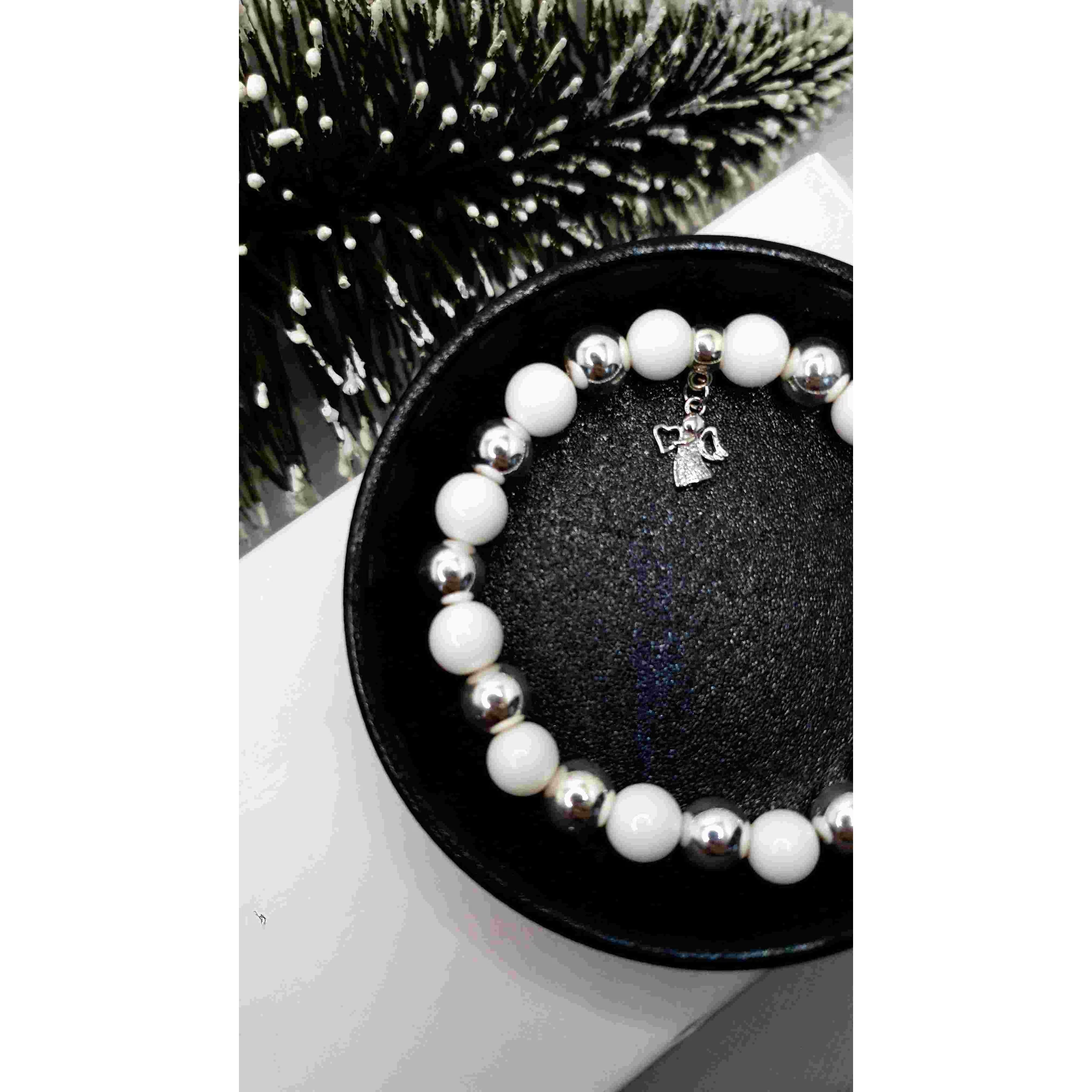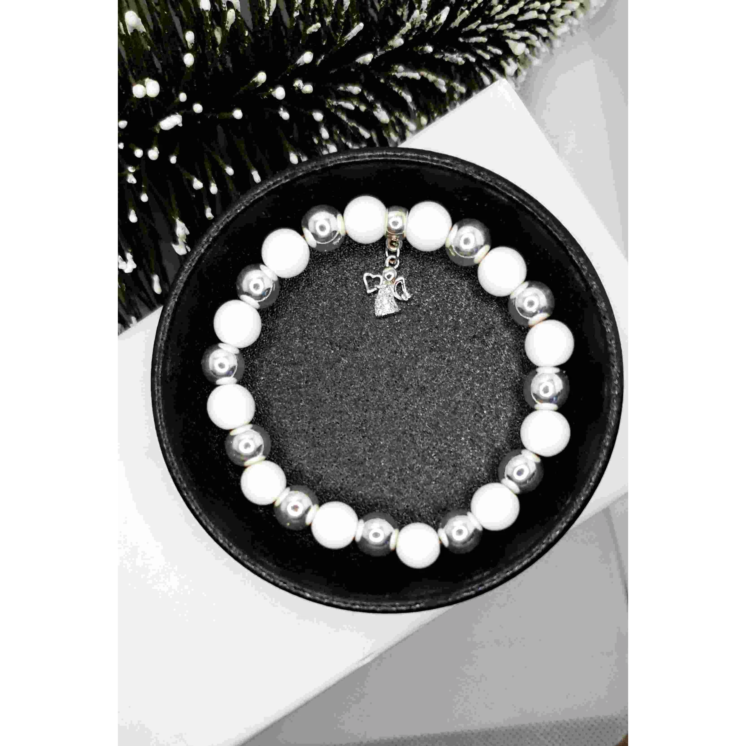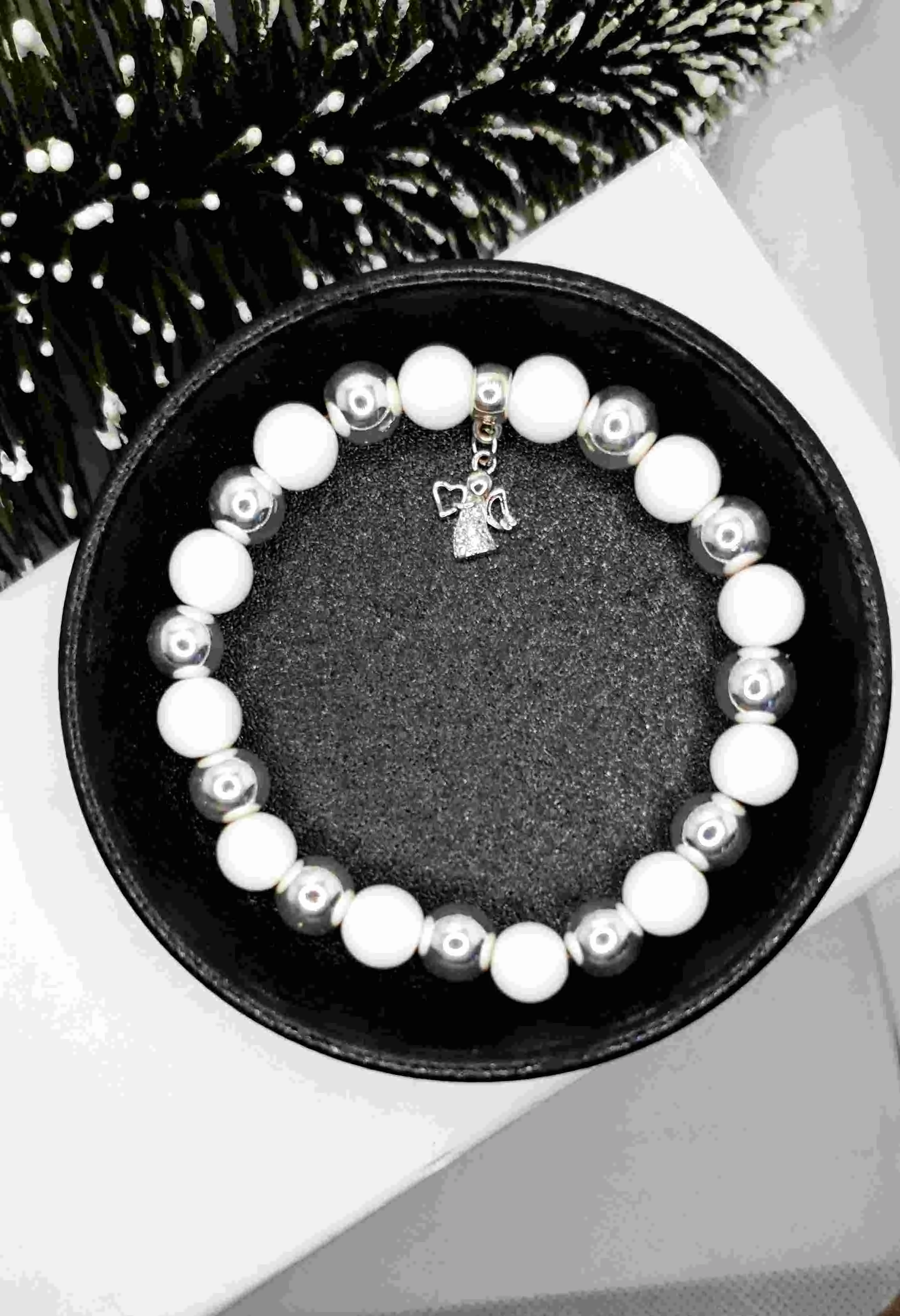 Szivecskés angyal ásványkarkötő hófehér tejkvarc és hematit ásványokból, álomszép csillogó mikrokristályokkal kirakott apró angyal medállal.