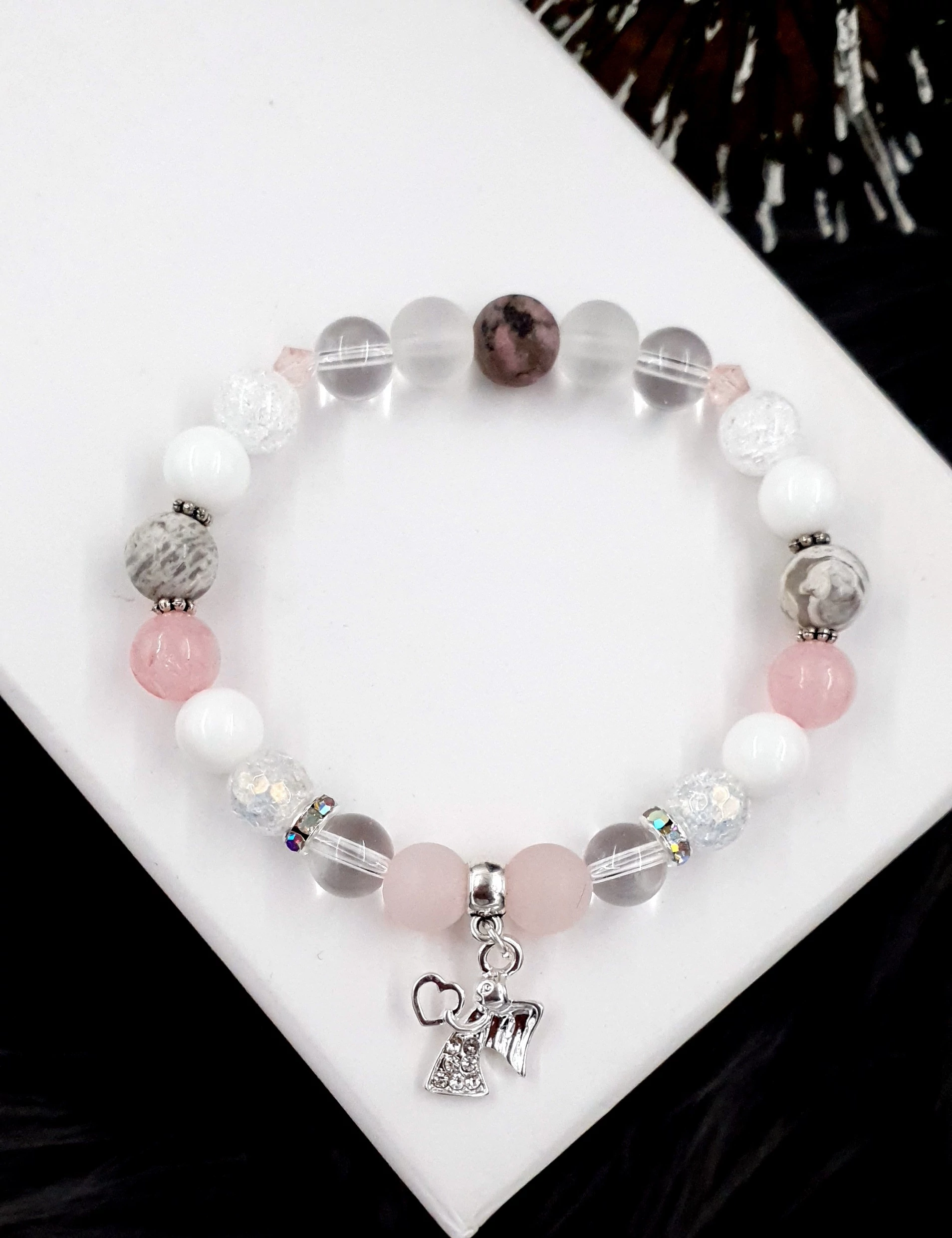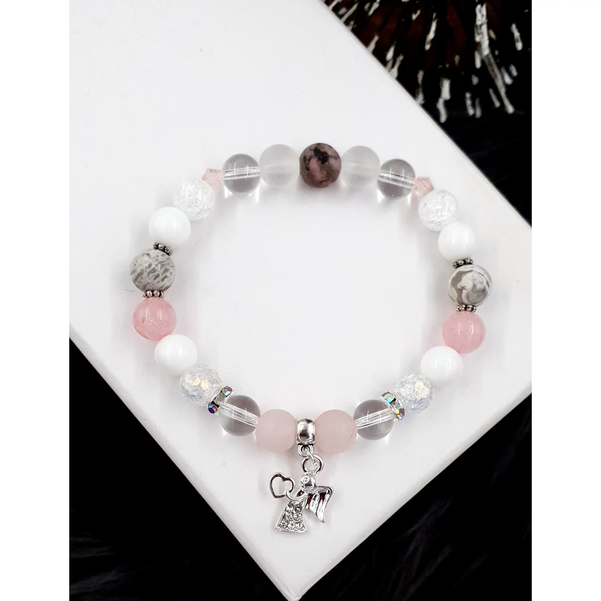 Ez az egyedi karkötő hegyikristályból, matt hegyikristályból, tejkvarcból, matt rózsakvarcból és jáspisból készült, harmonikus összeállításban. A középpontban egy mikrokristályos angyalka medál áll, amely szívecskét tart a kezében, ezzel különleges bájt kölcsönöz az ékszernek. A medál színe igény szerint választható: elérhető arany, ezüst és rosegold változatban. A választott szín nemcsak a medálra, hanem a karkötő díszítő elemeire is vonatkozik, így minden darab tökéletes összhangban készül el.