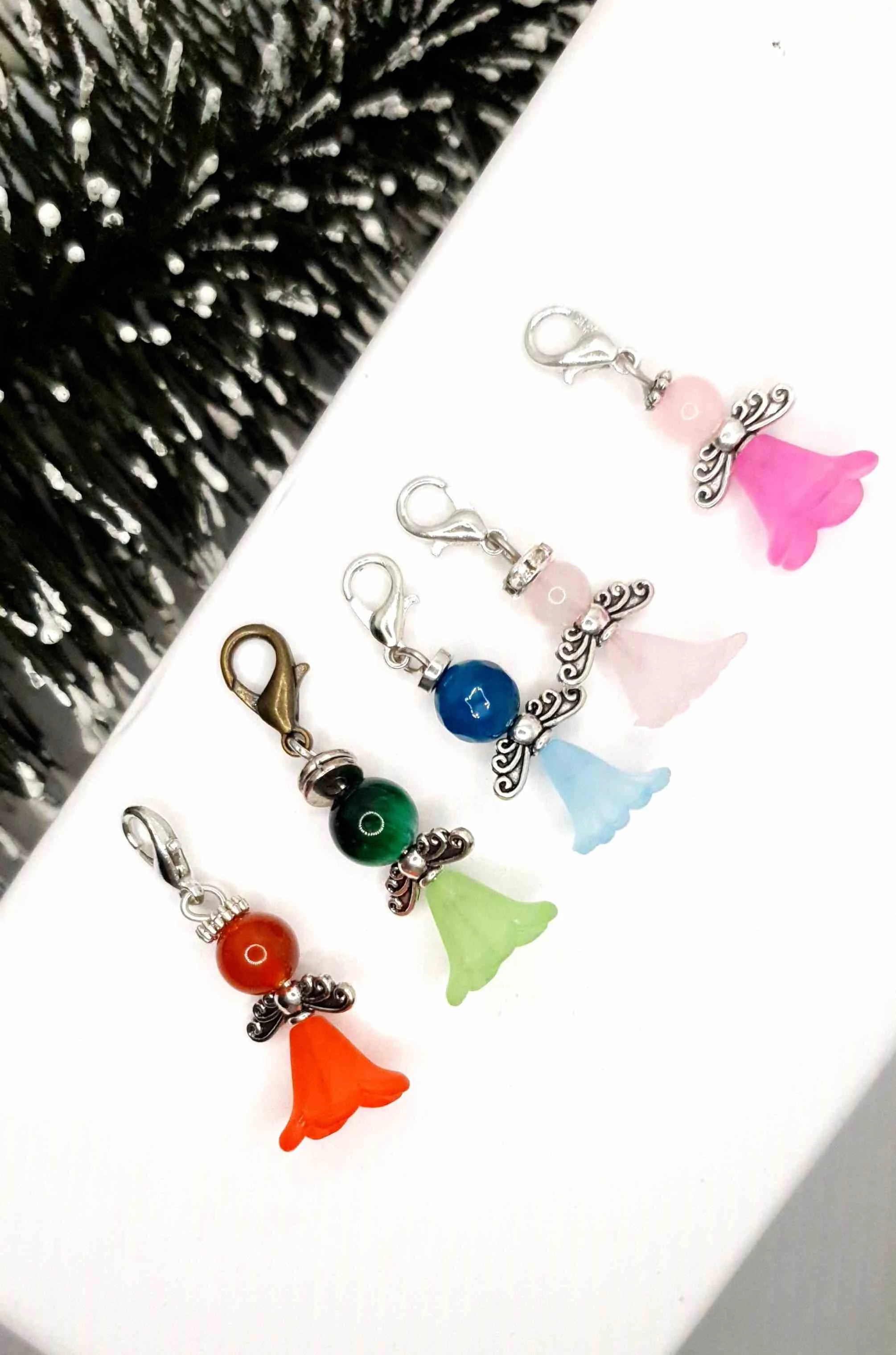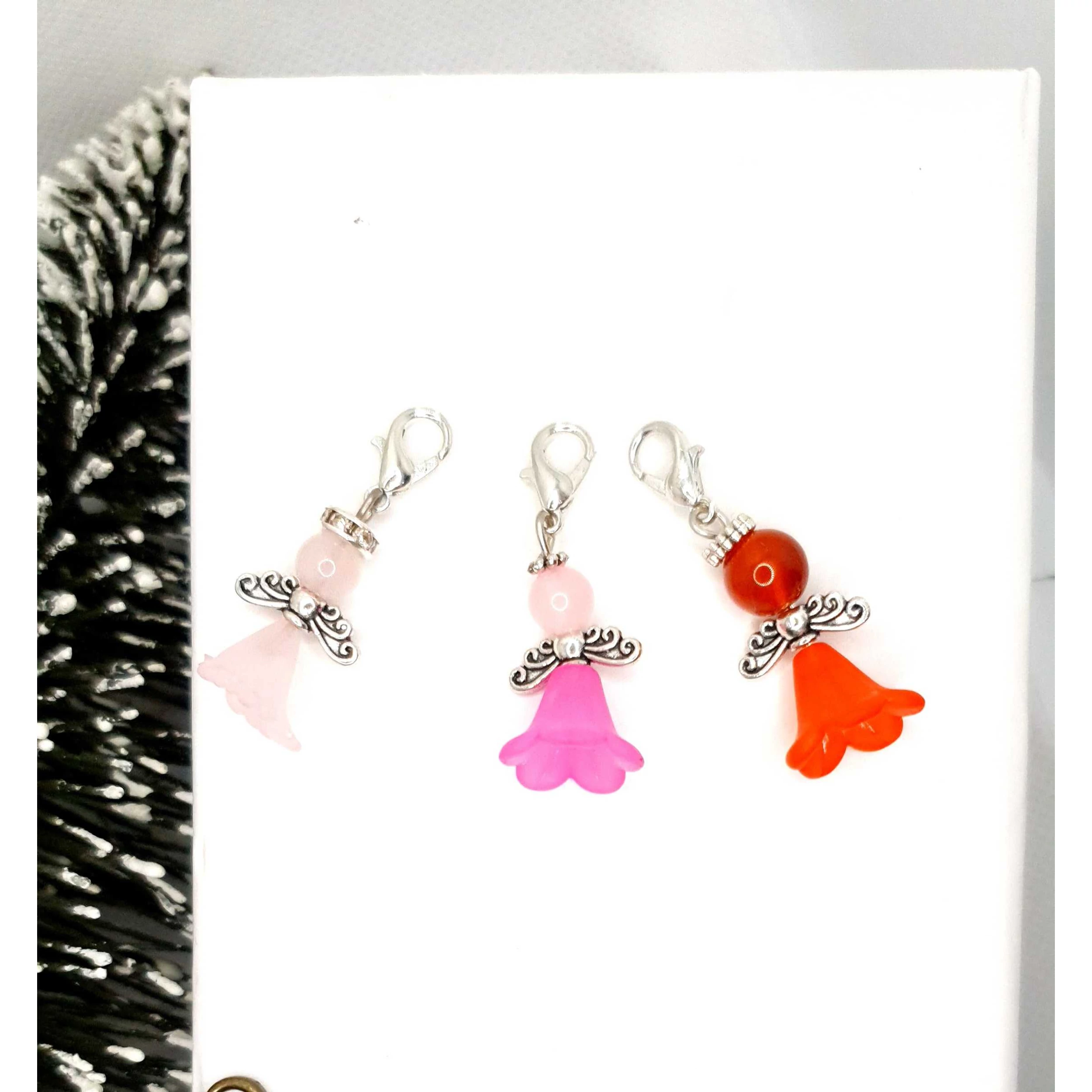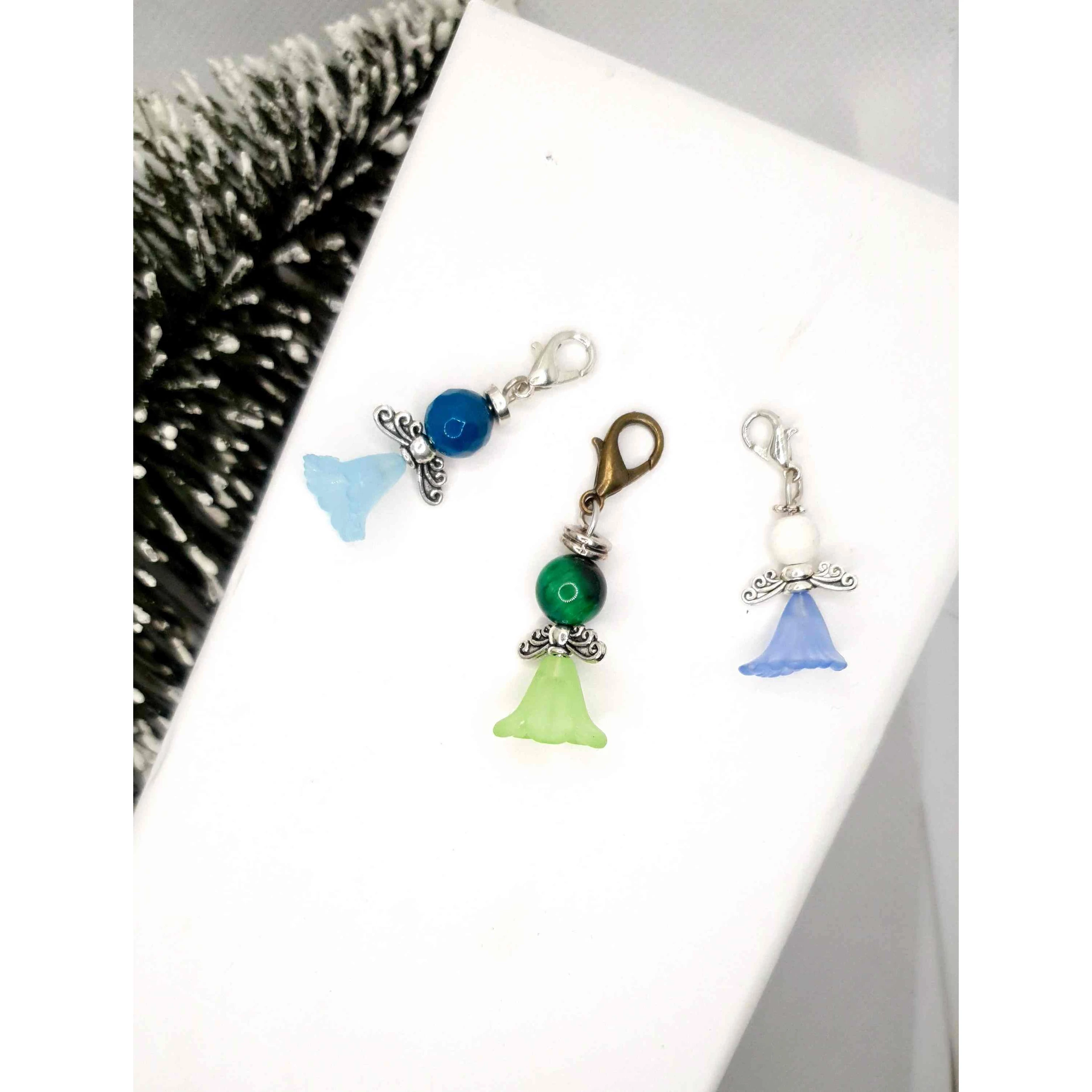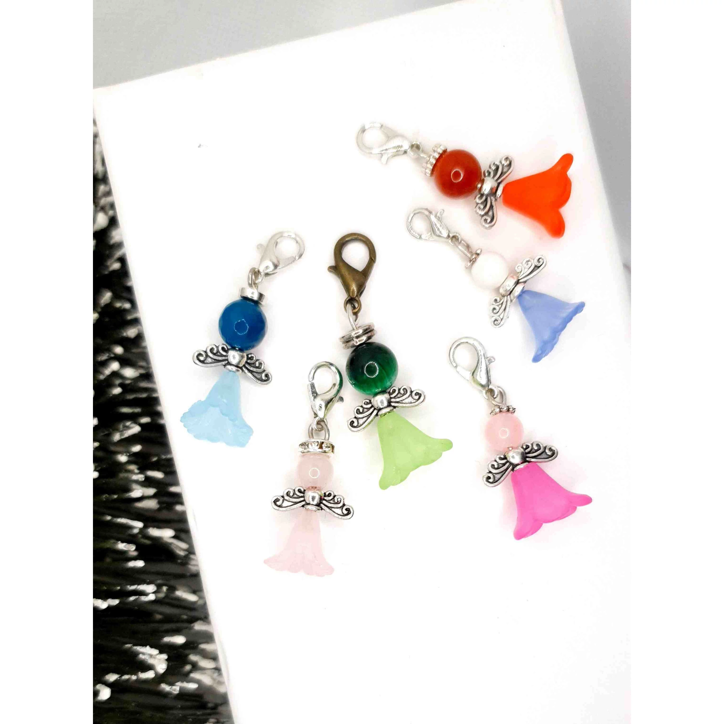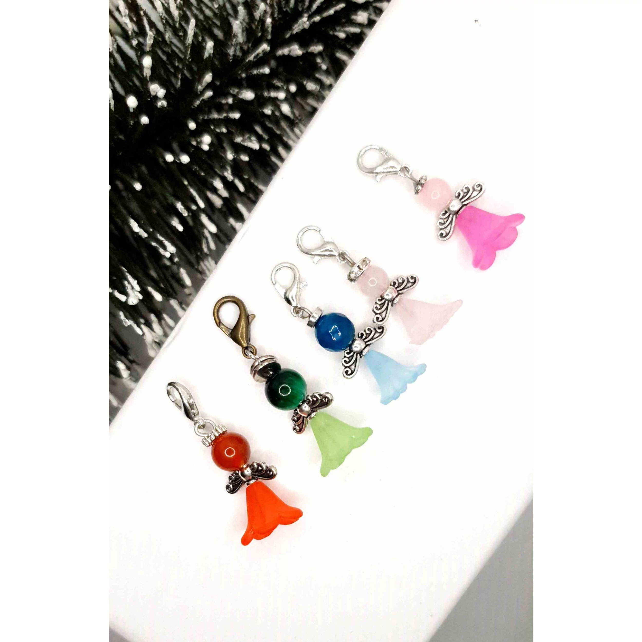 Az angyalka mérete 2,5 cm és különböző ásványokból és kristályokból készültek szoknya díszítéssel, illetve egy kapcsot tartalmaz, mellyel kulcsra, táskára helyezhető.