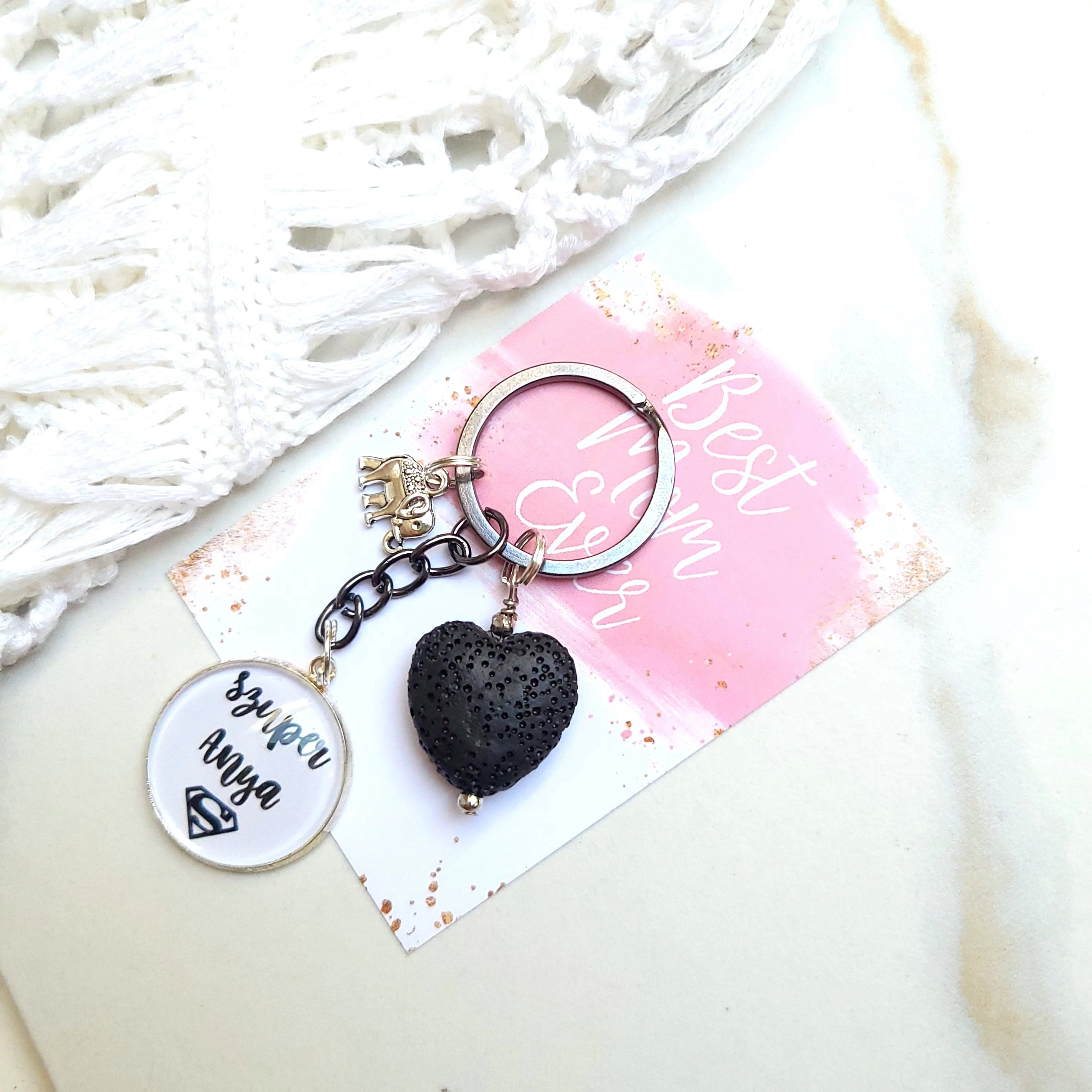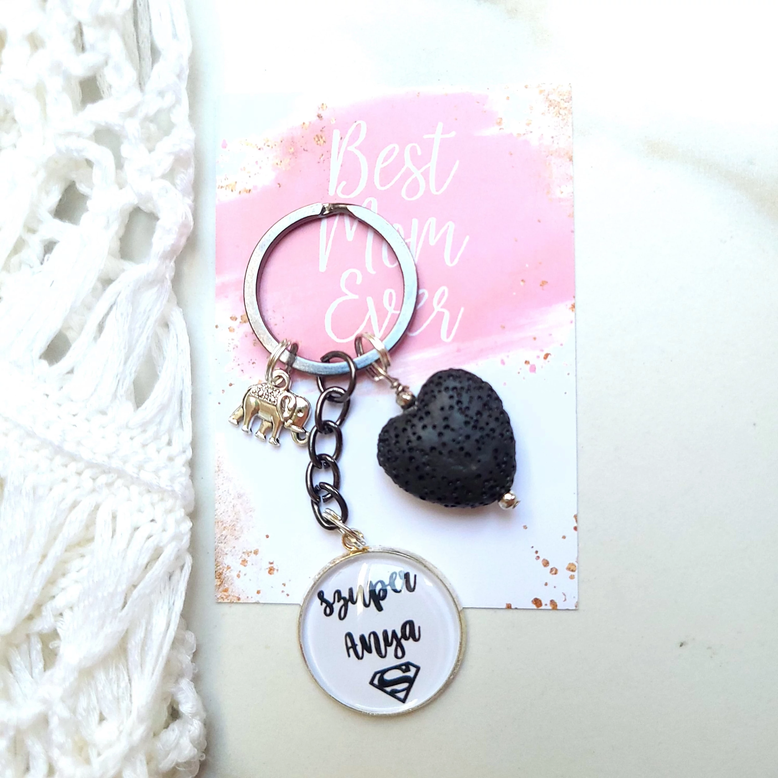 Szuper Anya feliratos üveglencsés kulcstartó üzenetkártyával, lávakő szívvel és szerencsehozó elefánt medállal.