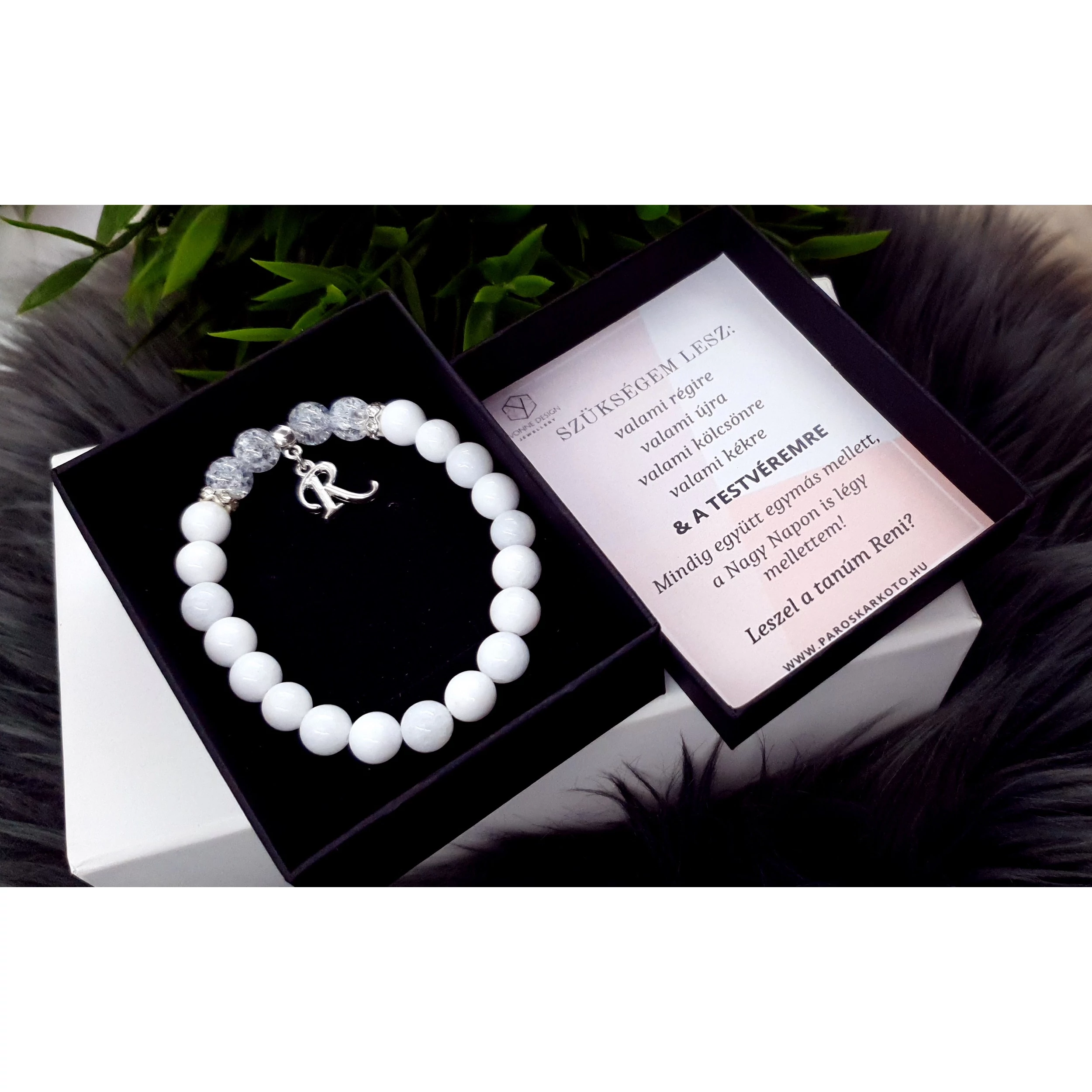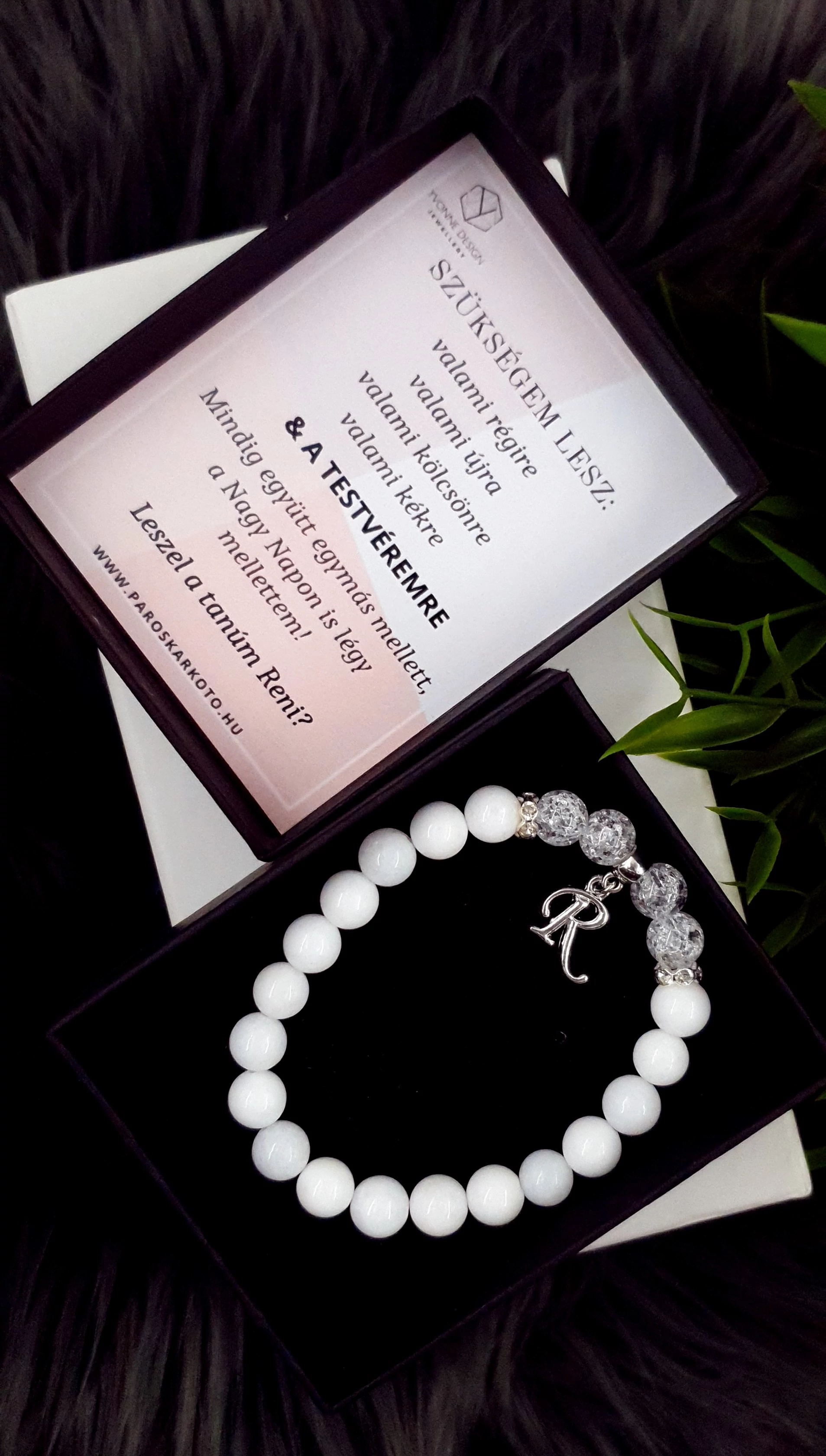 Tanú felkérő ajándék. Ha szeretnéd felejthetetlenné tenni a pillanatot, amikor felkéred az esküvői tanúdat, vagy ha egy igazán szívhez szóló, megható ajándékkal kedveskednél a leendő tanúdnak, tökéletes választás ez a díszdobozos ásványkarkötő egyedi betűvel és személyre szabott üzenettel. A karkötő 8 mm -es tejkvarc ásványokból és roppantott hegyikristály ásványokból készült, és egy betű charmot tartalmaz. Az ajándékszett része a karkötő, a díszdoboz, illetve a doboz belsejében található személyes üzenet, melyet te tudsz nekünk megadni a vásárlási folyamat végén a megjegyzés rovatban. Amennyiben változtatni szeretnél magán az üzeneten, kérlek add meg nekünk, hogy egyértelmű legyen számunkra, mit szeretnél látni a díszdoboz belsejében!
