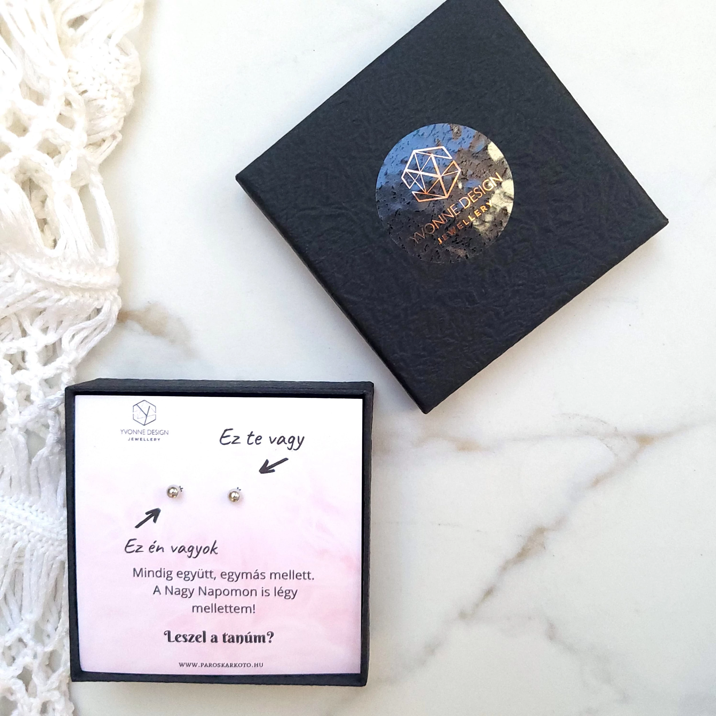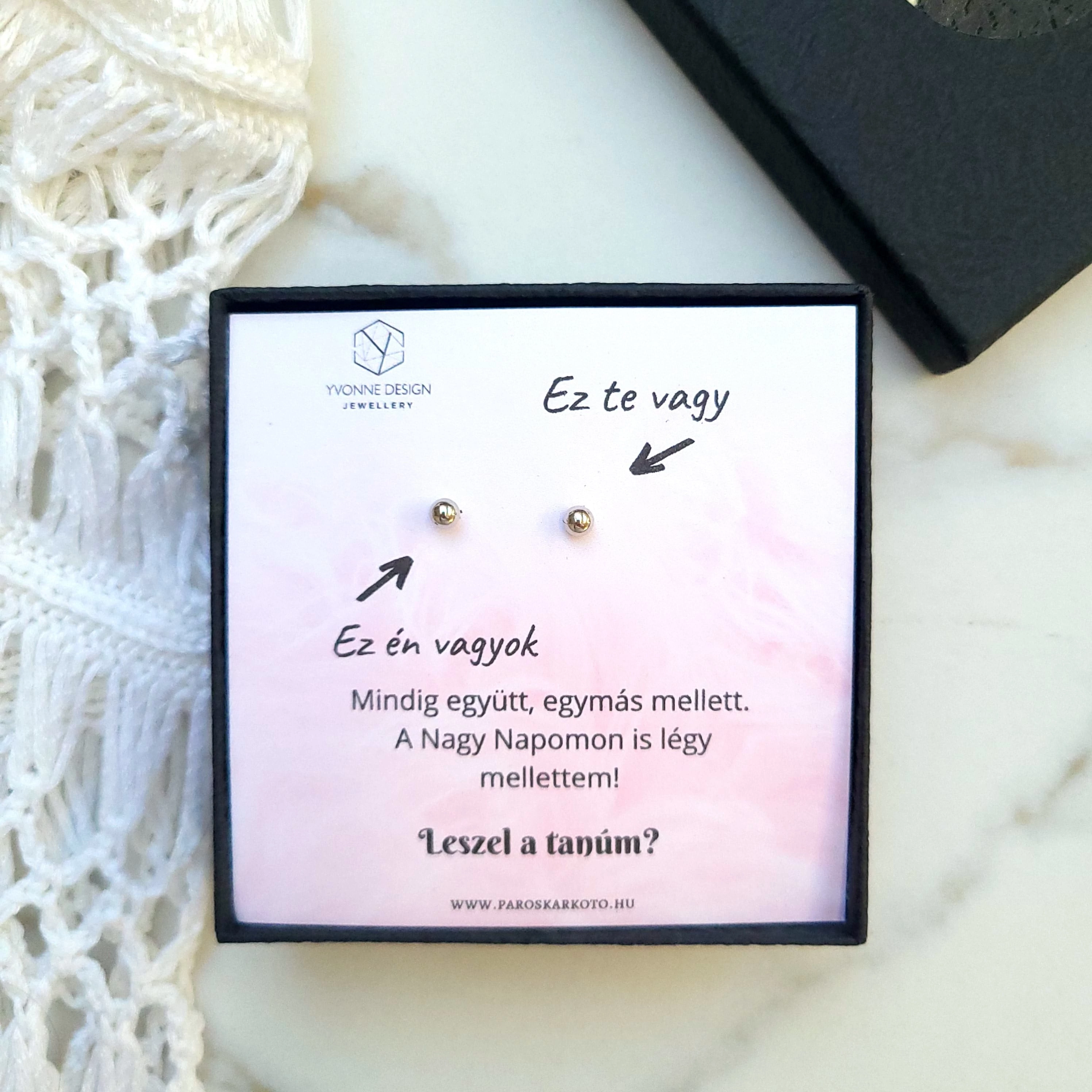 Tanúfelkérő ajándék fülbevaló idézettel, megható ajándékkal kedveskednél leendő tanúdnak esküvőtök alkalmából, tökéletes választás ez a díszdobozos két részes fülbevaló, személyes üzenettel. Az ajándékszett része a pár fülbevaló, a díszdoboz, illetve a doboz belsejében található személyes üzenet és egy tüll tasak.