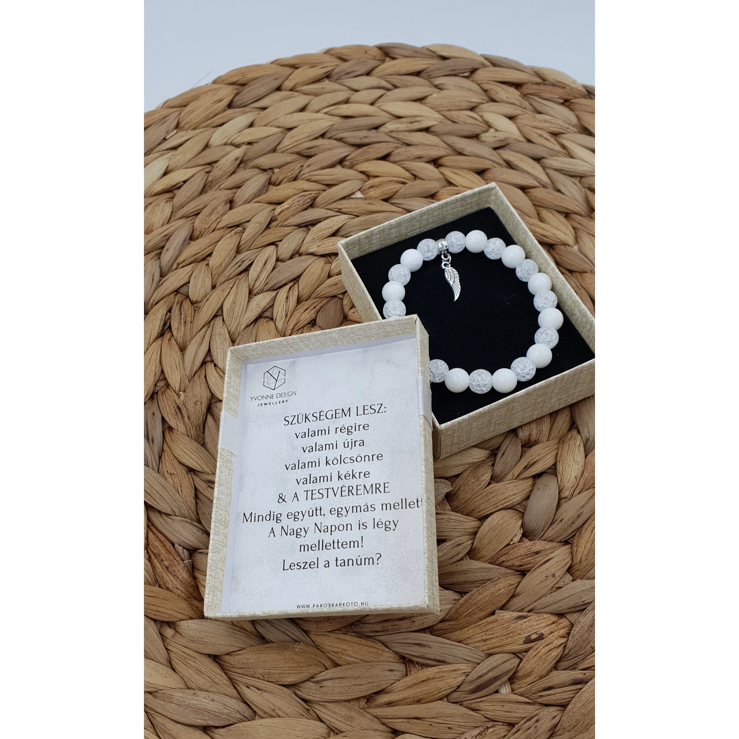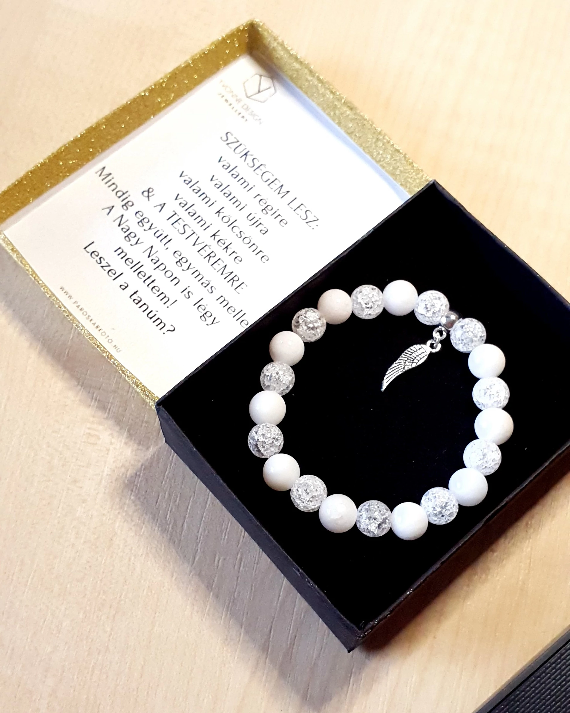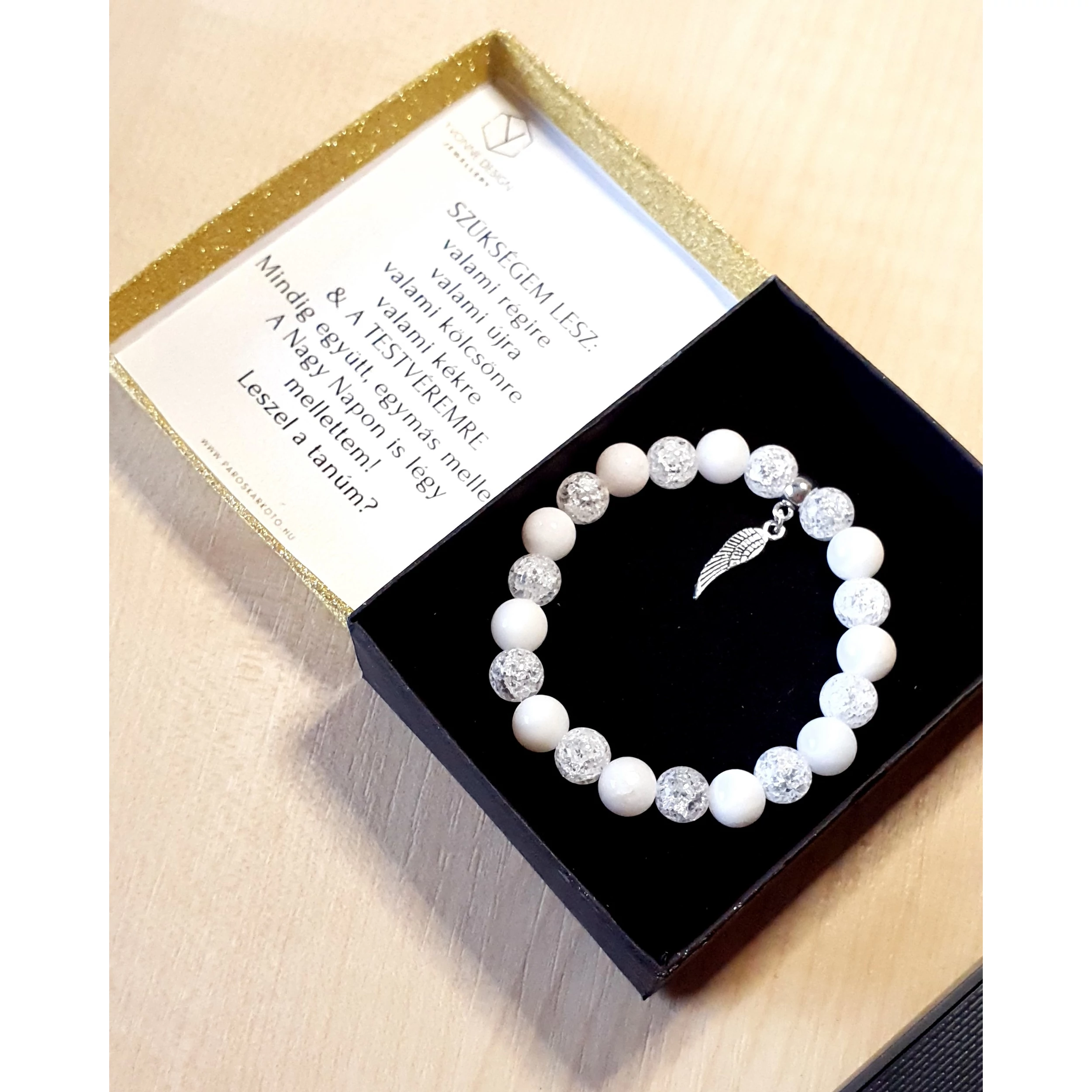 Tanúfelkérő ajándék. Ha szeretnéd felejthetetlenné tenni a pillanatot, amikor felkéred az esküvői tanúdat, vagy ha egy igazán szívhez szóló, megható ajándékkal kedveskednél a leendő tanúdnak, tökéletes választás ez a díszdobozos  ásványkarkötő egyedi betűvel és  személyre szabott üzenettel. A karkötő 8 mm -es roppantott hegyikristály és hófehér tejkvarc  ásványokból készült, és egy angyalszárny charmot tartalmaz. Az ajándékszett része a karkötő, a díszdoboz, illetve a doboz belsejében található személyes üzenet, melyet te tudsz nekünk megadni a vásárlási folyamat végén a megjegyzés rovatban.Amennyiben változtatnál az üzeneten,  kérlek vagy idézőjelben, vagy nyomtatott nagy betűkkel kiemelve add meg nekünk, hogy egyértelmű legyen számunkra, mit szeretnél látni a díszdoboz belsejében!